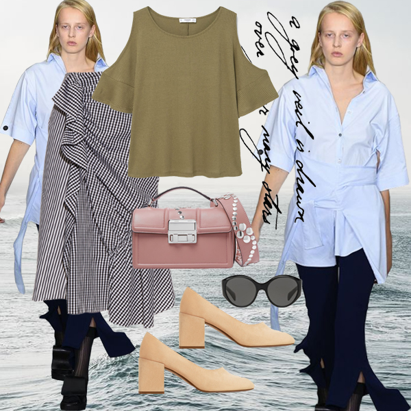 Denim σαλοπέτα Stella McCartney, LUISA. Πουκάμισο Ellery, NET-A-PORTER.COM. Τσάντα ώμου 3.1 Phillip Lim, SSENSE.COM. Δετά παπούτσια ZARA. Γυαλιά ηλίου Oliver Peoples, LUXOTTICA HELLAS.