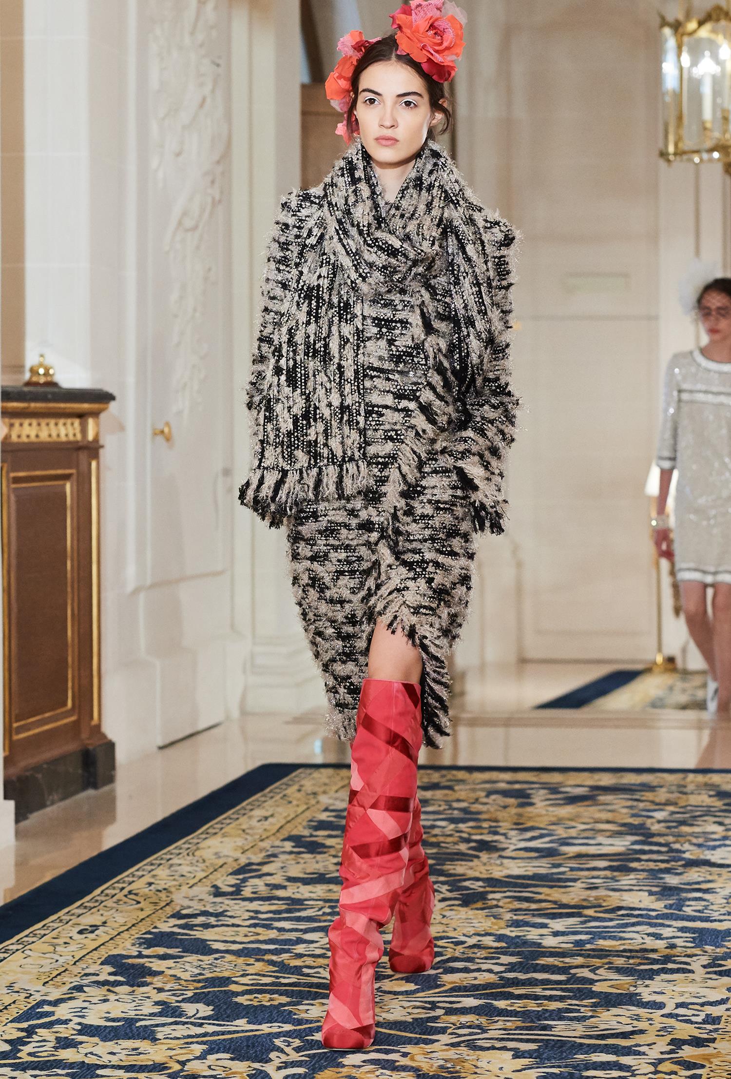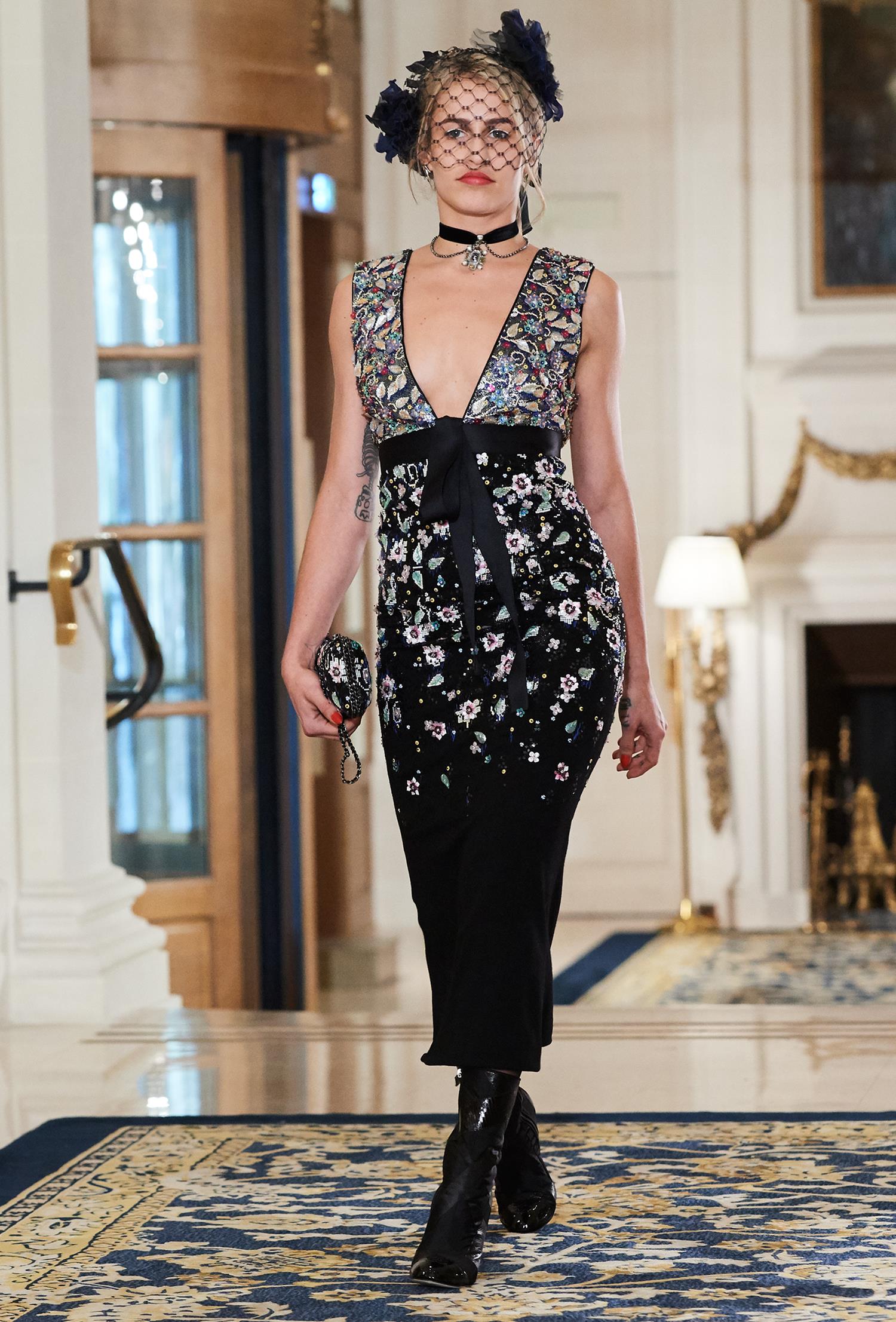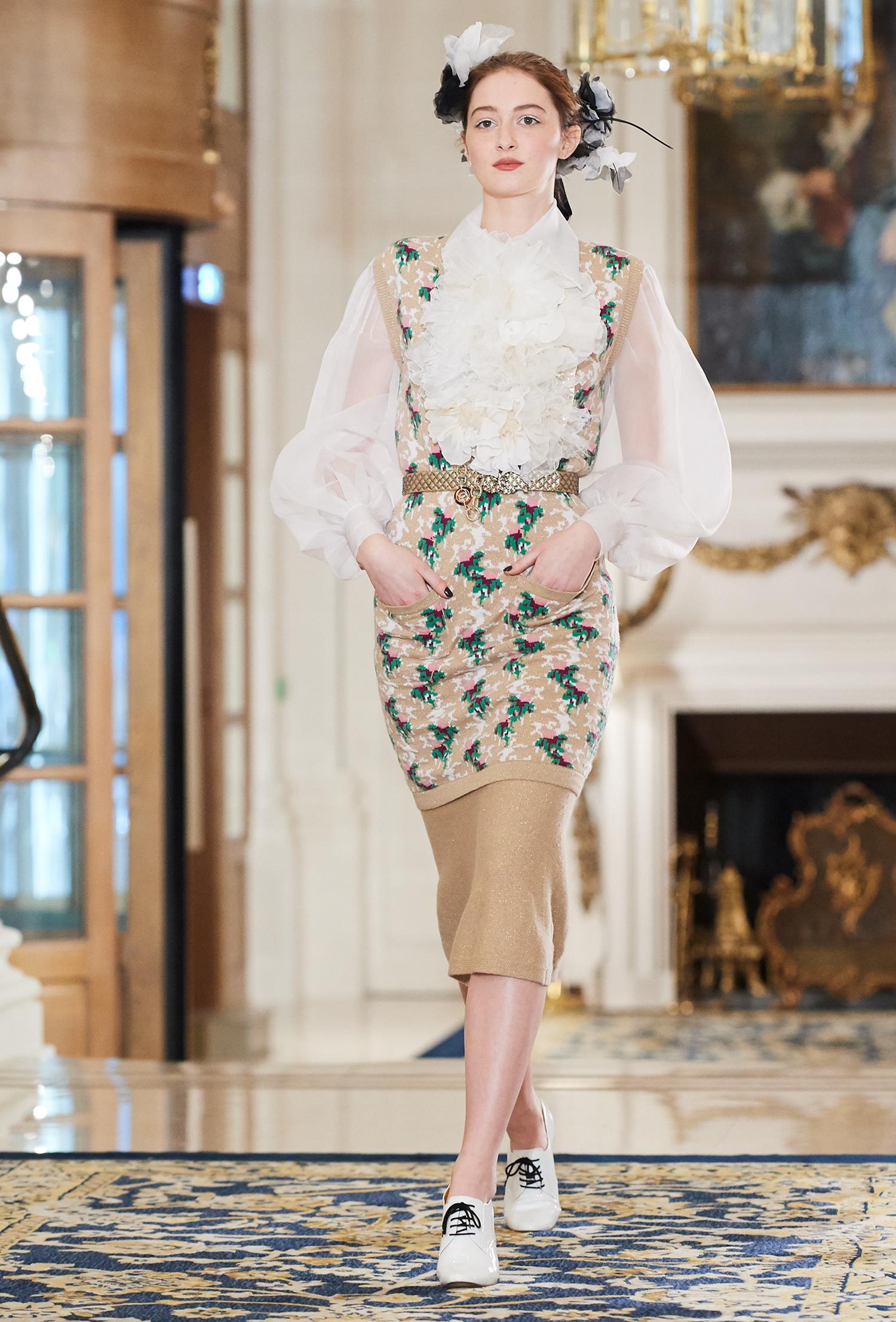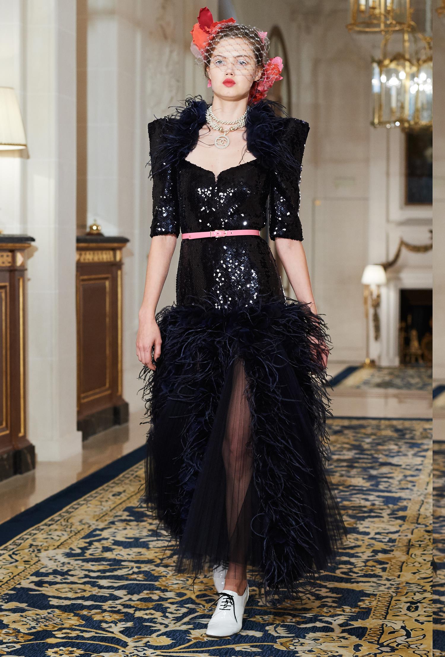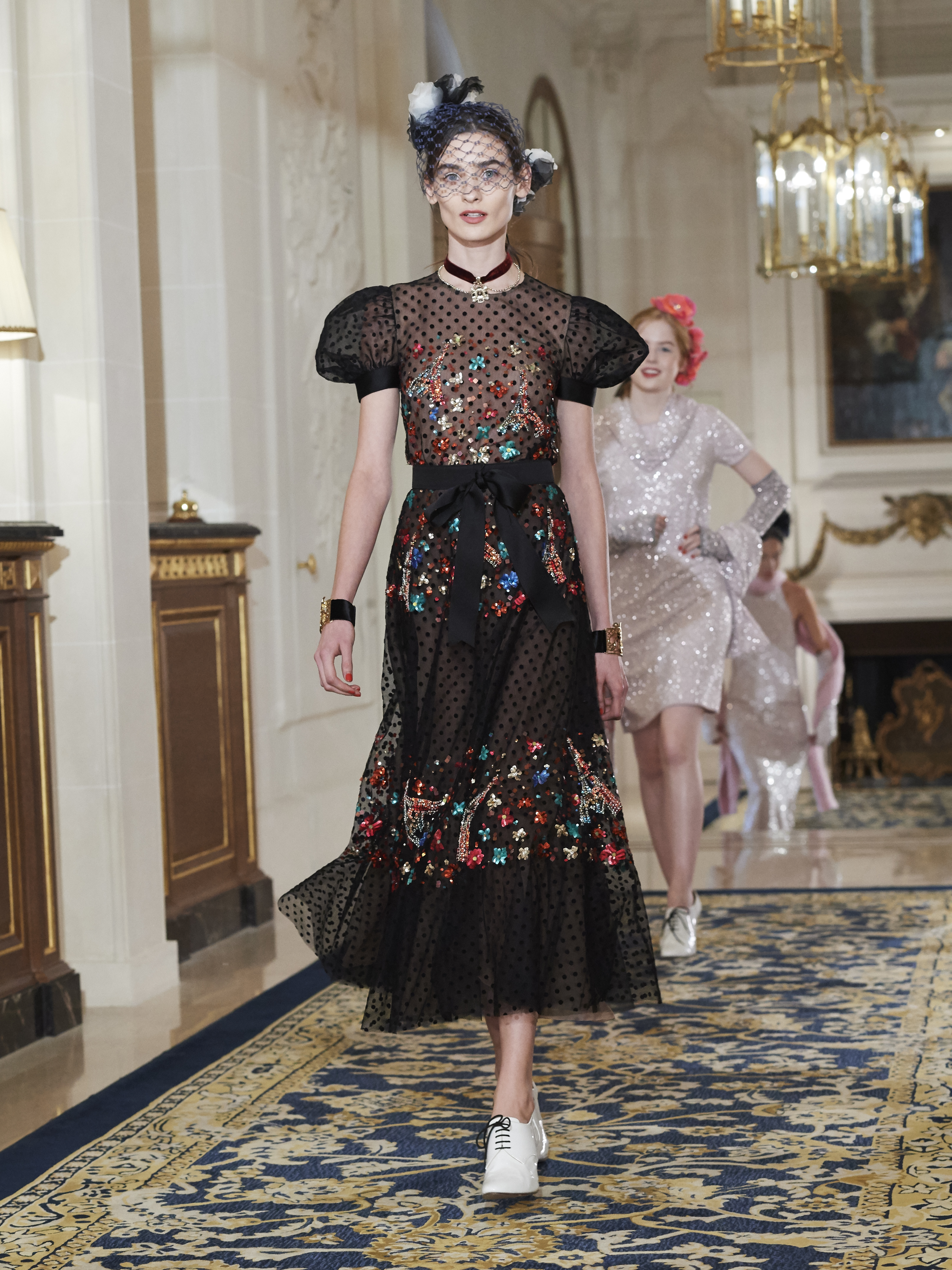 Με αέρα από "Café Society", αγαπημένες μούσες του οίκου όπως η Cara Delevingne, η Georgia May Jagger αλλά και η Lily Rose Depp περπάτησαν φορώντας καπέλα με βέλο, στεφάνια με τριαντάφυλλα, brogues και suede thigh boots. Εμπνευσμένη από τις πιο κομψές γυναίκες του Παρισιού, και τα άψογης αισθητικής σύνολα που φορούσαν για να δειπνήσουν στο Ritz, η νέα συλλογή αποτελεί μια ωδή στη γυναικεία σιλουέτα τονίζοντας τη μέση και τους ώμους. Η παλέτα δεν φεύγει μακριά από τα αγαπημένα χρώματα του οίκου με το μαύρο, το κρεμ, το μπλε αλλά και το κόκκινο και το χρυσό να κυριαρχούν. Έμφαση δίνεται στις φίνες υφές με το τουίντ, το βελούδο, το lurex και το δέρμα να συνδυάζονται με πέτρες, παγιέτες, κεντήματα και φτερά στρουθοκαμήλου.
