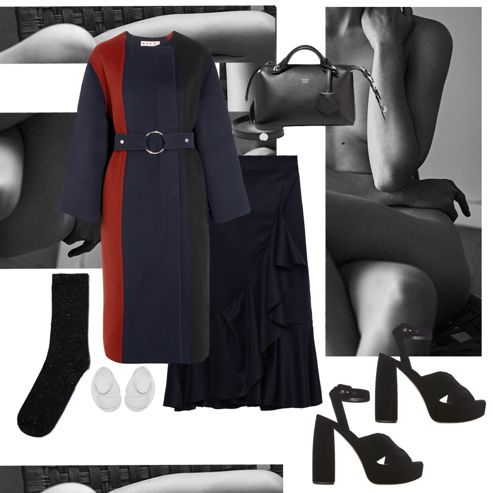 Παλτό Marni, NET-A-PORTER.COM. Φούστα ZARA. Τσάντα Fendi, FENDI BOUTIQUE. Ψηλοτάκουνα πέδιλα Miu Miu, MATCHESFASHION.COM. Σκουλαρίκια Charlotte Chesnais, MATCHESFASHION.COM. Κάλτσες OYSHO.