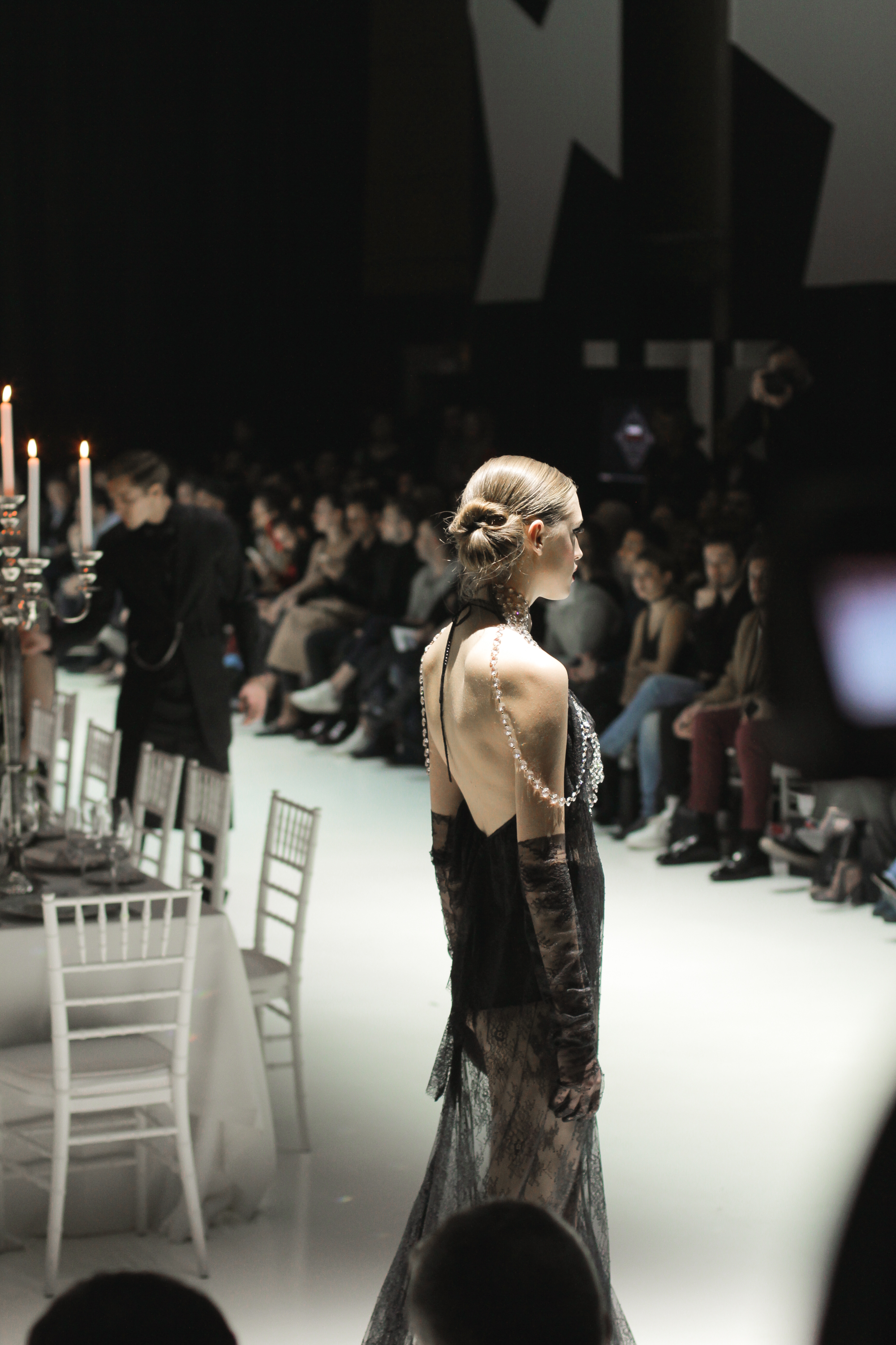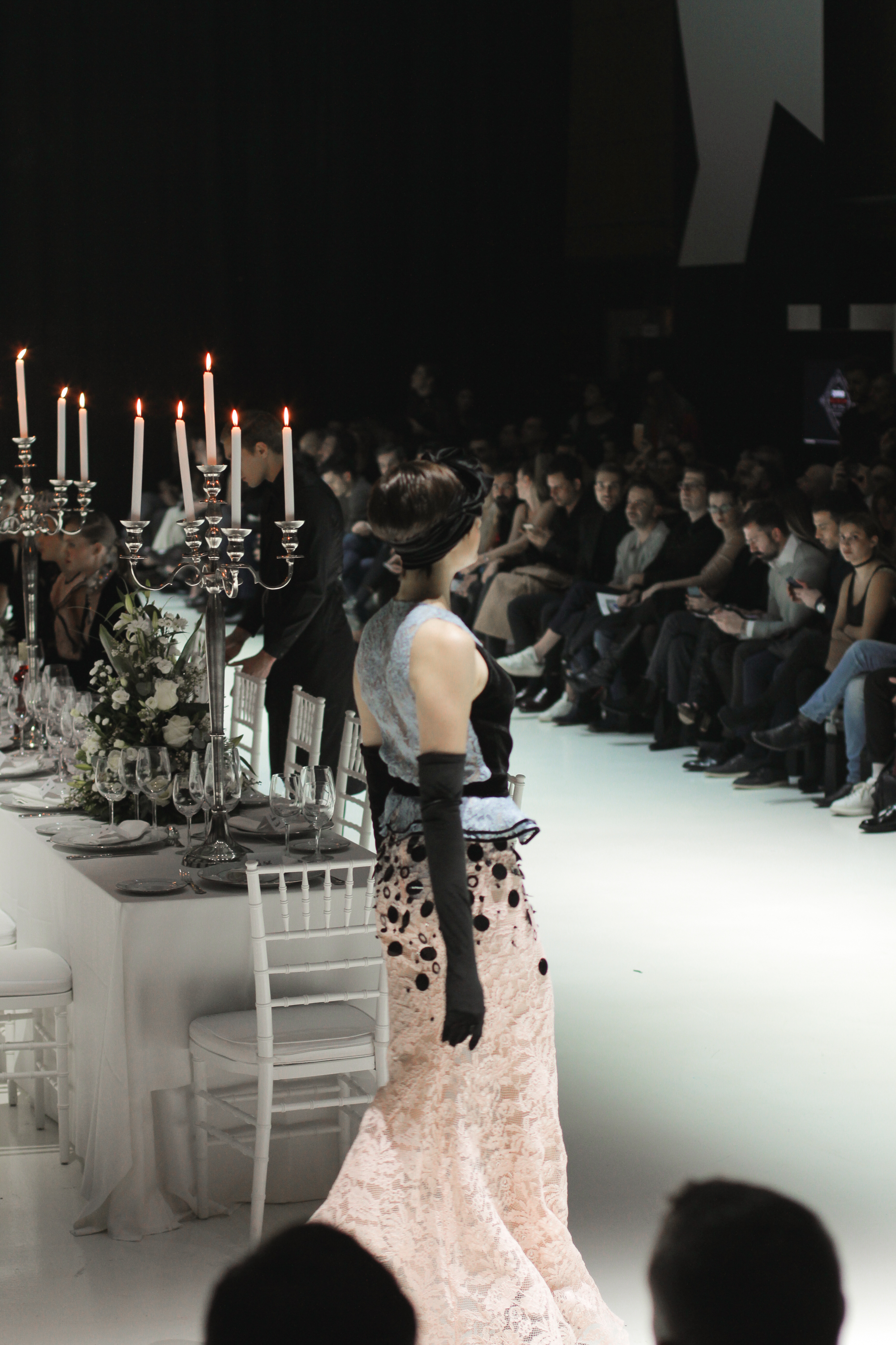 Όσο κι αν η ατμόσφαιρα μας προϊδέαζε με το που φτάσαμε στο παλαιό Λιθογραφείο της καπνοβιομηχανίας, σε ένα στενάκι πάνω από το λιμάνι, γεμάτο βιομηχανικά  κτίρια που έδειχναν ή ήταν εγκαταλελειμμένα, συνεργεία και παλιά, χαμηλά σπίτια με τη φθορά του χρόνου εμφανή πάνω τους, δεν ήμασταν έτοιμοι γι' αυτό που θα εκτυλισσόταν σε λίγη ώρα μπροστά στα μάτια μας. Μπαίνοντας στον χώρο συνηθίσαμε εύκολα την βαθιά πορτοκαλί απόχρωση του φωτισμού και ξεχωρίσαμε κατευθείαν το τεράστιο, στρωμένο τραπέζι με τα κηροπήγια- μανουάλια, που δέσποζε στην μέση της αίθουσας. Κι αν, όλες αυτές οι λεπτομέρειες δεν φαίνονται σημαντικές, νιώθω την ανάγκη να αναφέρω ότι, στην Αθήνα του 2016 –και δη στον χώρο της μόδας- μία παραγωγή τόσο καλά στημένη δεν μπορεί παρά να σε προϊδεάσει ότι κάτι σημαντικό θα συμβεί.