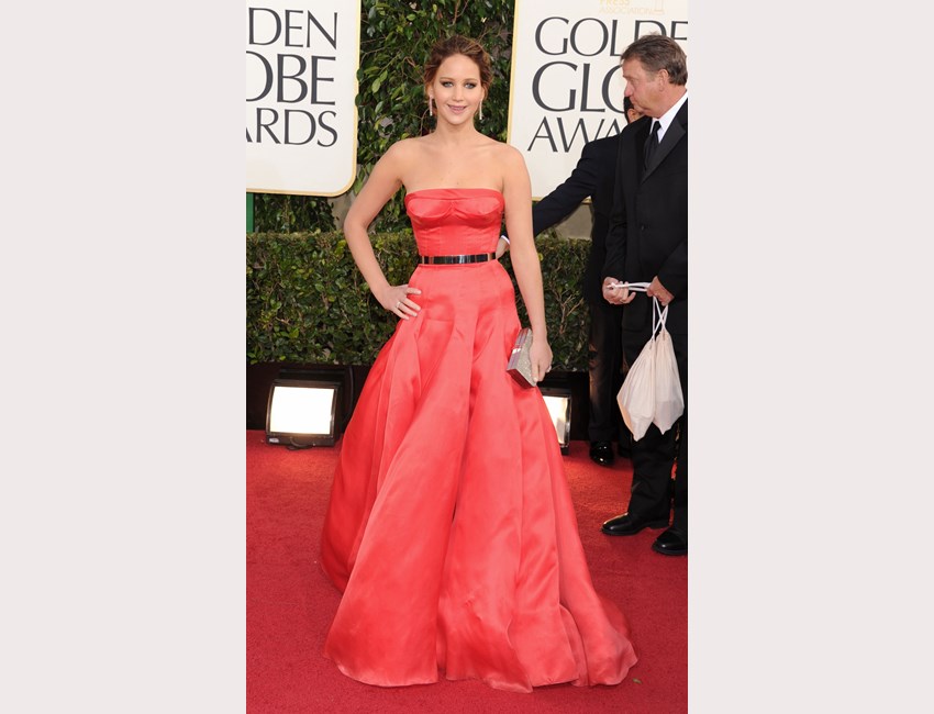 Το 2013 η Jennifer Lawrence επέλεξε ένα κόκκινο Dior. Η φαρδιά maximal φούστα του παραπέμπει σε classic Hollywood αλλά η μαύρη δερμάτινη ζώνη προσθέτει ένα edgy στοιχείο φέρνοντας το φόρεμα στο παρόν.