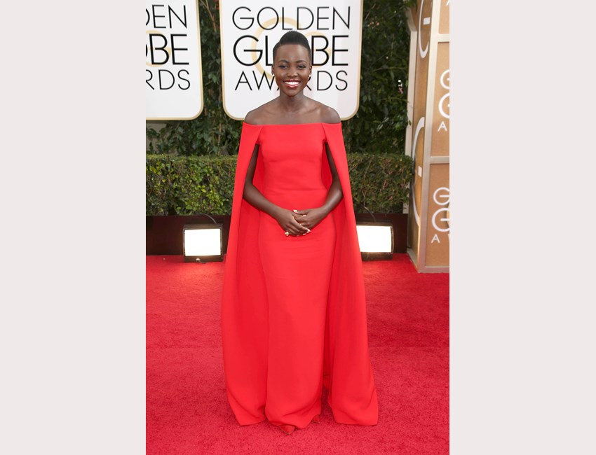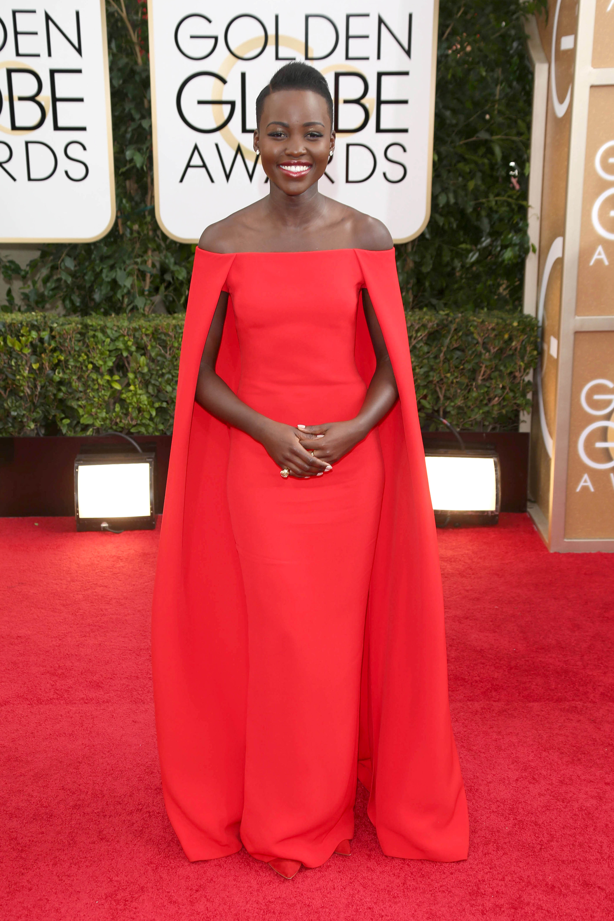 H Lupita Nyong'o φόρεσε ελάχιστα αξεσουάρ και άφησε το κόκκινο Ralph Lauren και την ασορτί κάπα να κάνουν όλη τη δουλειά, το 2014.