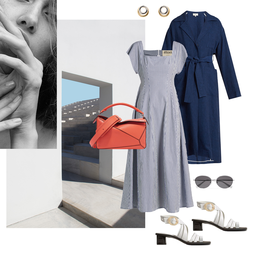 Πανωφόρι Isa Arfen, MATCHESFASHION.COM. Φόρεμα A.W.A.K.E., ΜΑΤCHESFASHION.COM. Τσάντα Loewe, NET-A-PORTER.COM. Σανδάλια MANGO. Γυαλιά ηλίου Elizabeth and James, NET-A-PORTER.COM. Σκουλαρίκια Alexander Wang, SSENSE.COM.