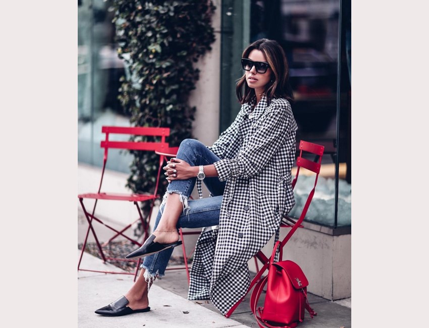 Ένα καρό trench coat, συνδυασμένο με cropped τζιν, κόκκινη τσάντα και mules είναι το ιδανικό ντύσιμο για ένα ανοιξιάτικο πρωινό