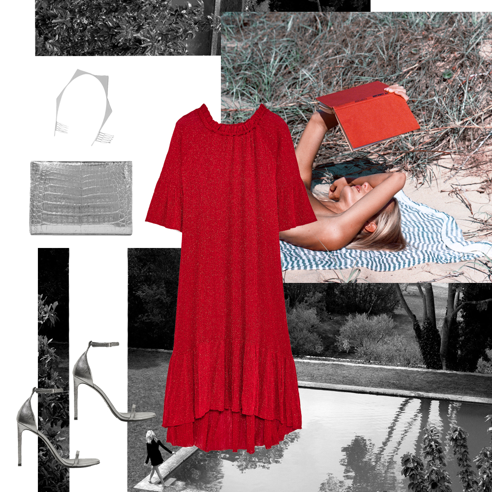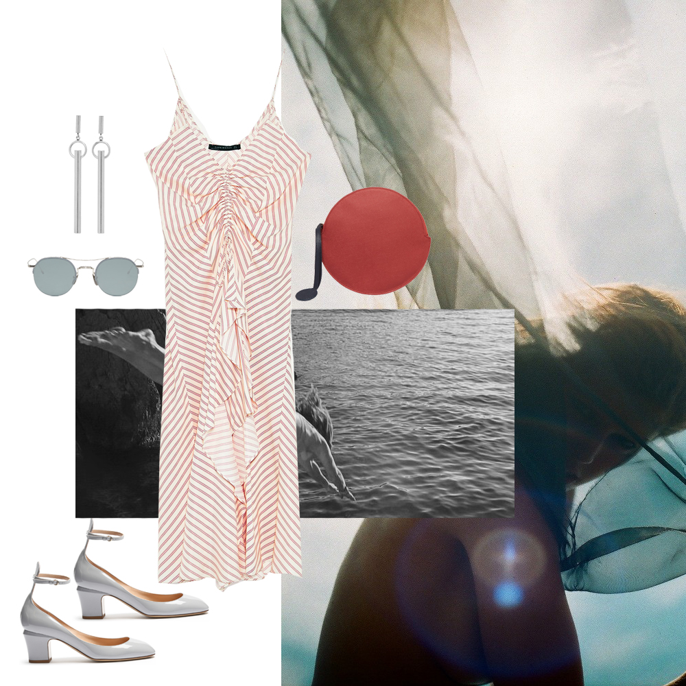 Φόρεμα ZARA. Clutch Roksanda, NET-A-PORTER.COM. Παπούτσια Valentino, LUISA. Γυαλιά ηλίου Thom Browne, SSENSE.COM. Σκουλαρίκια Isabel Marant, LUISA.