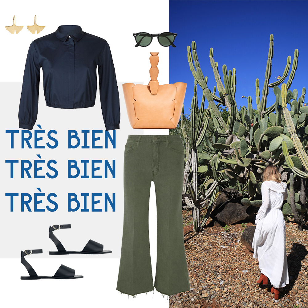 Cropped πουκάμισο Monochrome, €48.00 (από €69.00), MONOCHROME.CLOTHING. Denim παντελόνι Mother, NET-A-PORTER.COM. Τσάντα ZARA. Σανδάλια Ancient Greek Sandals, ANCIENT-GREEK-SANDALS.COM. Σκουλαρίκια Aurélie Bidermann, ΝΕΤ-Α-PORTER.COM. Γυαλιά ηλίου Ray-Ban, LUXOTTICA HELLAS.