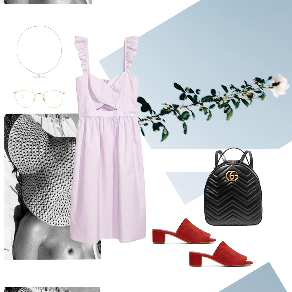 Φόρεμα H&Μ. Backpack Gucci, GUCCI BOUTIQUE. Μules Mansur Gavriel, SSENSE.COM. Οπτικά Linda Farrow, MATCHESFASHION.COM. Κόσμημα για τον λαιμό Saskia Diez, NET-A-PORTER.COM.