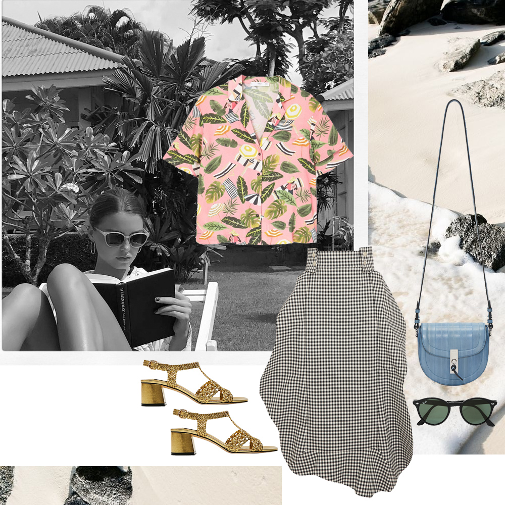 Πουκάμισο MANGO. Φούστα A.W.A.K.E., NET-A-PORTER.COM. Τσάντα Altuzarra, SSENSE.COM. Πέδιλα ZARA. Γυαλιά ηλίου Ray-Ban, LUXOTTICA HELLAS.