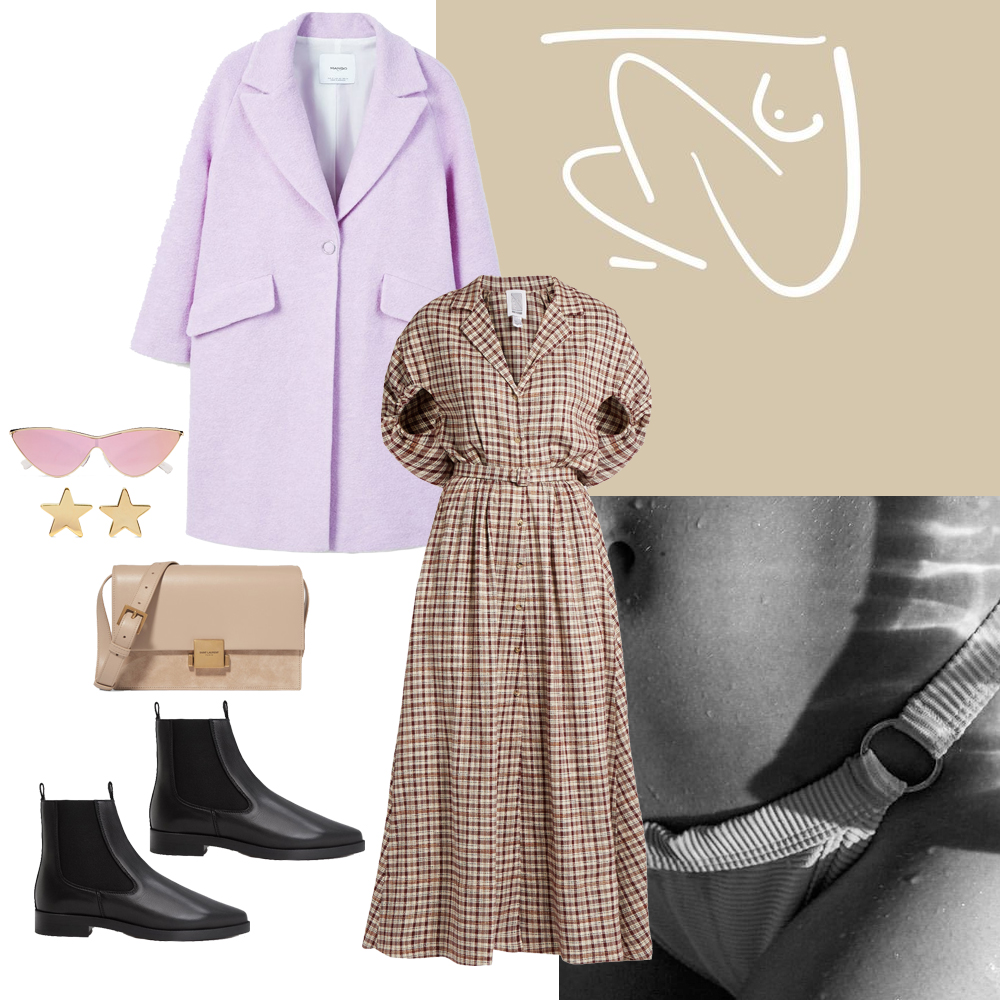 Ολόμαλλο παλτό MANGO, MANGO.COM. Φόρεμα Rosie Assoulin, ΜΑΤCHESFASHION.COM. Τσάντα Saint Laurent, LUISA. Μποτάκια MANGO, MANGO.COM. Γυαλιά ηλίου Le Specs, NET-A-PORTER.COM. Σκουλαρίκια Jennifer Meyer, ΝΕΤ-Α-PORTER.COM.