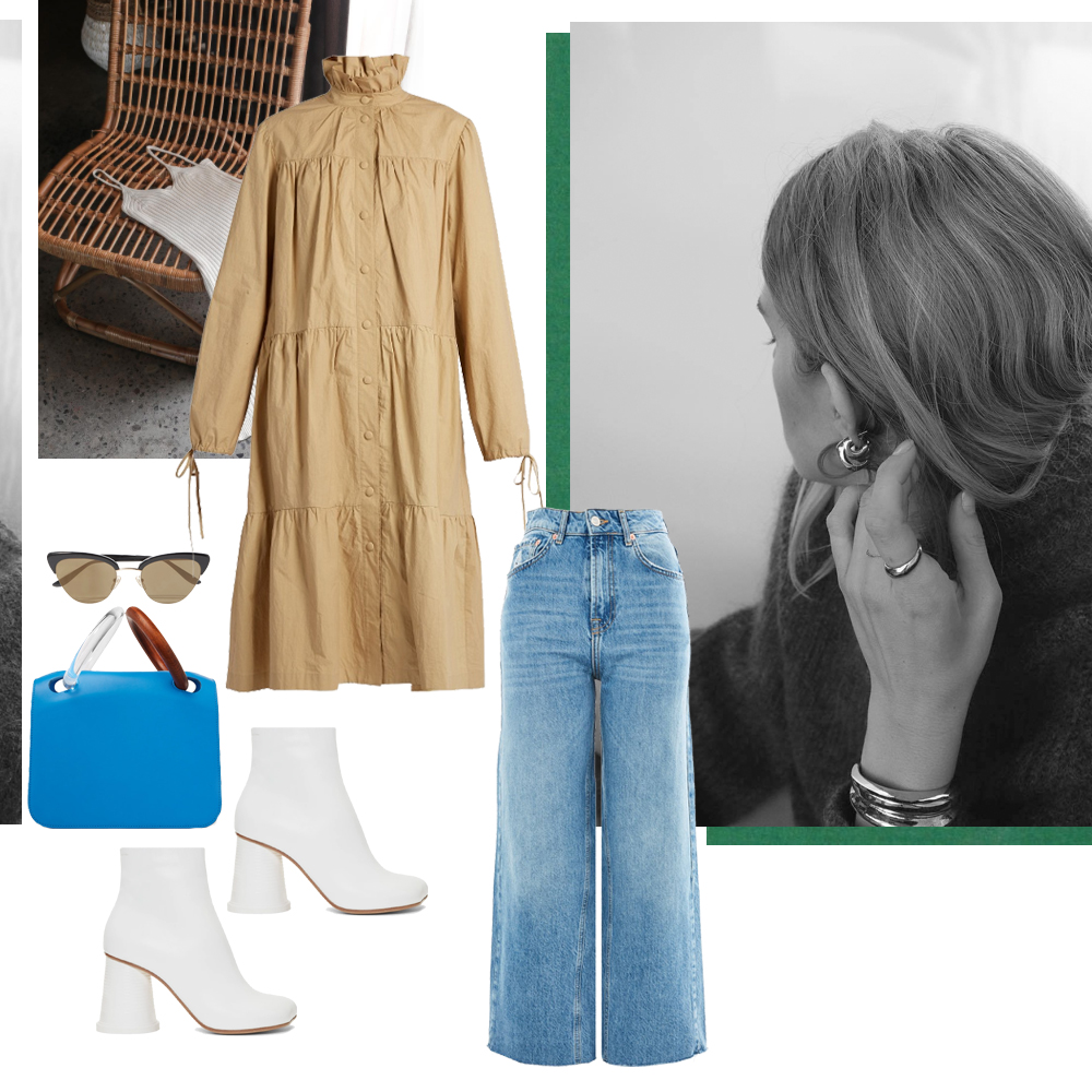Πανωφόρι J.W.Anderson, MATCHESFASHION.COM. Denim παντελόνι Topshop, TOPSHOP.COM. Τσάντα Roksanda, NET-A-PORTER.COM. Ankle boots MM6 Maison Martin Margiela, SSENSE.COM. Γυαλιά ηλίου Sunday Somewhere, NET-A-PORTER.COM.