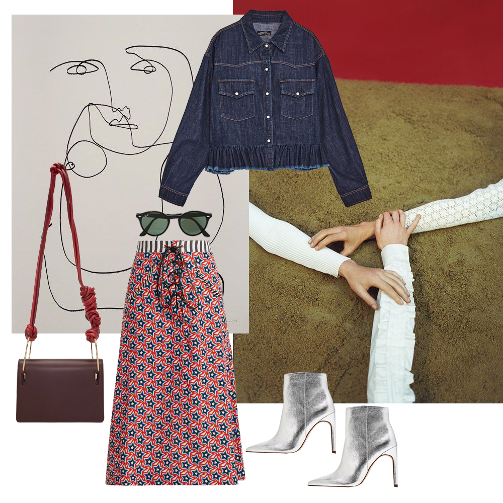 Denim πουκάμισο ZARA. Φούστα House of Holland, MATCHESFASHION.COM. Τσάντα Roksanda, SSENSE.COM. Ankle boots ZARA. Γυαλιά ηλίου Ray-Ban, LUXOTTICA HELLAS.