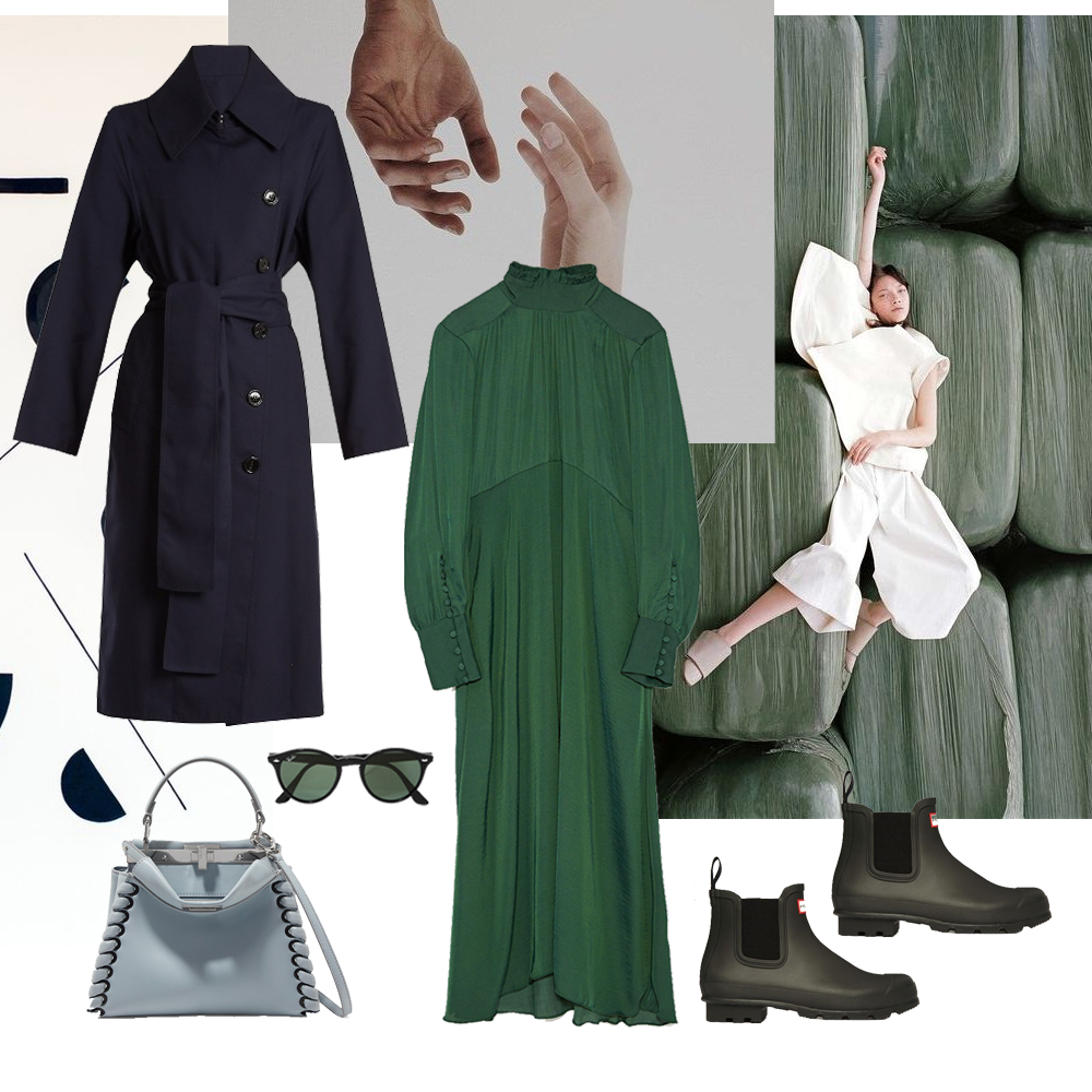 Trench coat Acne Studios, MATCHESFASHION.COM. Φόρεμα ZARA. Τσάντα Fendi, FENDI BOUTIQUE. Rain boots HUNTER. Γυαλιά ηλίου Ray-Ban, LUXOTTICA HELLAS.