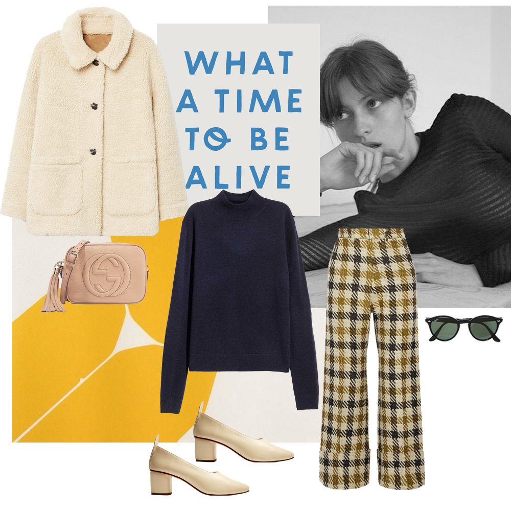 Παλτό διπλής όψης MANGO, MANGO.COM. Κασμιρένιο πουλόβερ H&M. Παντελόνι SEA, NET-A-PORTER.COM. Tσάντα Gucci, GUCCI BOUTIQUE. Παπούτσια Joseph, MATCHESFASHION.COM. Γυαλιά ηλίου Ray-Ban, LUXOTTICA HELLAS.