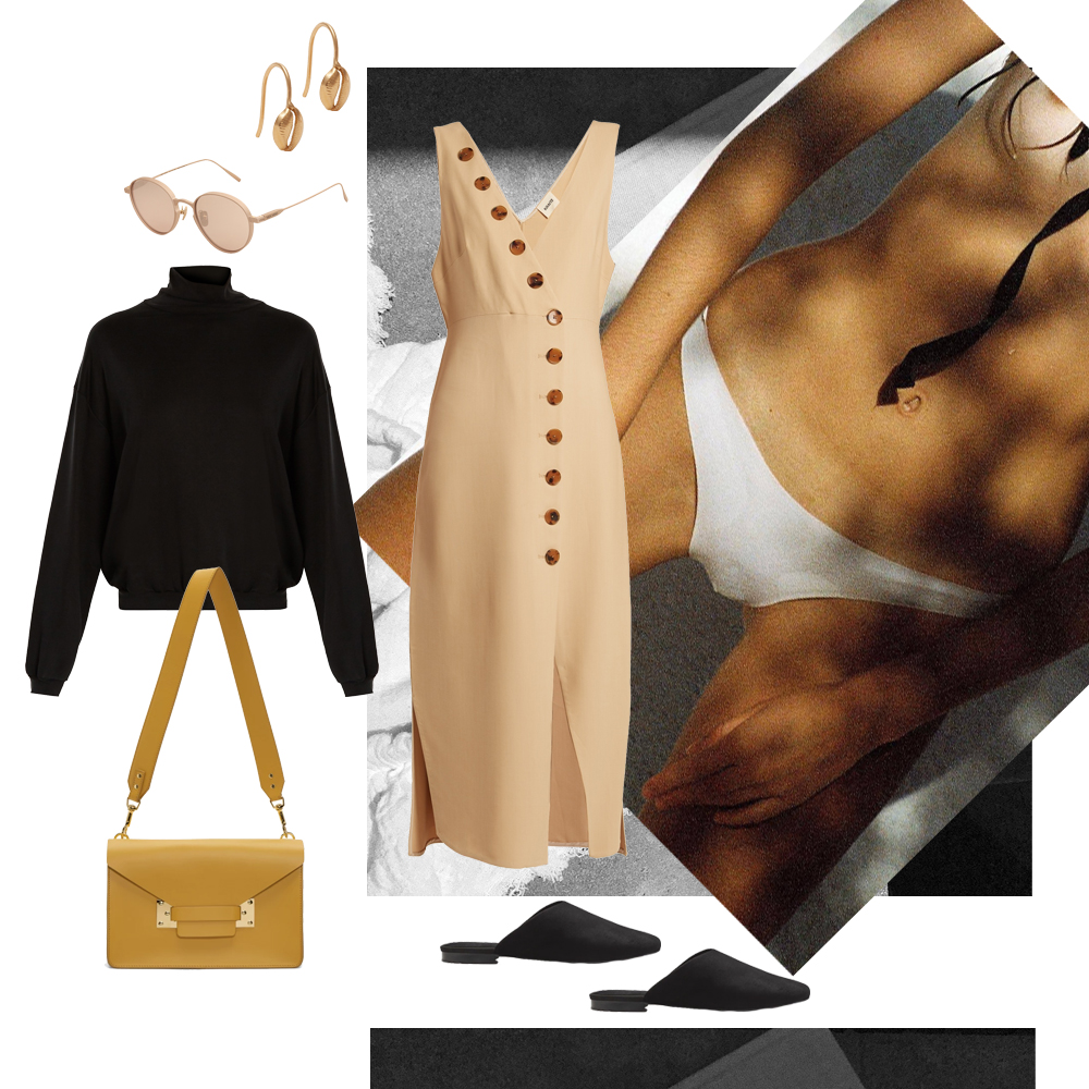 Φόρεμα Khaite, MATCHESFASHION.COM. Ζιβάγκο Balenciaga, BALENCIAGA BOUTIQUE. Τσάντα Sophie Hulme, SSENSE.COM. Eξώφτερνα flats Mango, MANGO.COM. Γυαλιά ηλίου Vedi Vero, BAIRAMOGLOU.GR. Σκουλαρίκια Isabel Marant, NET-A-PORTER.COM.