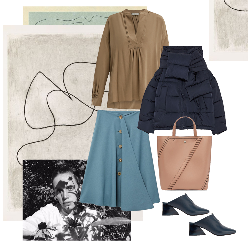 Puffer jacket ZARA. Μπλούζα Vince, MATCHESFASHION.COM. Φούστα MANGO, MANGO.COM. Τσάντα Proenza Schouler, SSENSE.COM. Mules Mercedes Castillo, NET-A-PORTER.COM.