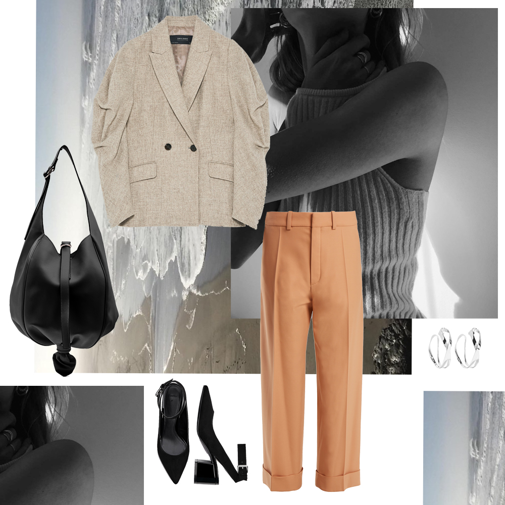 Σακάκι ZARA, ZARA.COM. Παντελόνι Chloé, MATCHESFASHION.COM. Τσάντα JW Anderson, MATCHESFASHION.COM. Παπούτσια Bershka, BERSHKA.COM. Σκουλαρίκια Jennifer Fisher, NET-A-PORTER.COM.