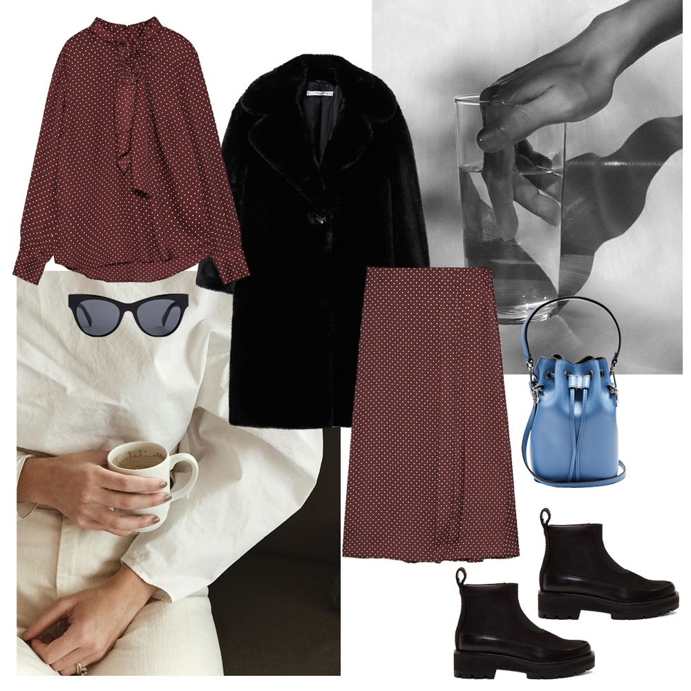 Γούνινο παλτό MANGO, MANGO.COM. Μπλούζα ZARA, ZARA.COM. Φούστα ZARA, ZARA.COM. Τσάντα Fendi, MATCHESFASHION.COM. Μποτάκια 3.1 Phillip Lim, SSENSE.COM. Γυαλιά ηλίου MANGO, MANGO.COM.