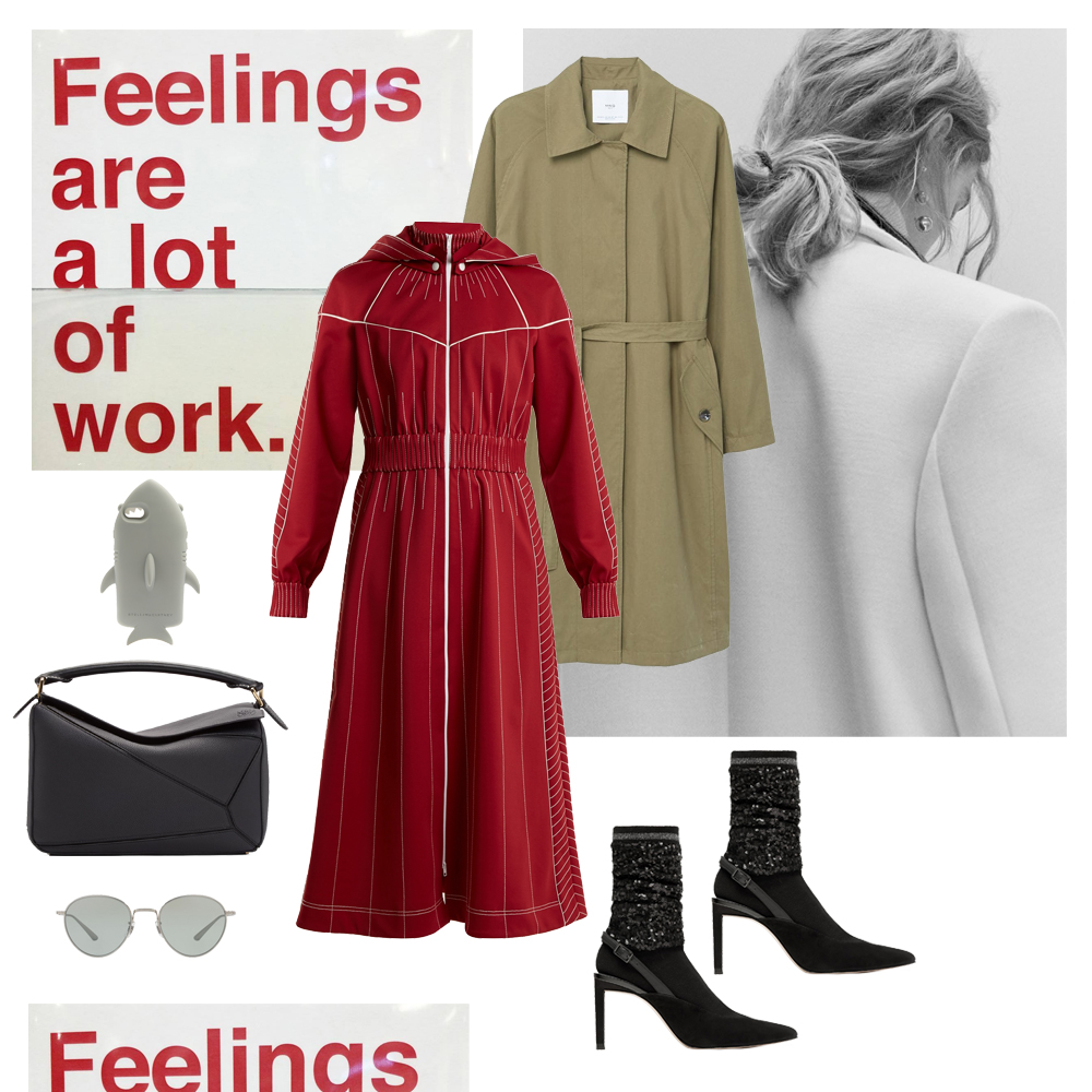 Καπαρντίνα MANGO, MANGO.COM. Φόρεμα Valentino, LUISA. Τσάντα Loewe, ATTICA. Ψηλοτάκουνα παπούτσια ZARA, ZARA.COM. Θήκη για iPhone 7 Stella McCartney, NET-A-PORTER.COM. Γυαλιά ηλίου Oliver Peoples, LUXOTTICA HELLAS.