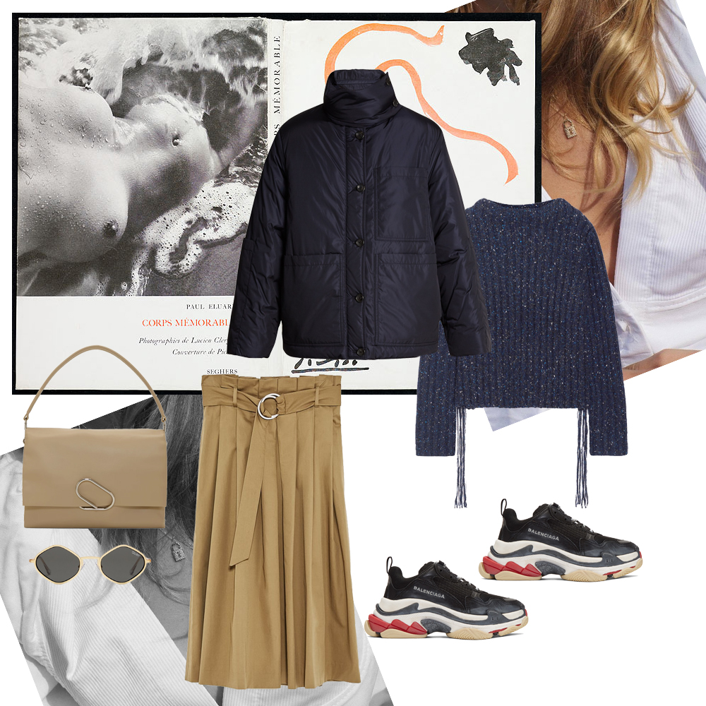 Πανωφόρι Joseph, MATCHESFASHION.COM. Πουλόβερ The Row, NET-A-PORTER.COM. Φούστα ZARA. Τσάντα 3.1 Phillip Lim, SSENSE.COM. Sneakers Balenciaga, BALENCIAGA BOUTIQUE. Γυαλιά ηλίου Quay Australia, QUAYAUSTRALIA.CO.UK.