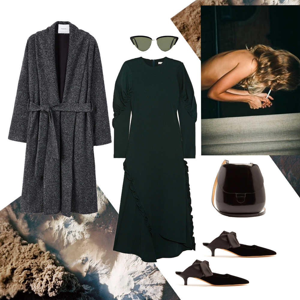 Φόρεμα Tibi, NET-A-PORTER.COM. Παλτό MANGO, MANGO.COM. Tσάντα Lemaire, MATCHESFASHION.COM. Μules The Row, MATCHESFASHION.COM. Γυαλιά ηλίου MANGO, MANGO.COM.