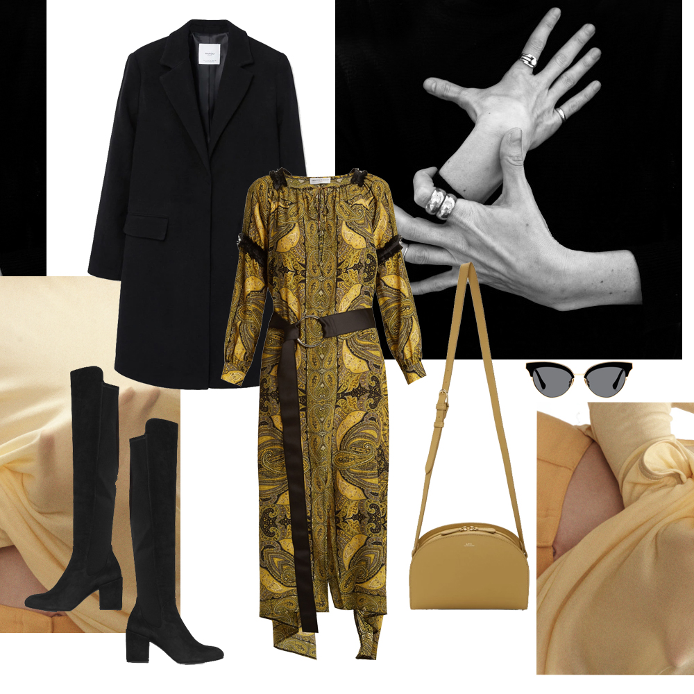 Παλτό MANGO, MANGO.COM. Φόρεμα Amanda Wakeley, MATCHESFASHION.COM. Τσάντα A.P.C., SSENSE.COM. Μπότες Stuart Weitzman, ΝΕΤ-Α-PORTER.COM. Γυαλιά ηλίου Kaleos Eyehunters, THE WORKSHOP, τηλ.: 210 9314549.