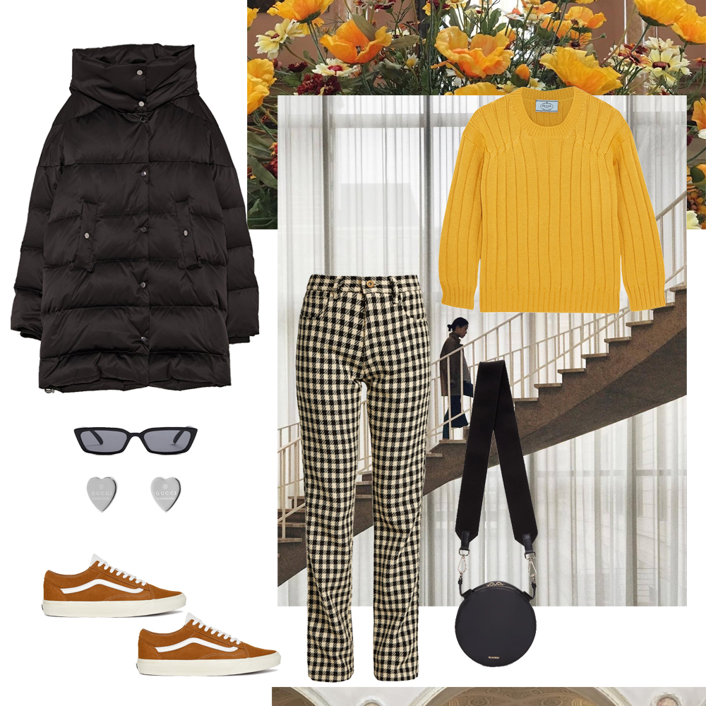 Puffer coat ZARA, ZARA.COM. Πουλόβερ Prada, PRADA BOUTIQUE. Παντελόνι Wales Bonner, MATCHESFASHION.COM. Τσάντα Jil Sander, SSENSE.COM. Sneakers VANS. Γυαλιά ηλίου MANGO, MANGO.COM. Σκουλαρίκια Gucci, GUCCI BOUTIQUE.