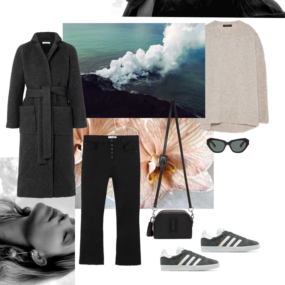 Παλτό Ganni, NET-A-PORTER.COM. Πουλόβερ Zara, ZARA.COM. Denim παντελόνι Mango, MANGO.COM. Τσάντα Marc Jacobs, ATTICA. Sneakers ADIDAS. Γυαλιά ηλίου Dries Van Noten, SSENSE.COM.