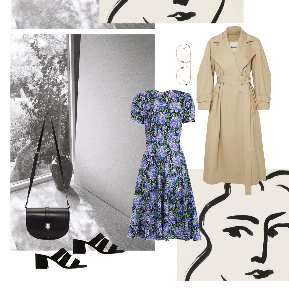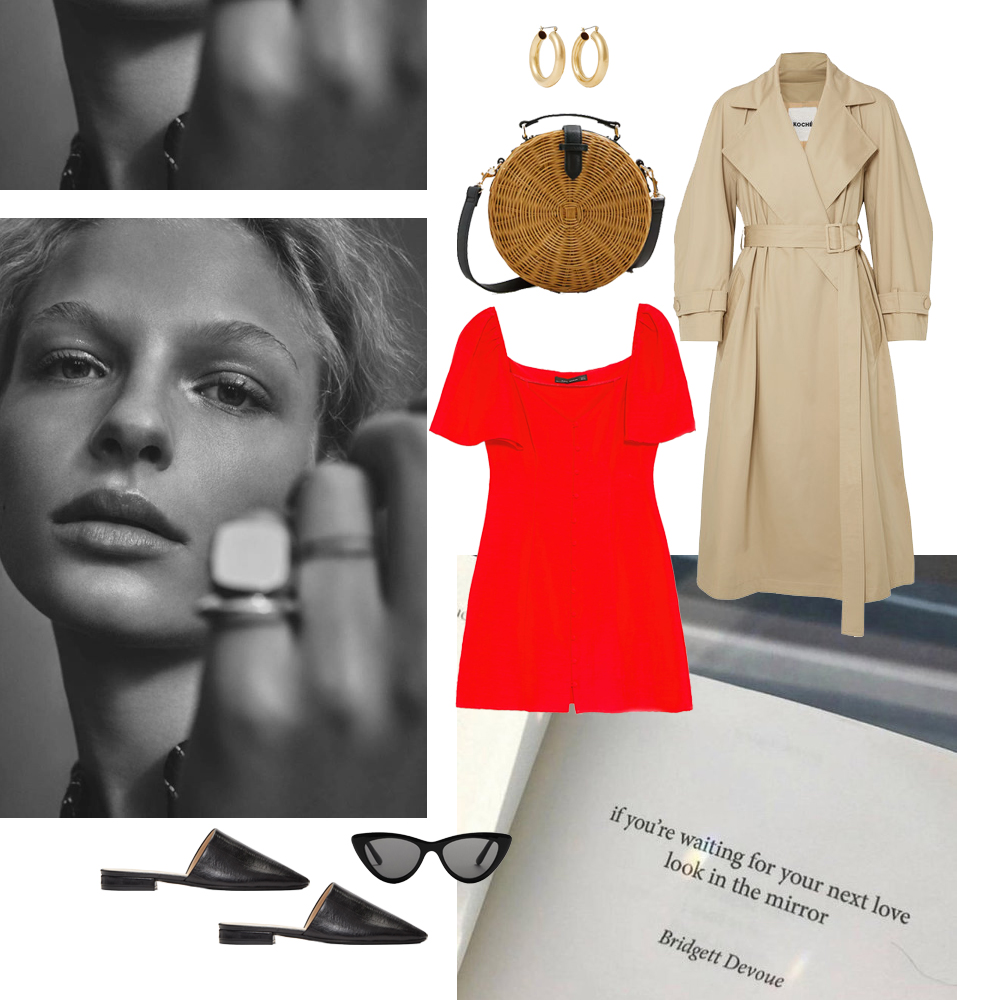 Trench coat Koché, NET-A-PORTER.COM. Φόρεμα Zara, ZARA.COM. Τσάντα Mango, MANGO.COM. Εξώφτερνα flats Acne Studios, SSENSE.COM. Γυαλιά ηλίου Mango, MANGO.COM. Σκουλαρίκια Laura Lombardi, NET-A-PORTER.COM.