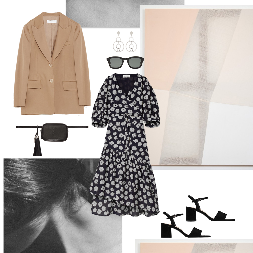 Σακάκι Zara, ZARA.COM. Φόρεμα Apiece Apart, NET-A-PORTER.COM. Belt bag Saint Laurent, LUISA. Πέδιλα Zara, ZARA.COM. Γυαλιά ηλίου Thom Browne, SHOWCASE. Σκουλαρίκια MARKS & SPENCER.