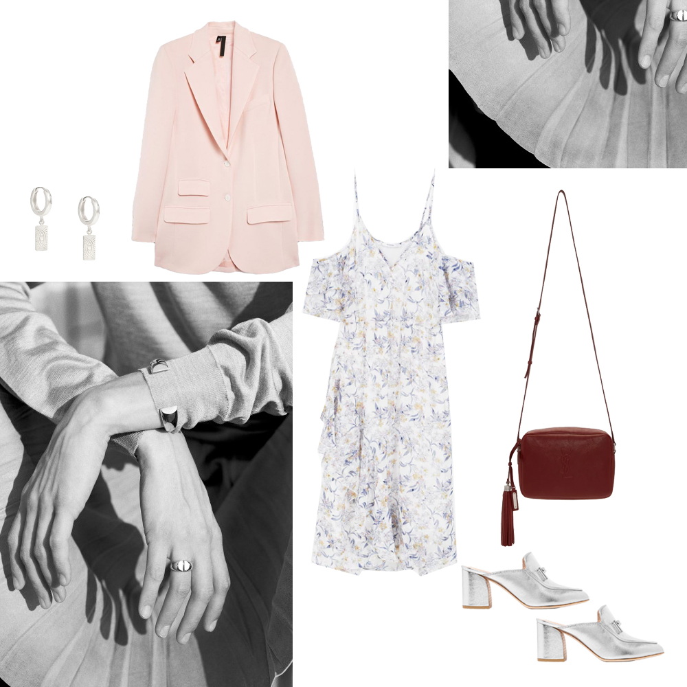 Blazer Topshop, TOPSHOP.COM. Φόρεμα Mango, MANGOOUTLET.COM. Τσάντα ώμου Saint Laurent, LUISA. Mules Tod's, NET-A-PORTER.COM. Σκουλαρίκια Hermina Wristwear, HERMINAWRISTWEAR.COM.