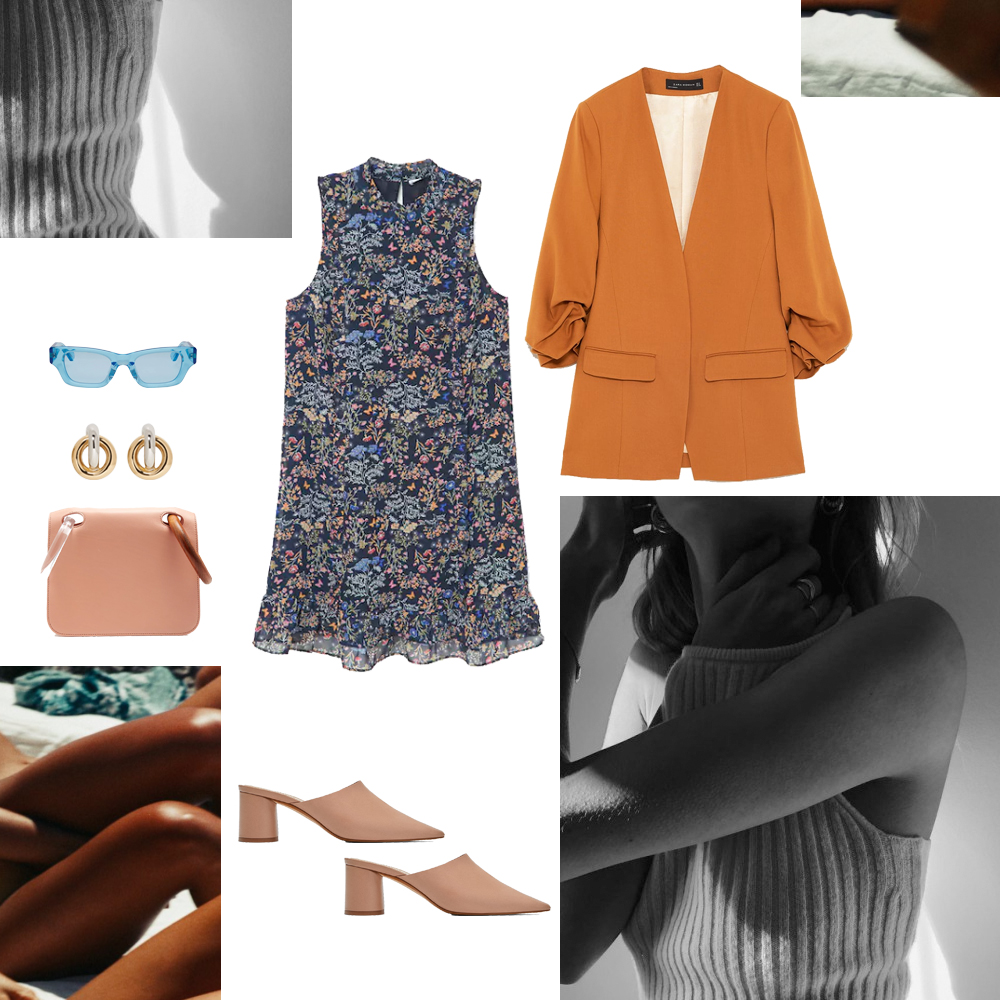 Blazer Zara, ZARA.COM. Φόρεμα Mango, MANGOOUTLET.COM. Mules Zara, ZARA.COM. Τσάντα Roksanda, MATCHESFASHION.COM. Σκουλαρίκια JW Anderson, SSENSE.COM. Γυαλιά ηλίου Ambush, SSENSE.COM.