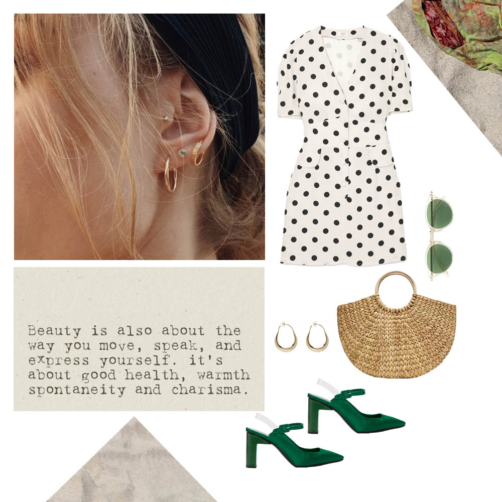 Φόρεμα Rixo London, NET-A-PORTER.COM. Ψάθινη τσάντα Zara, ZARA.COM. Ψηλοτάκουνα παπούτσια Alyx, SSENSE.COM. Γυαλιά ηλίου Oliver Peoples, LUXOTTICA HELLAS. Σκουλαρίκια Lemaire, SSENSE.COM.