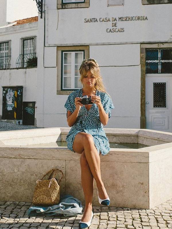 Φλοράλ μίνι φόρεμα+ ψάθινο καλάθι+ chic παπούτσια