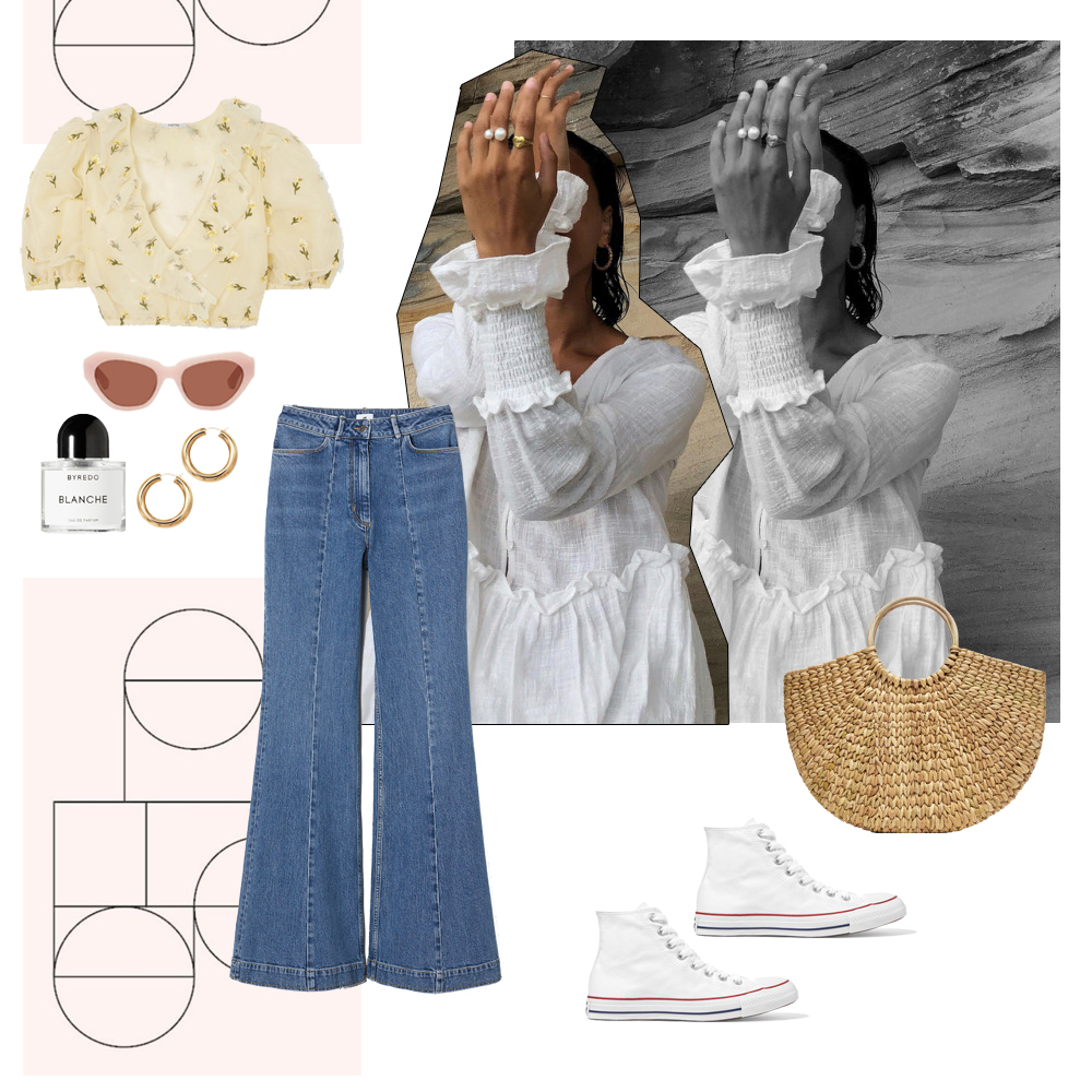 Toπ Ganni, NET-A-PORTER.COM. Denim παντελόνι Η&Μ, ΗΜ.CΟΜ. Ψάθινη τσάντα Zara, ZARA.COM. Sneakers CONVERSE. Σκουλαρίκια Galleria Armadoro, GALLERIA-ARMADORO.COM. Γυαλιά ηλίου Dries Van Noten, SSENSE.COM. Άρωμα Byredo, BYREDO.EU.