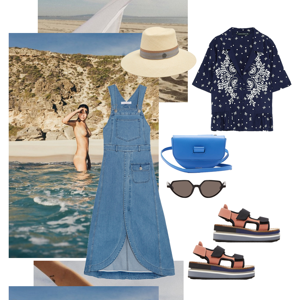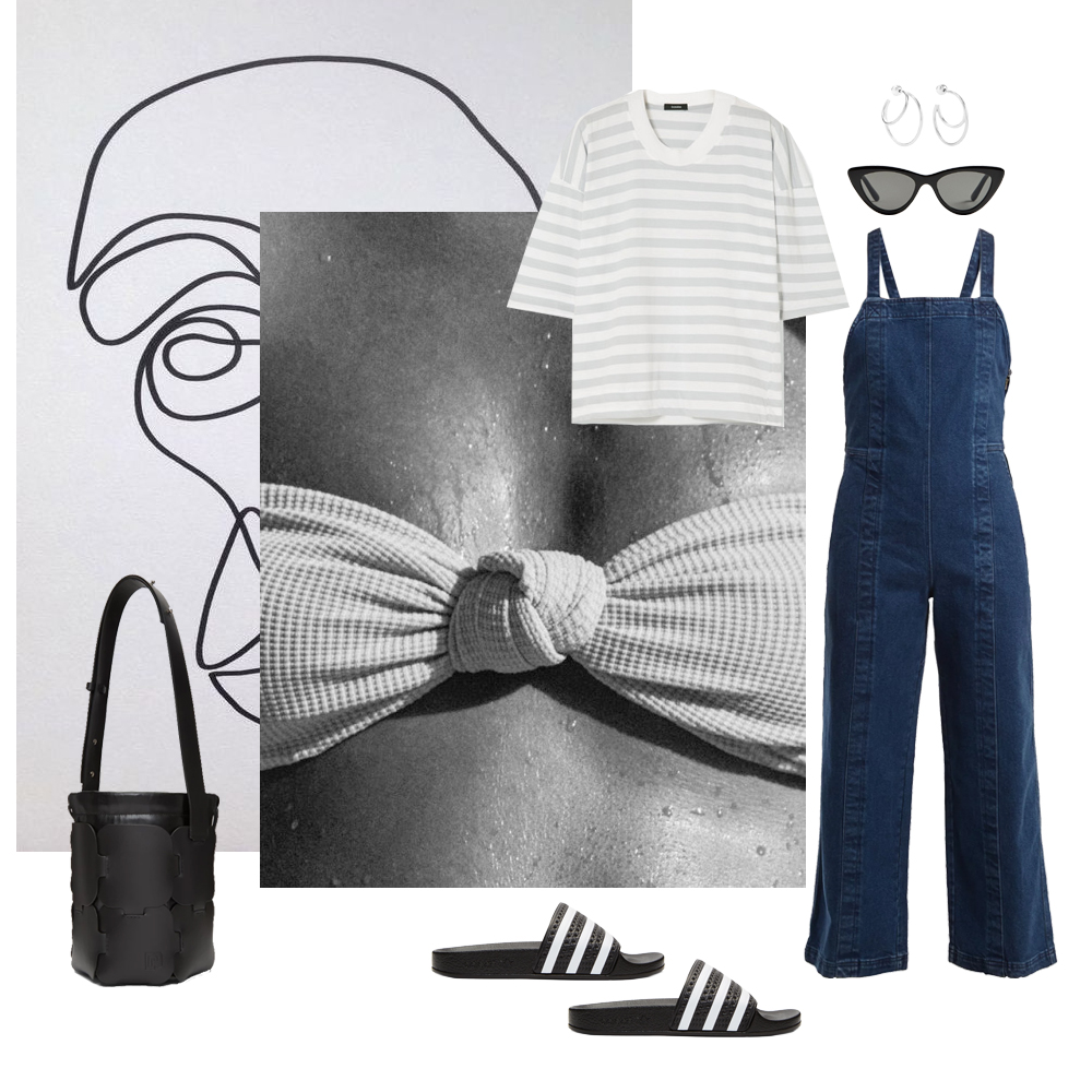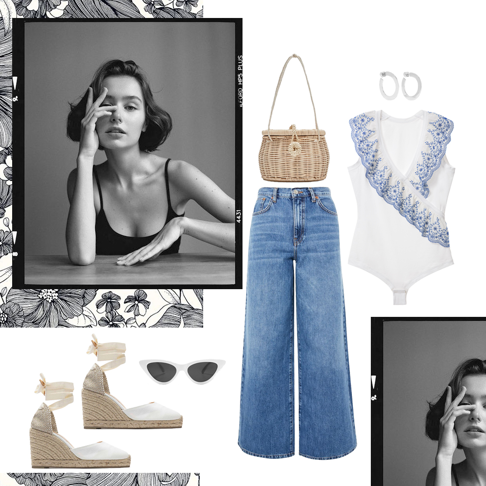 Κορμάκι INTIMISSIMI. Denim παντελόνι Topshop, TOPSHOP.COM. Ψάθινη τσάντα Zara, ZARA.COM. Espadrilles Castañer, ATTICA. Γυαλιά ηλίου Zara, ZARA.COM. Σκουλαρίκια Jennifer Fisher, NET-A-PORTER.COM.