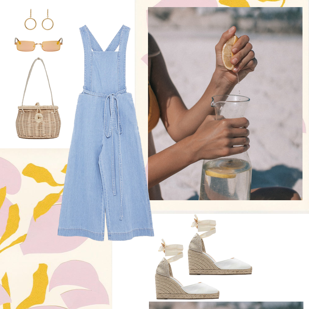 Ολόσωμη φόρμα Zara, ZARA.COM. Τσάντα Mango, MANGO.COM. Espadrilles JW Anderson, NET-A-PORTER.COM. Γυαλιά ηλίου Zara, ZARA.COM. Σκουλαρίκια Loewe, SSENSE.COM. Συλλεκτικό άρωμα Honey & Crocus Cologne Jo Malone, ATTICA.