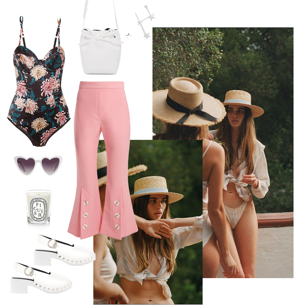 Ολόσωμο μαγιό Sophie Deloudi, SOPHIEDELOUDI.GR. Παντελόνι Prada, PRADA BOUTIQUE. Καλάθι A.P.C., SSENSE.COM. Φλατ Birkenstock, BIRKENSTOCK.COM. Γυαλιά ηλίου Illesteva, NET-A-PORTER.COM.