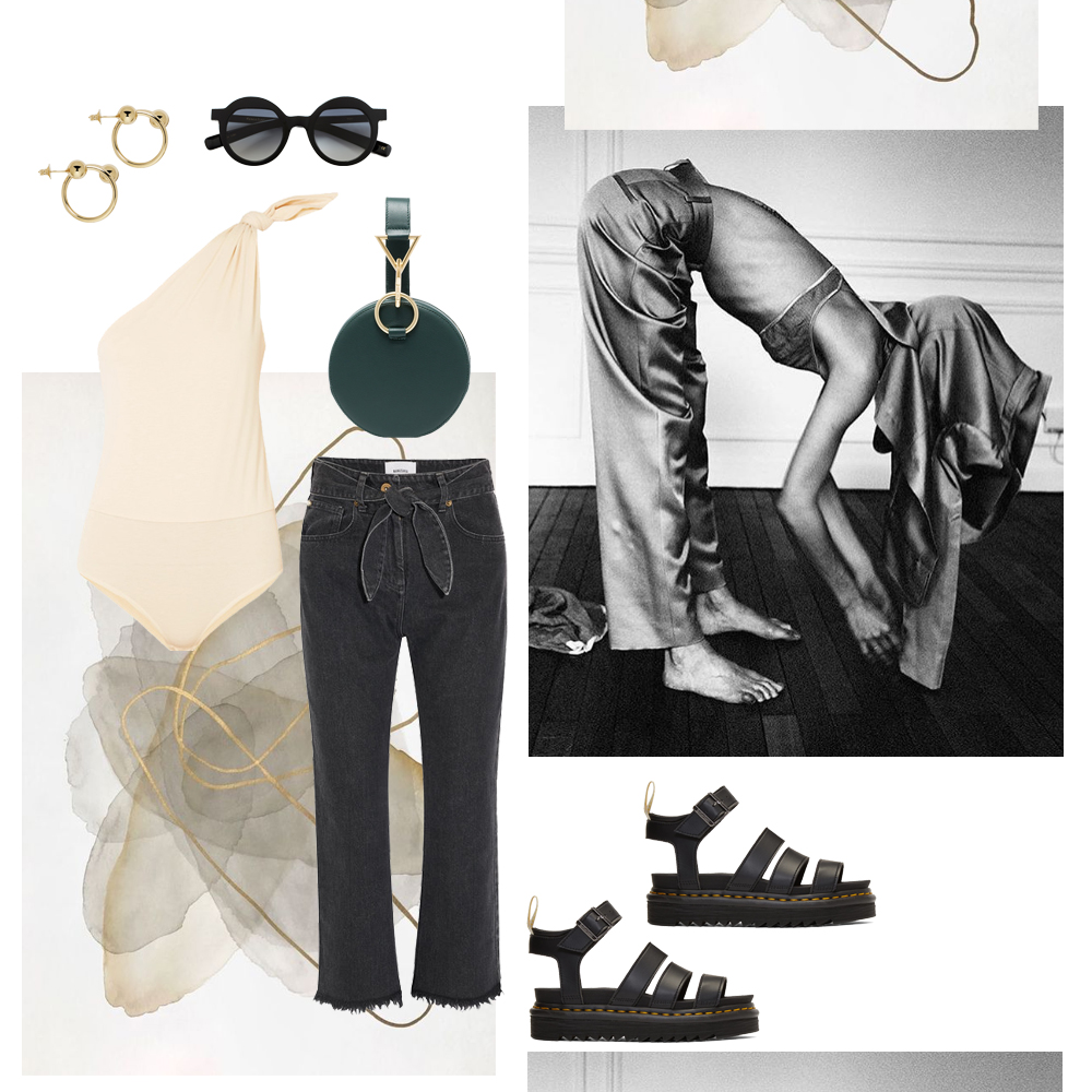 Κορμάκι Fleur du Mal, NET-A-PORTER.COM. Παντελόνι Ellery, MATCHESFASHION.COM. Bucket bag Mansur Gavriel, SSENSE.COM. Clogs Joseph, MATCHESFASHION.COM. Γυαλιά ηλίου Mango, MANGO.COM. Αρωματικό κερί Figuier Diptyque, ATTICABEAUTY.GR. Σκουλαρίκι Stone and Strand, NET-A-PORTER.COM.