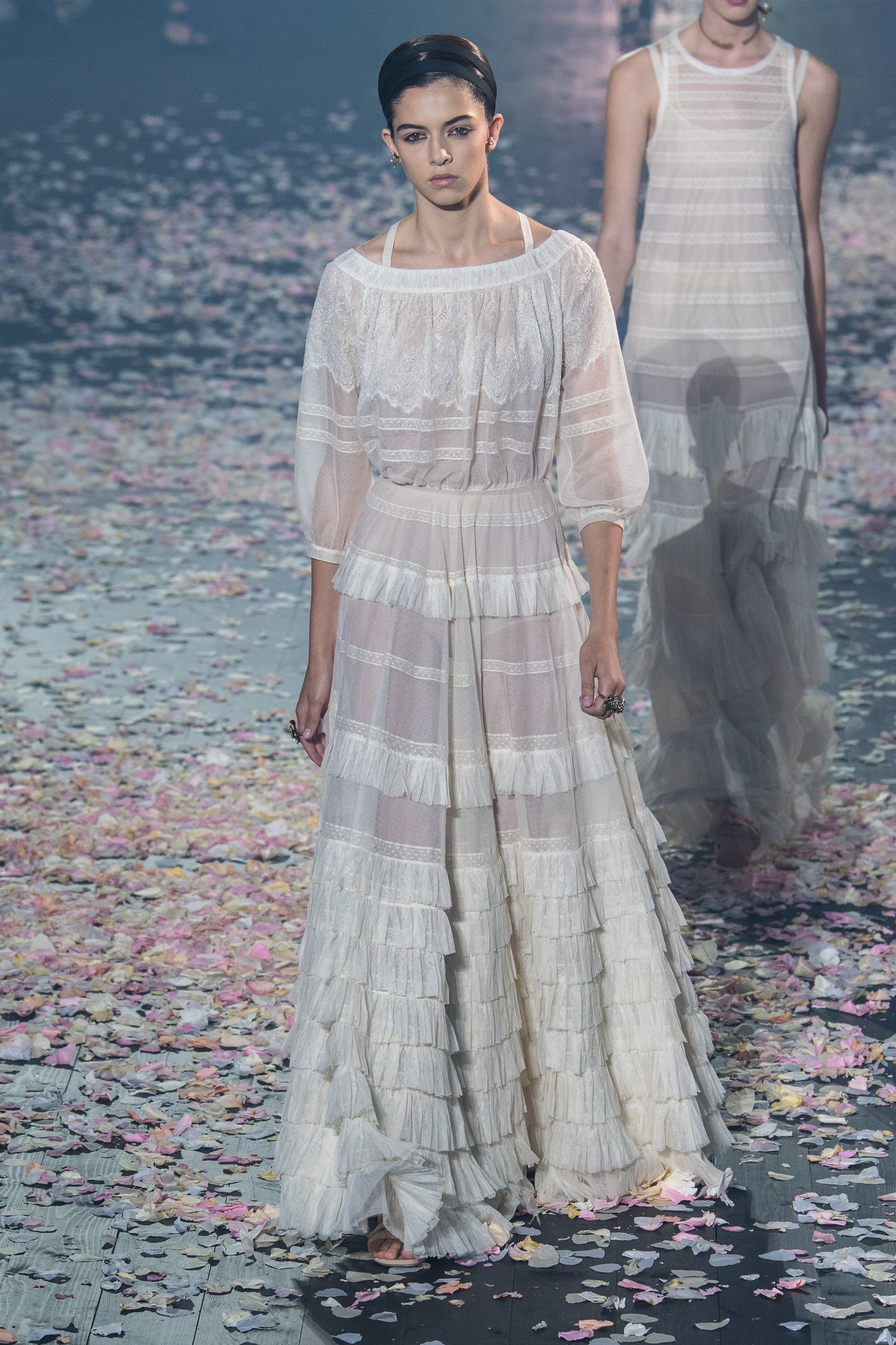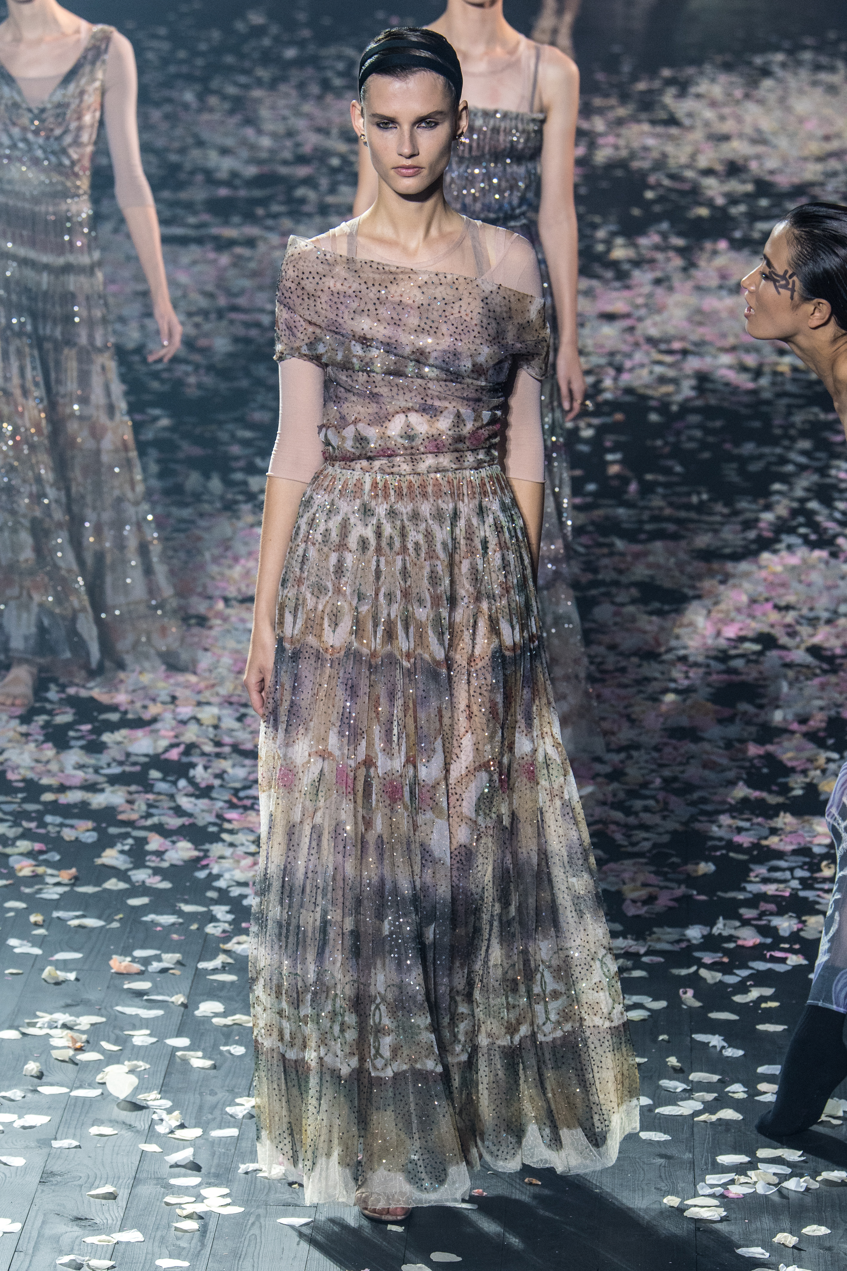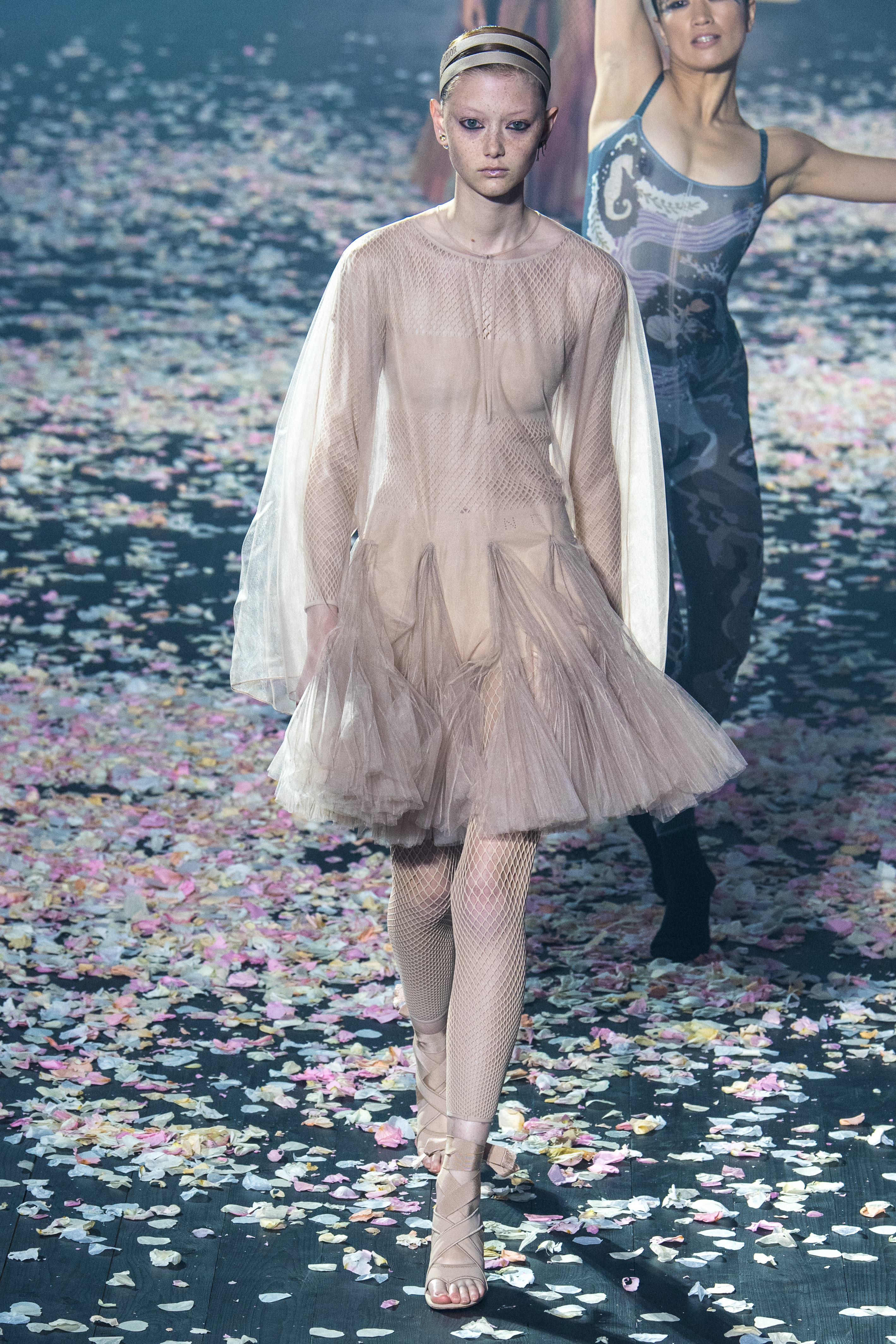 Το απόγευμα της Δευτέρας, λοιπόν, παρουσίασε και τη συλλογή της για τον Dior και τη σεζόν Άνοιξη/Καλοκαίρι 2019. O μινιμαλισμός δεν ήταν ποτέ πιο θηλυκός, πιο παραμυθένιος, πιο αέρινος, πιο αιθέριος. Όλα ξεκίνησαν με ένα απόκοσμο setup που θύμιζε κάτι μεταξύ σκοτεινού δάσους και ballet theatre. Από τη μία ατελείωτα κομφετί που έμοιαζαν με ροδοπέταλα και από την άλλη χορευτές και χορεύτριες, ντυμένοι με ολόσωμα bodiesμε ένα απροσδιόριστο σχέδιο σαν αφηρημένη art nouveau. Παρακολουθώντας τις κινήσεις τους μέσα στο θολό τοπίο ένιωθες σαν να ονειρεύεσαι.