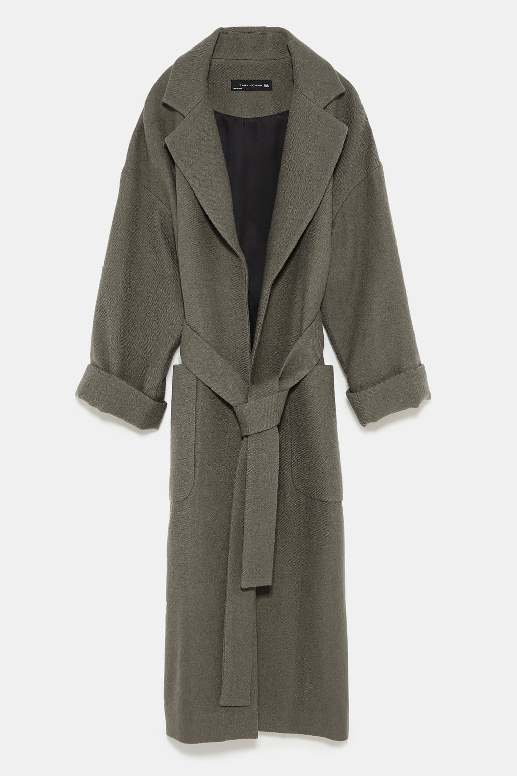 Μακρύ παλτό με ζώνη Zara, μπορείς να το βρεις εδώ.