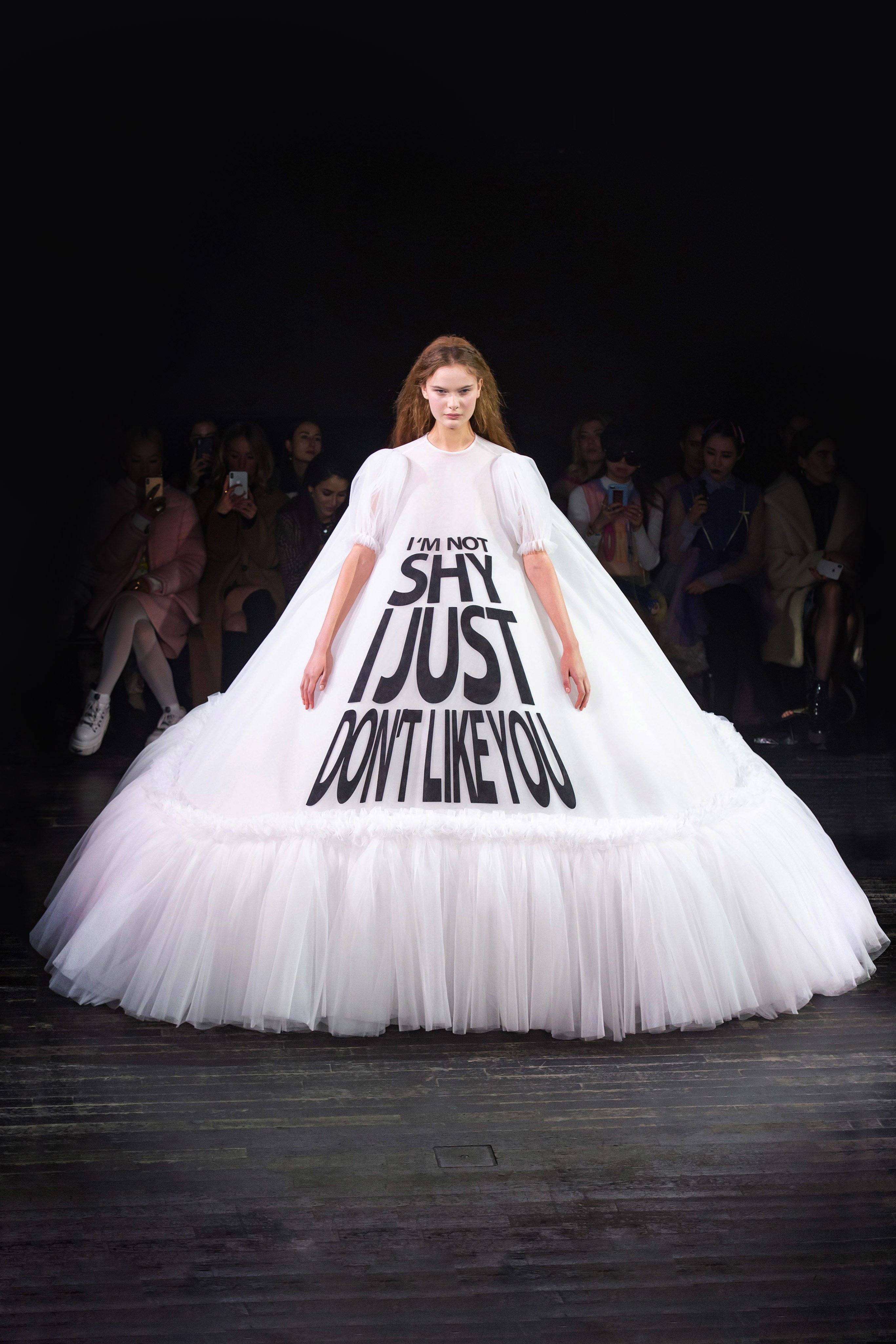 Κάπως έτσι, στις μέρες του #metoo όπου τα red carpets αποτελούν πεδίο διαμαρτυρίας, ο Viktor & Rolf αποφάσισε οι παραμυθένιες δημιουργίες του να εισέλθουν δυναμικά στο νέο κίνημα, περνώντας το δικό τους μήνυμα. Τεράστια logos, λοιπόν, κόσμησαν τις τούλινες υπερπαραγωγές με τα μηνύματα να μιλούν απευθείας στο μυαλό του κοινού και να αναπαράγoνται με τεράστια ταχύτητα στα social media με αποτέλεσμα να γίνουν viral μέσα σε μία νύχτα.