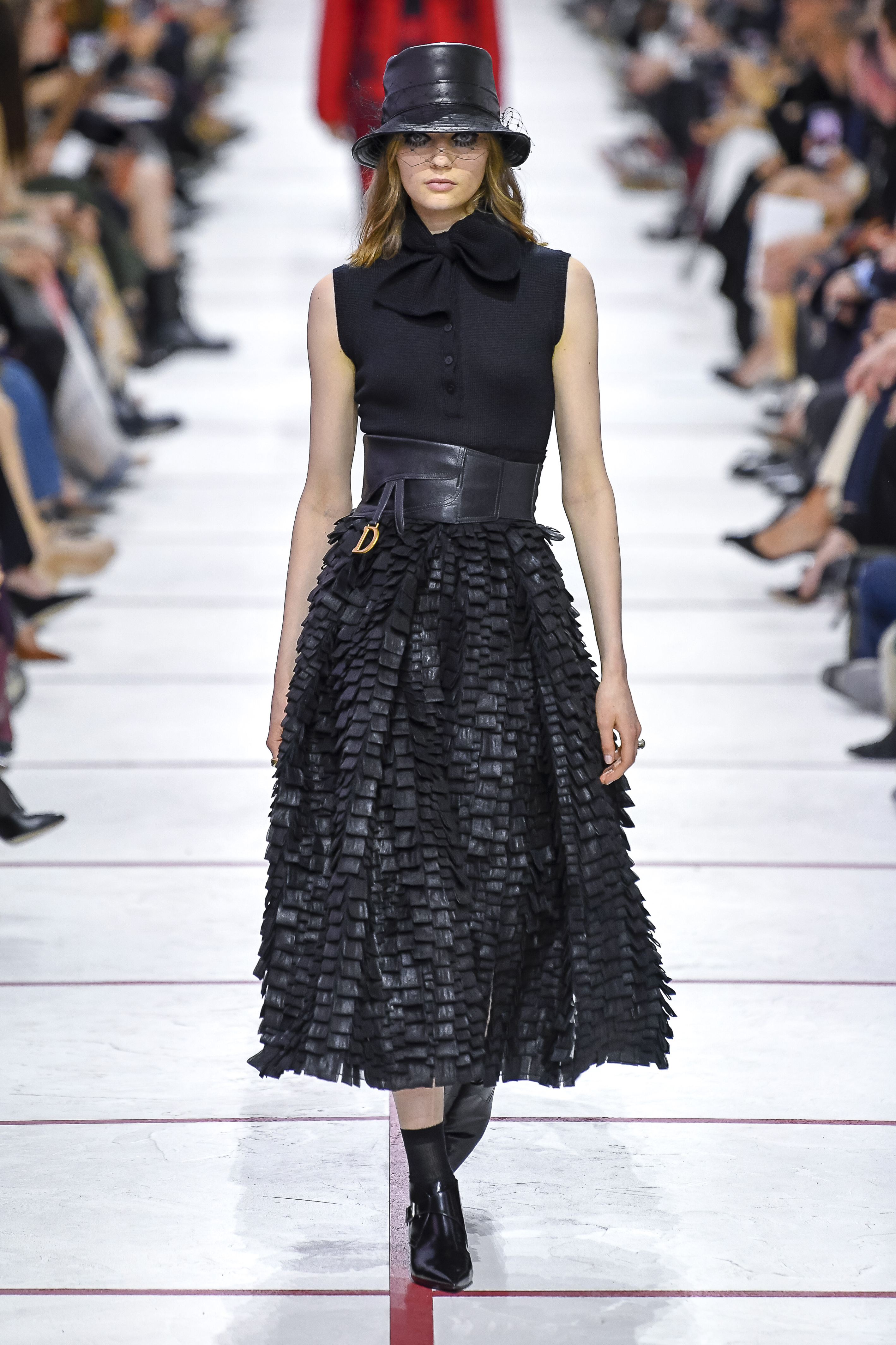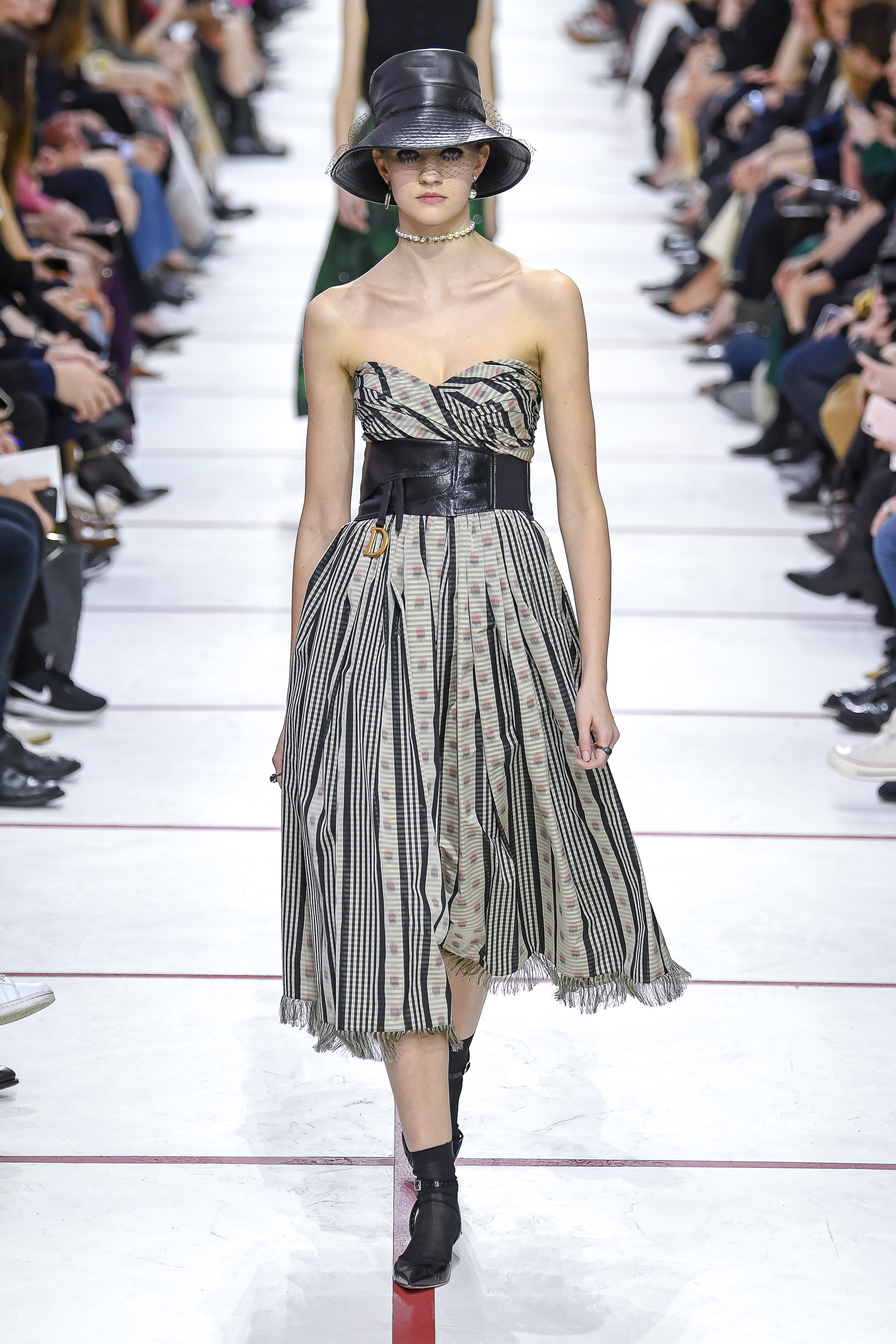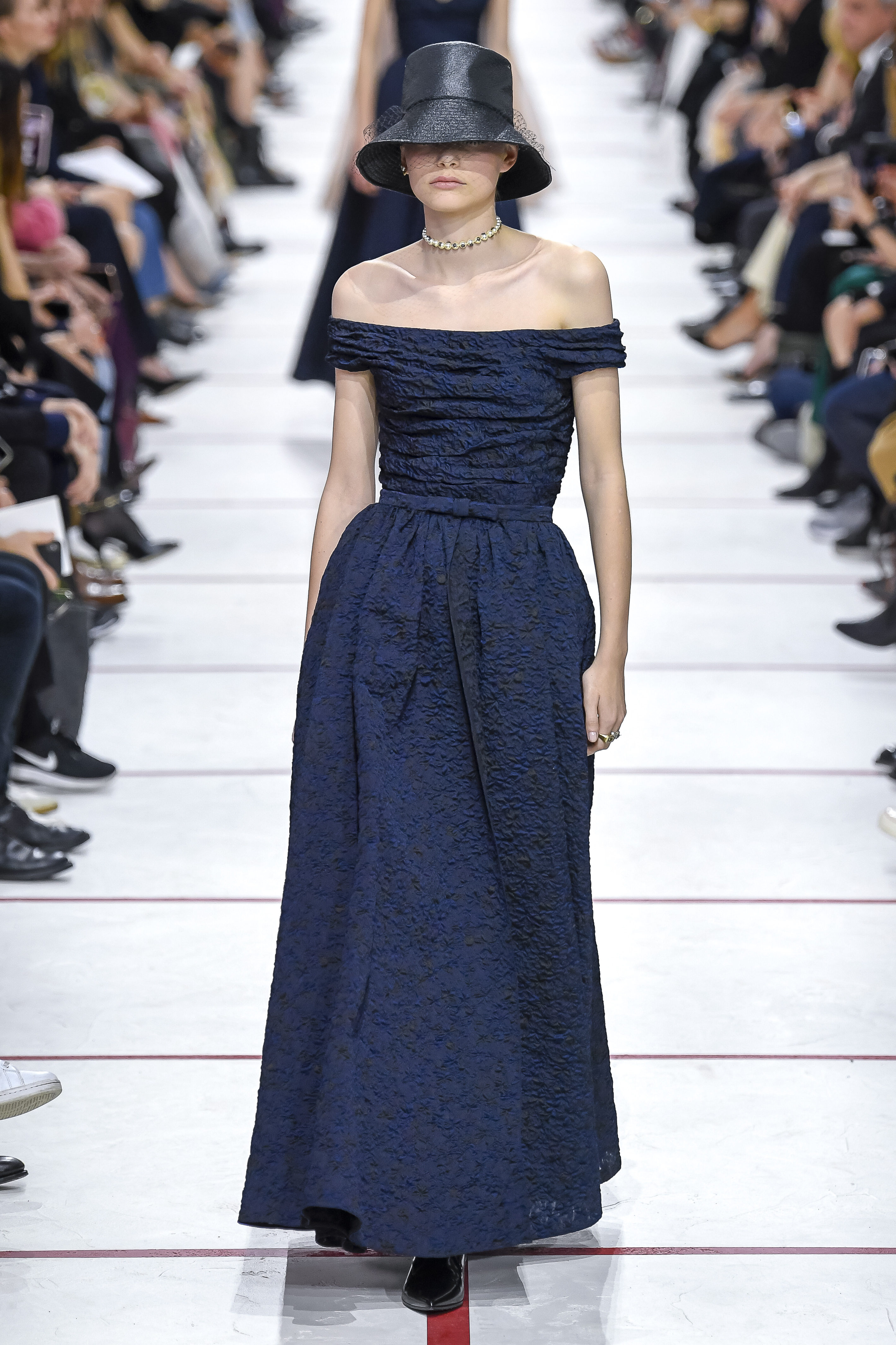 Αυτή τη φορά η συλλογή ήταν μια σαφής αναφορά στο New Look του Dior. Για όσους δεν το γνωρίζουν ο θρυλικός σχεδιαστής σύστησε στο κοινό αυτή τη σιλουέτα στα 1950s και ακριβώς μετά τον Β’ Παγκόσμιο Πόλεμο. Στενοί ώμοι, τονισμένη μέση και όγκος στο κάτω μέρος της, που επιτεύχθηκε με πολλά μέτρα ύφασμα. Στόχος αυτής της σιλουέτας ήταν να αναδείξει τη θηλυκότητα και να κάνει τις γυναίκες να νιώσουν και πάλι όμορφες. Δεν απέχει και πολύ δηλαδή από τον στόχο που έχει και σήμερα η Maria Grazia Chiuri.