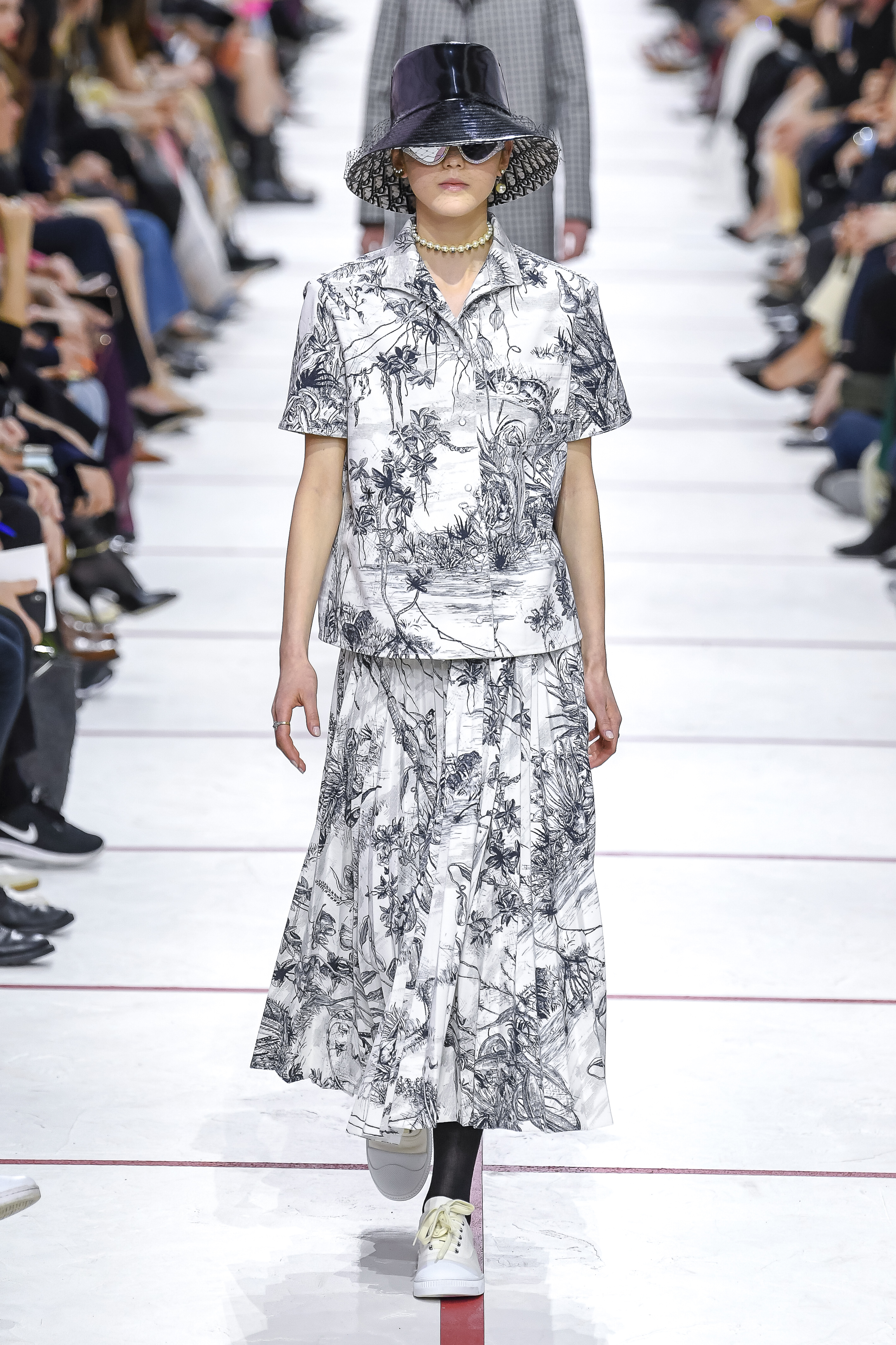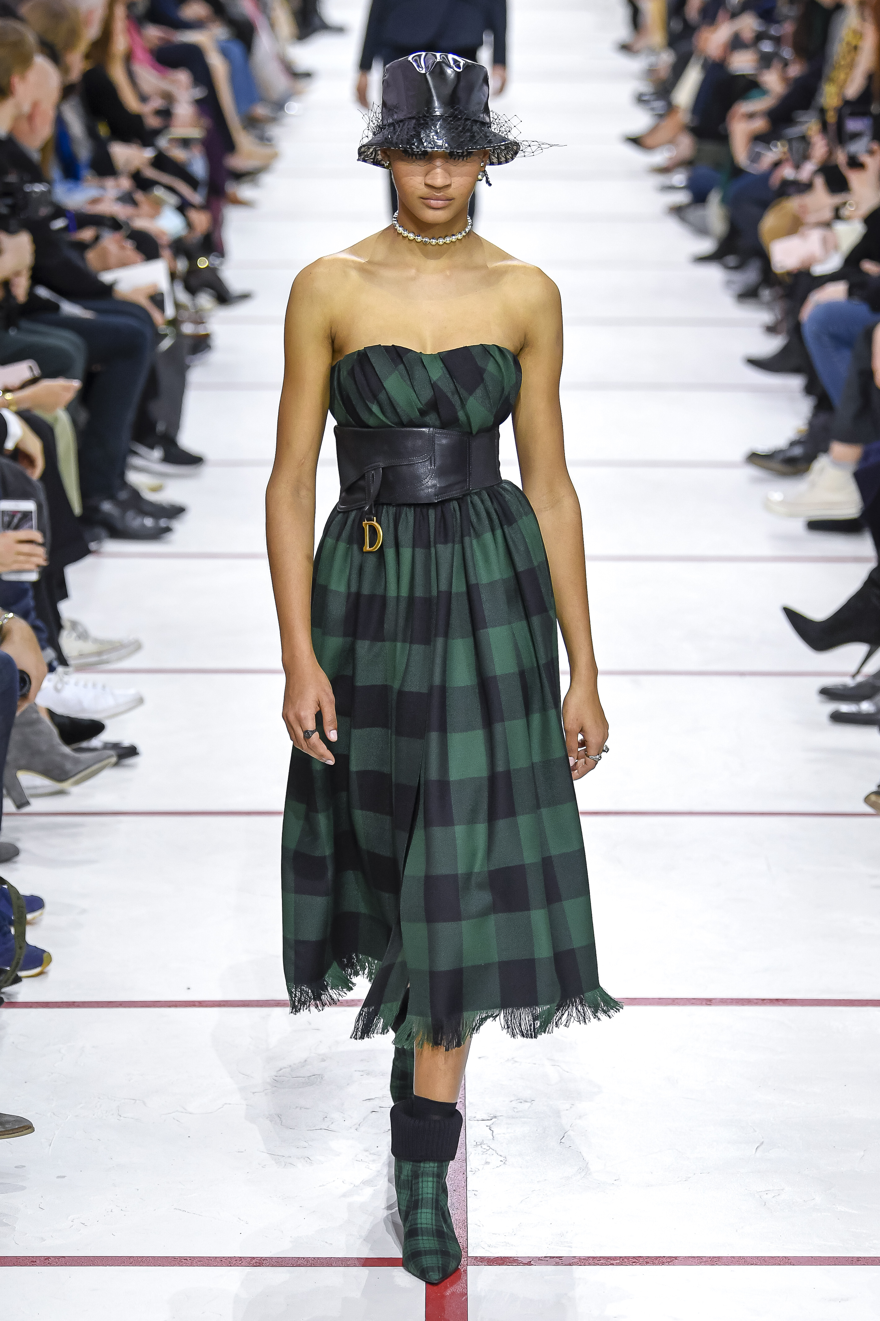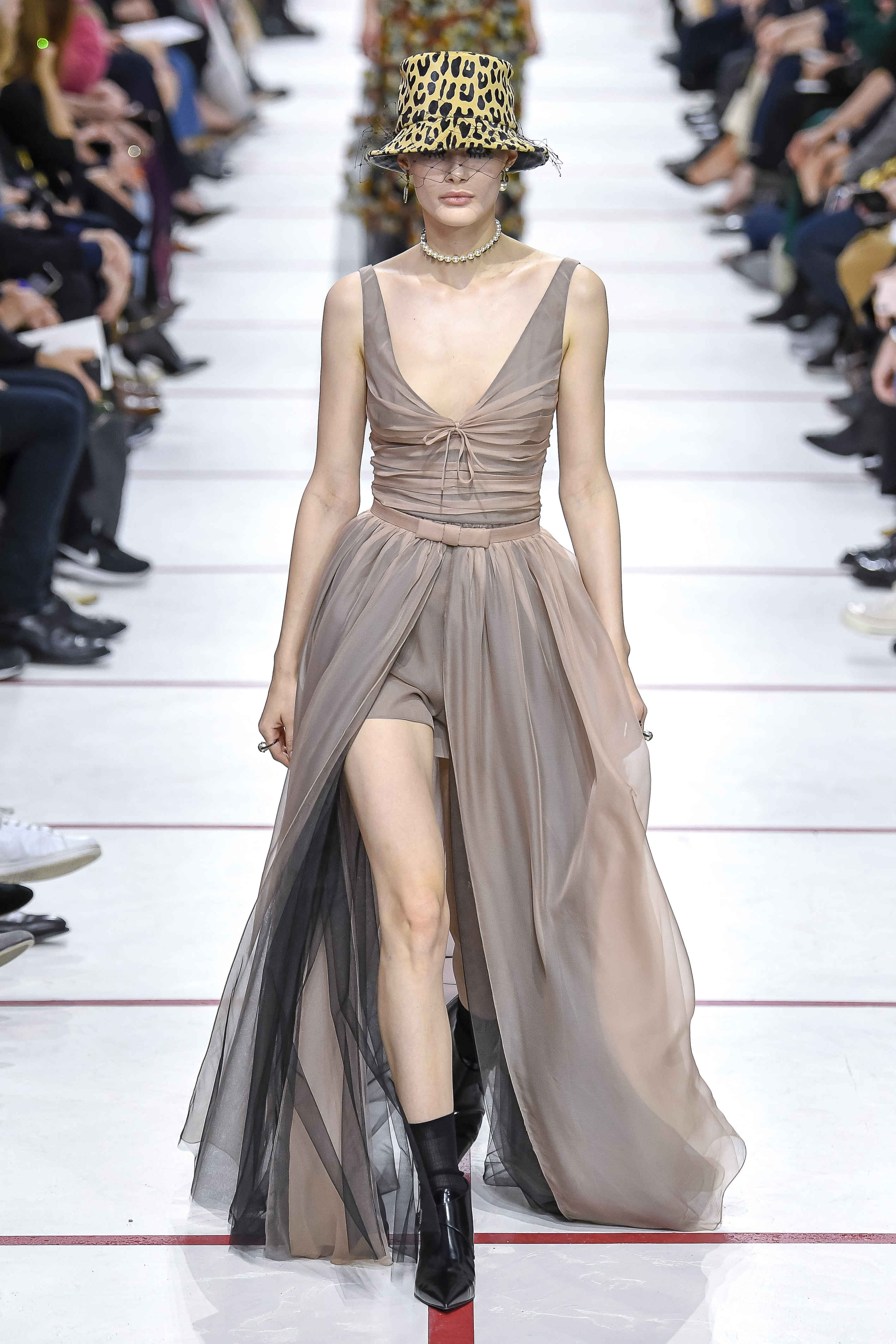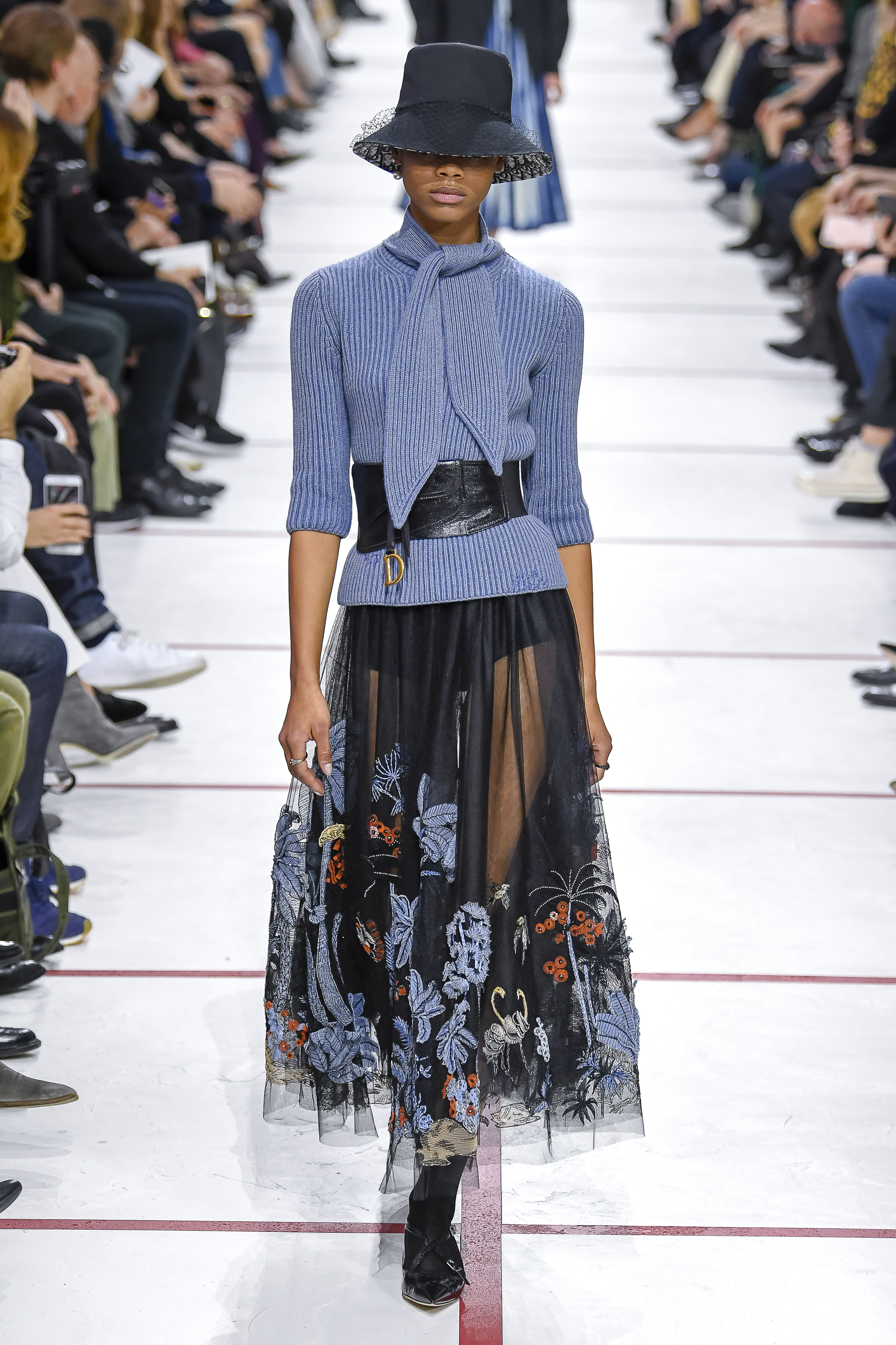 Αυτή τη φορά η συλλογή ήταν μια σαφής αναφορά στο New Look του Dior. Για όσους δεν το γνωρίζουν ο θρυλικός σχεδιαστής σύστησε στο κοινό αυτή τη σιλουέτα στα 1950s και ακριβώς μετά τον Β’ Παγκόσμιο Πόλεμο. Στενοί ώμοι, τονισμένη μέση και όγκος στο κάτω μέρος της, που επιτεύχθηκε με πολλά μέτρα ύφασμα. Στόχος αυτής της σιλουέτας ήταν να αναδείξει τη θηλυκότητα και να κάνει τις γυναίκες να νιώσουν και πάλι όμορφες. Δεν απέχει και πολύ δηλαδή από τον στόχο που έχει και σήμερα η Maria Grazia Chiuri.