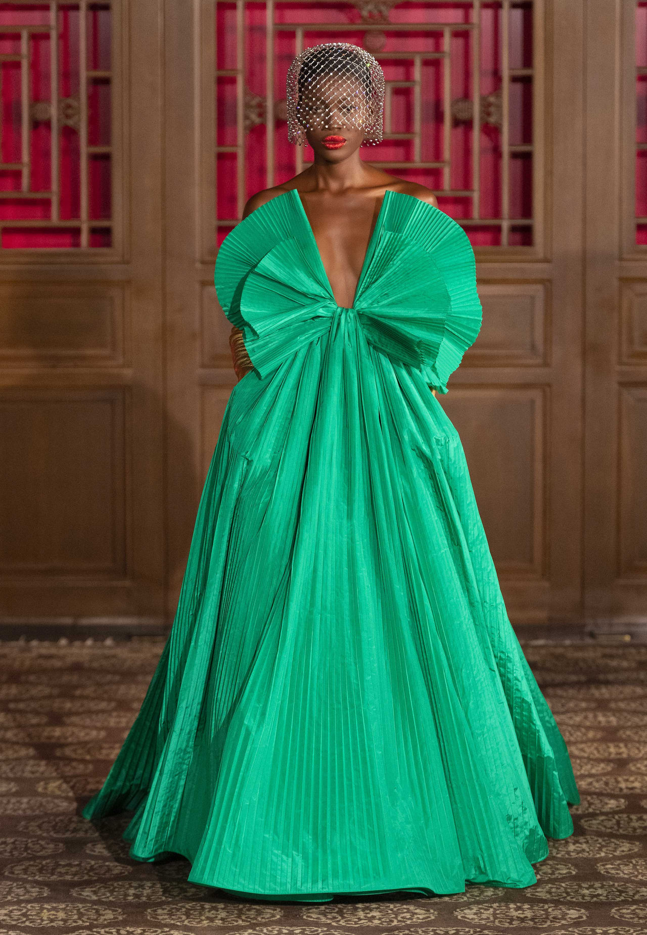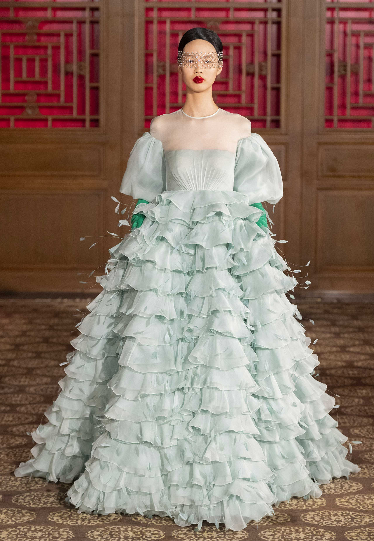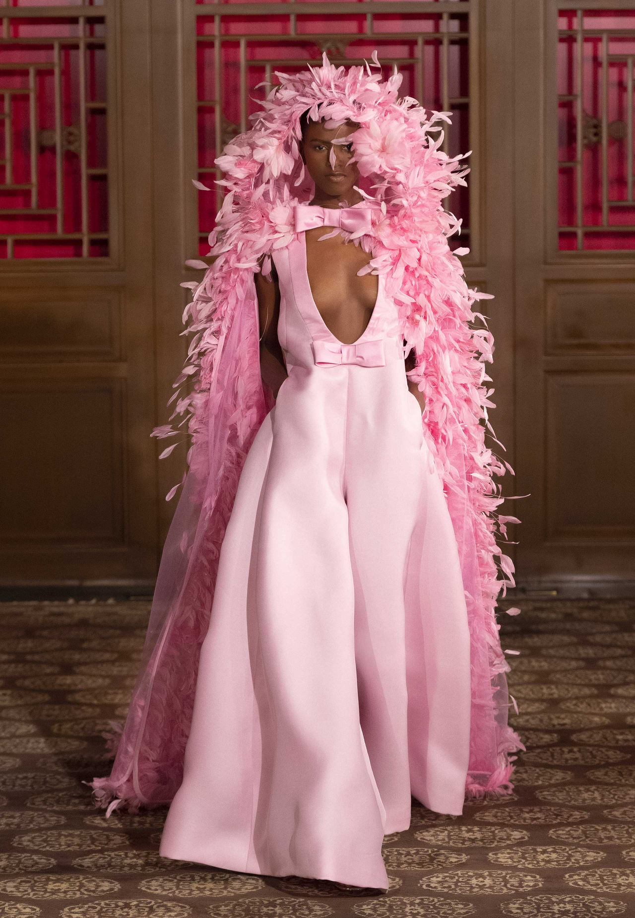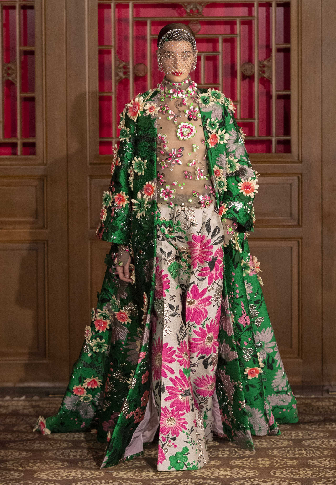 Αυτή τη φορά ο δημιουργός εμπνεύστηκε από την Αναγέννηση που τόσο αγαπάει και που ξεκίνησε άλλωστε από την Ιταλία. Εντυπωσιακά ball gowns και sheath dresses, ένα βέλο με πέρλες σε πολλές εκδοχές -από full face μέχρι φιόγκο- μπροκάρ και απλικέ στοιχεία, συνέθεσαν ένα μεγαλοπρεπές αποτέλεσμα που άλλοτε έμοιαζε με πίνακα ζωγραφικής και άλλοτε με παραμύθι μιας άλλης εποχής. Μοντέλα ντυμένα με φαρδιά παντελόνια και λάμψεις που παραπέμπουν στα 70s και 80s με την πρώτη ματιά και άλλα, καλυμμένα με λουλούδια και βολάν που έμοιαζαν με πλάσματα του δάσους δημιουργούσαν ένα ονειρικό σκηνικό. Όλα αυτά μαζί με βολάν, μετάξι, ταφτά, φιόγκους, απλικέ στοιχεία αλλά και αυτούς τους signature πια δραματικούς όγκους του Piccioli, φτιάχνουν αυτό το αποτέλεσμα που κάνει κάθε κριτική και συζήτηση να μοιάζει μάταιη και χωρίς νόημα.