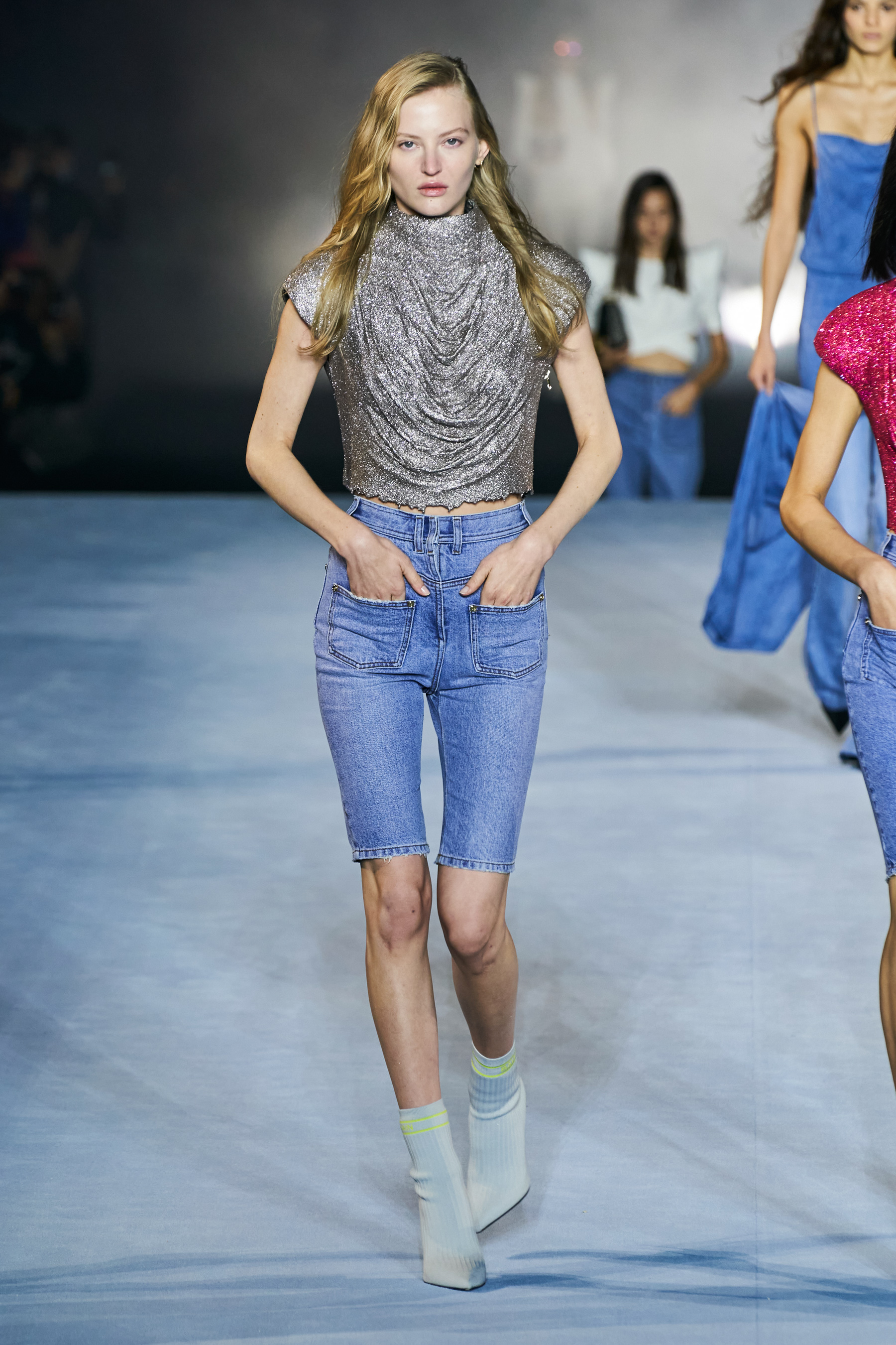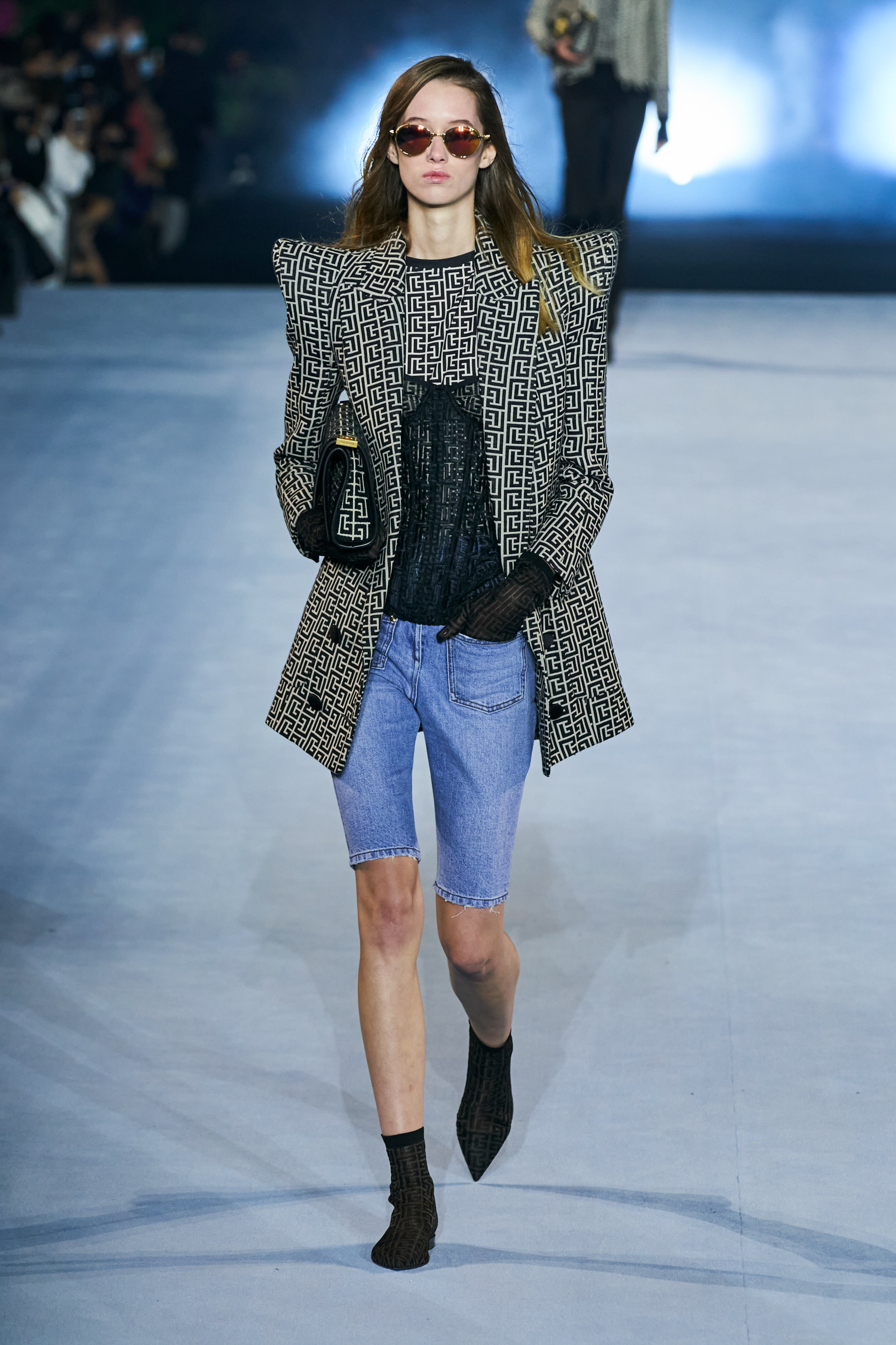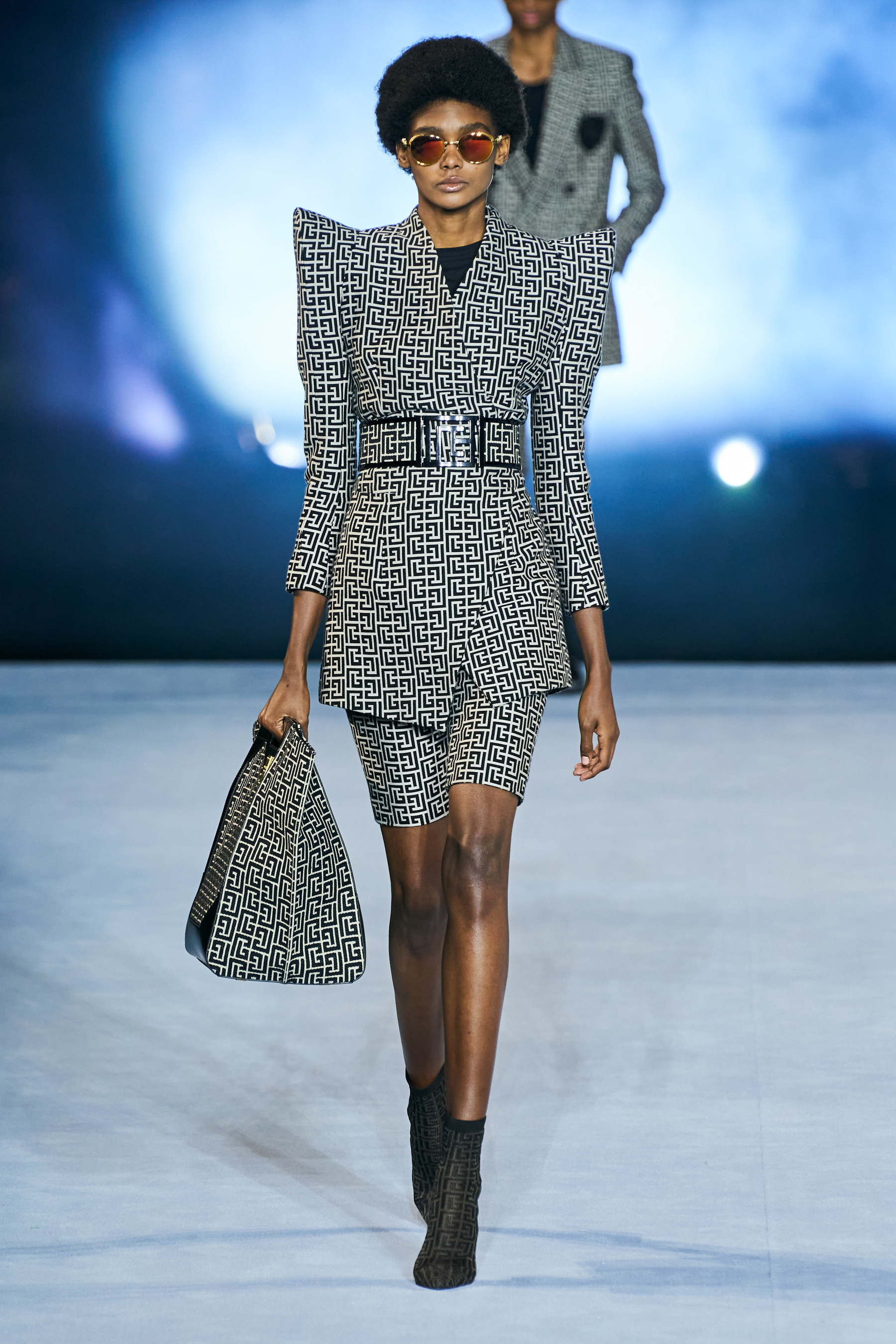 Ακολούθως, στη σκηνή και υπό τους ήχους του hit του Weekend "Blinding Lights", εμφανίστηκαν μοντέλα με κοστούμια σε έντονα φλούο χρώματα και έντονους γεωμετρικούς ώμους, ακολούθησαν τα μοντέλα με δημιουργίες στο απόλυτο γκρι, πάλι με χαρακτηριστικό τους μυτερούς ώμους στα τοπ και τα σακάκια, ενώ βασική ήταν και η παρουσία των βερμούδων και biker shorts σ' αυτό το σετ με outfits. Στα επόμενα group εντοπίζουμε πολλά denim κομμάτια - και ξανά βερμούδες σε denim αυτή τη φορά-, μαρινιέρες, sequin σακάκια, warp φούστες, κορσέ τοπ, δερμάτινα κοστούμια, κοστούμια σε navy blue, sequin φορέματα και two - piece evening σύνολα. Το monogram μοτίβο του οίκου συμμετέχει, βεβαίως, σε πολλά από τα outfits που προτείνει ο σχεδιαστής και μάλιστα, σε μοντέρνα σακάκια με έντονους ώμους που έχει συνδυάσει υπέροχα με τζιν παντελόνια ή βερμούδες.