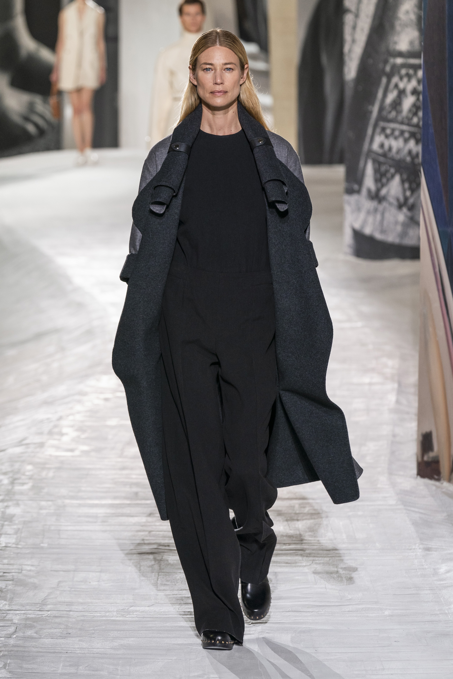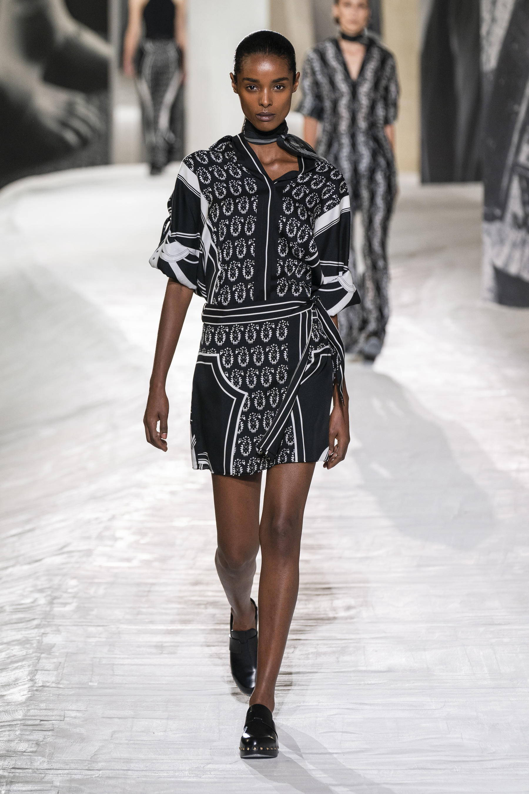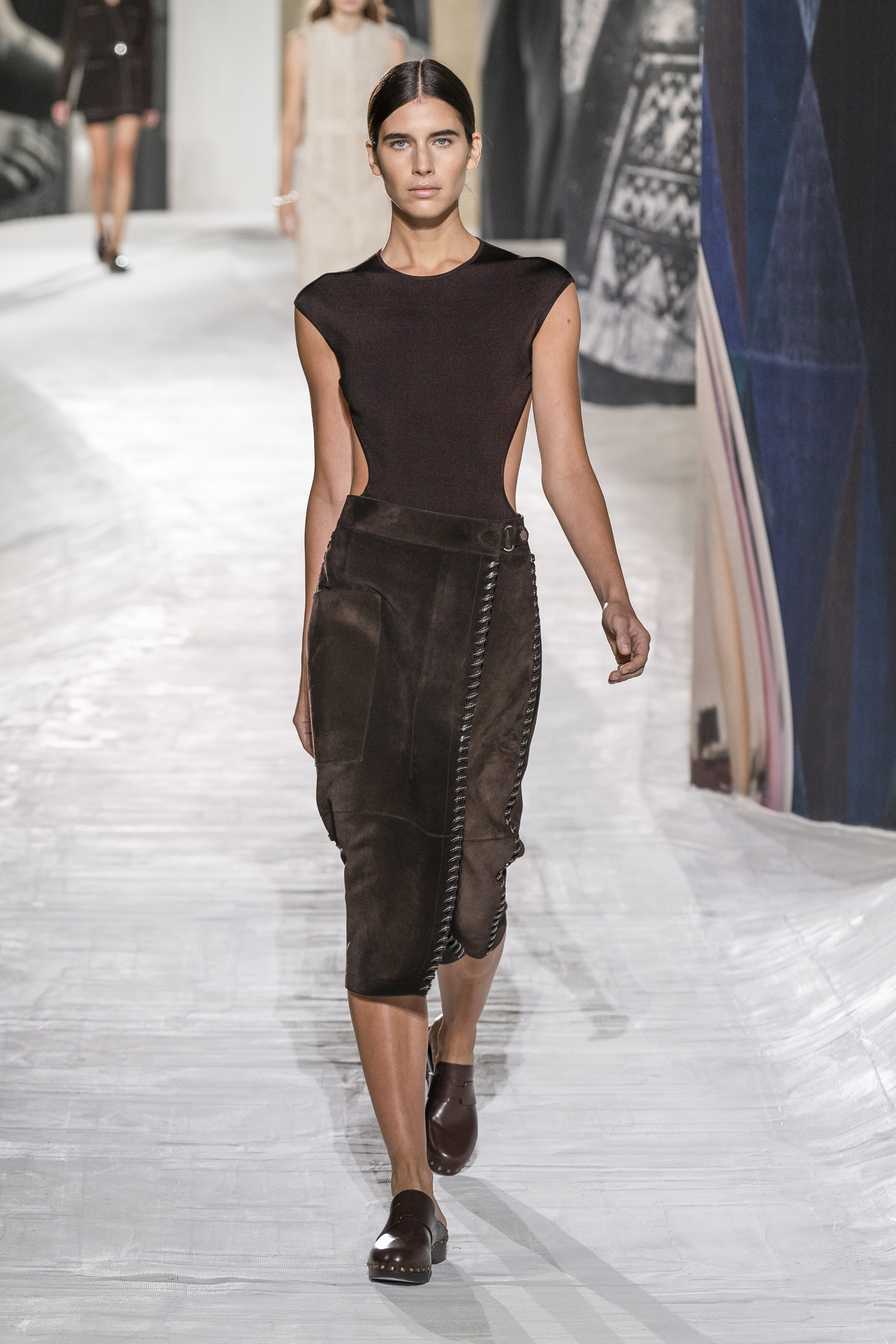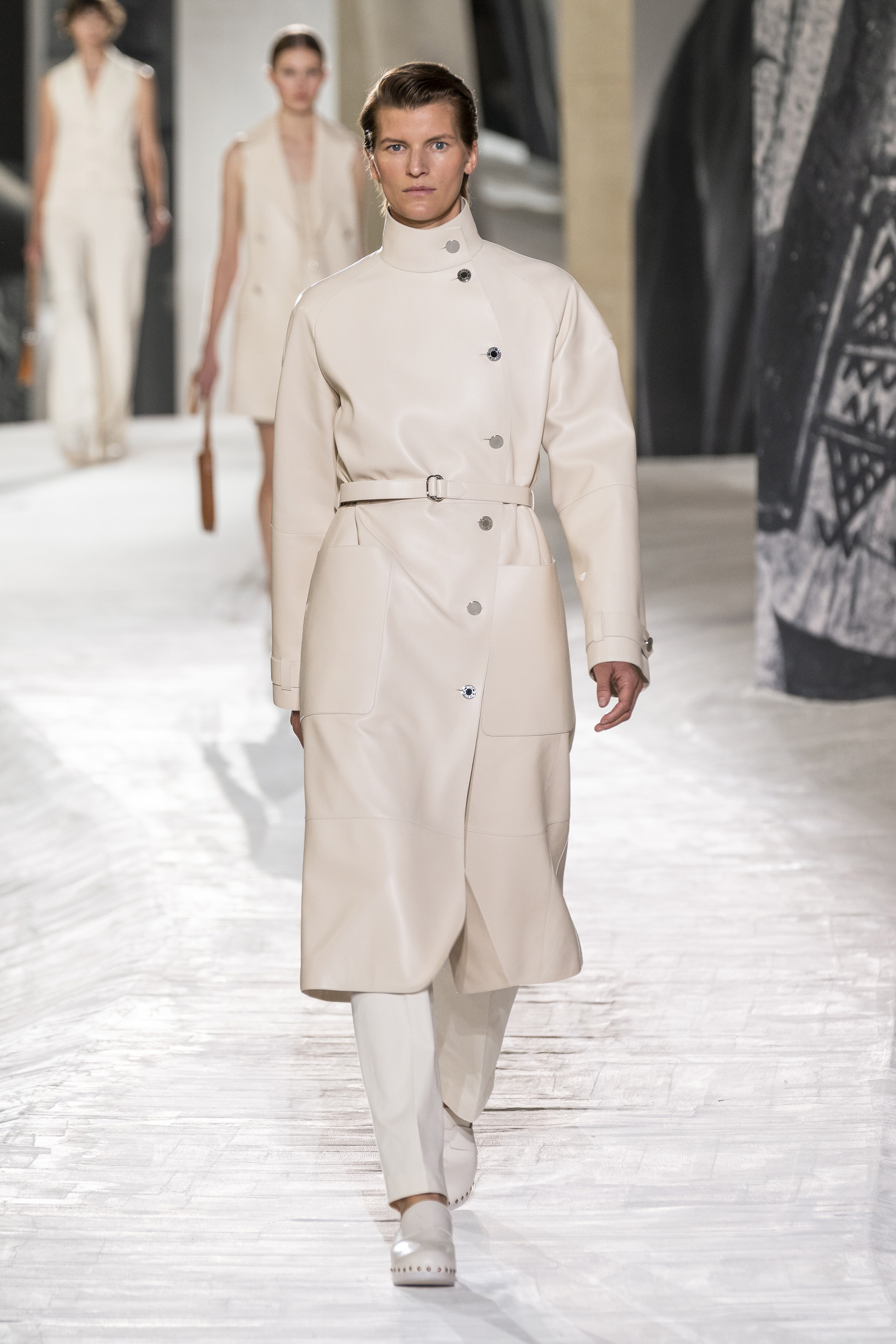 Οι μονοχρωμίες είχαν για άλλη μια φορά τη τιμητική τους, αποδεικνύοντας πως η Vanhee-Cybulski παραμένει πιστή στις αρχές του οίκου. Το ταμπά- σήμα κατατεθέν του Hermès- το μπορντό και το απαλό γαλάζιο συνάντησαν την αντίθεση του λευκού με το μαύρο, το κρεμ και το μπεζ, ενώ ένα από τα highlights της συλλογής είναι τα διάτρητα φορέματα αλλά και τα παλτό που στο γιακά είχαν ραμμένα μαντήλια τα οποία έδεναν είτε στο μπροστινό είτε στο πίσω μέρος του λαιμού.