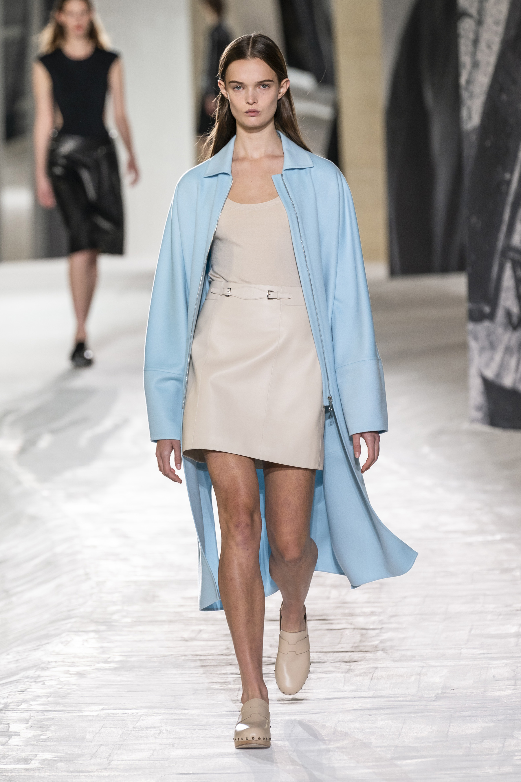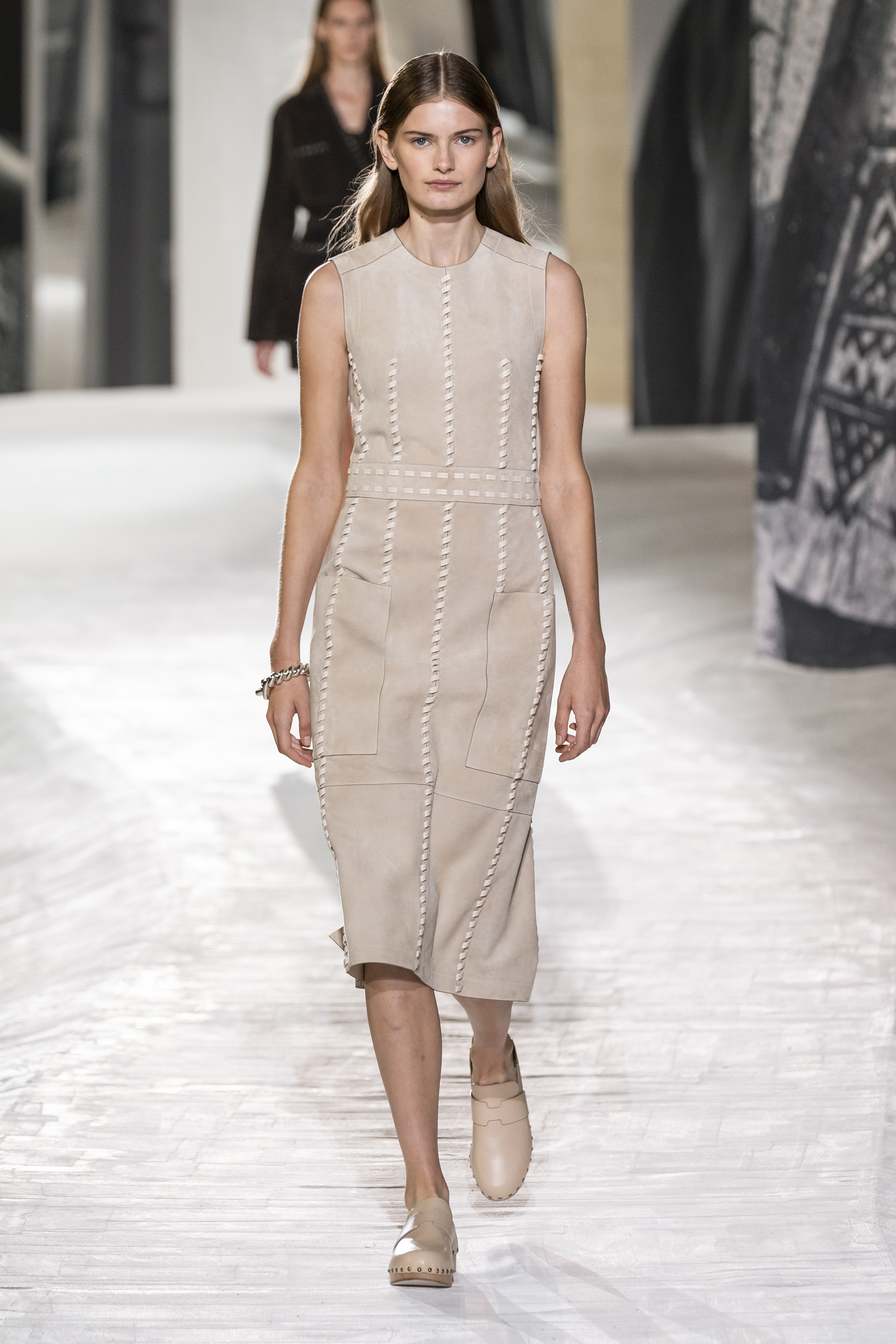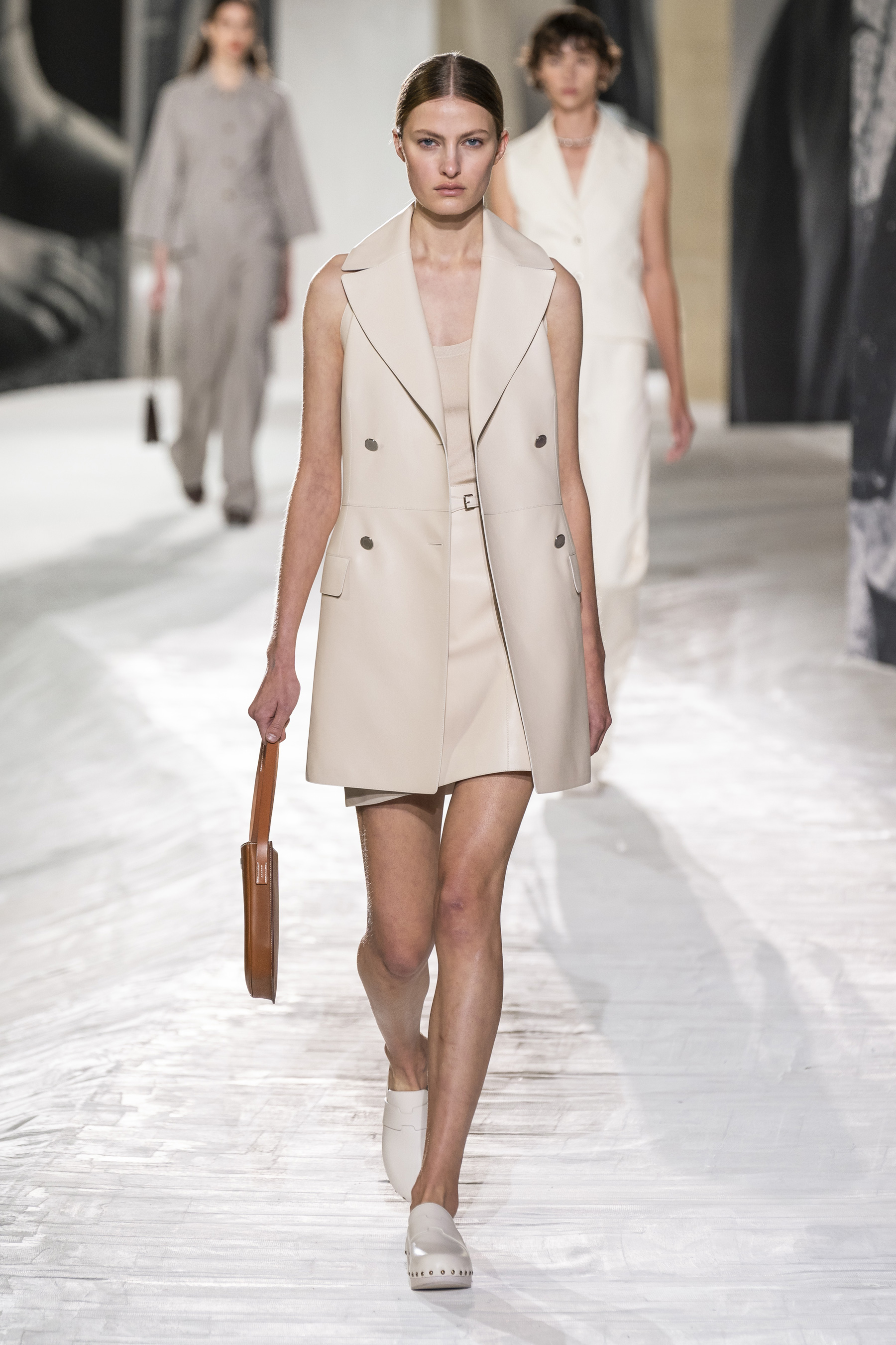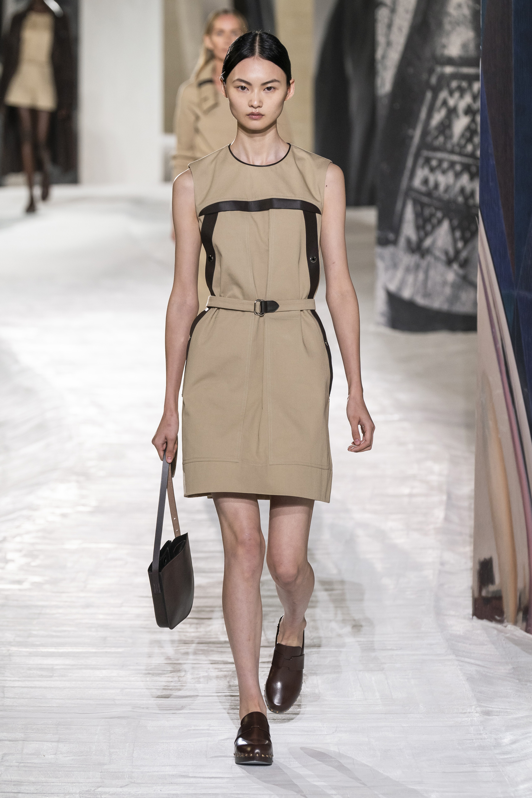 Οι μονοχρωμίες είχαν για άλλη μια φορά τη τιμητική τους, αποδεικνύοντας πως η Vanhee-Cybulski παραμένει πιστή στις αρχές του οίκου. Το ταμπά- σήμα κατατεθέν του Hermès- το μπορντό και το απαλό γαλάζιο συνάντησαν την αντίθεση του λευκού με το μαύρο, το κρεμ και το μπεζ, ενώ ένα από τα highlights της συλλογής είναι τα διάτρητα φορέματα αλλά και τα παλτό που στο γιακά είχαν ραμμένα μαντήλια τα οποία έδεναν είτε στο μπροστινό είτε στο πίσω μέρος του λαιμού.