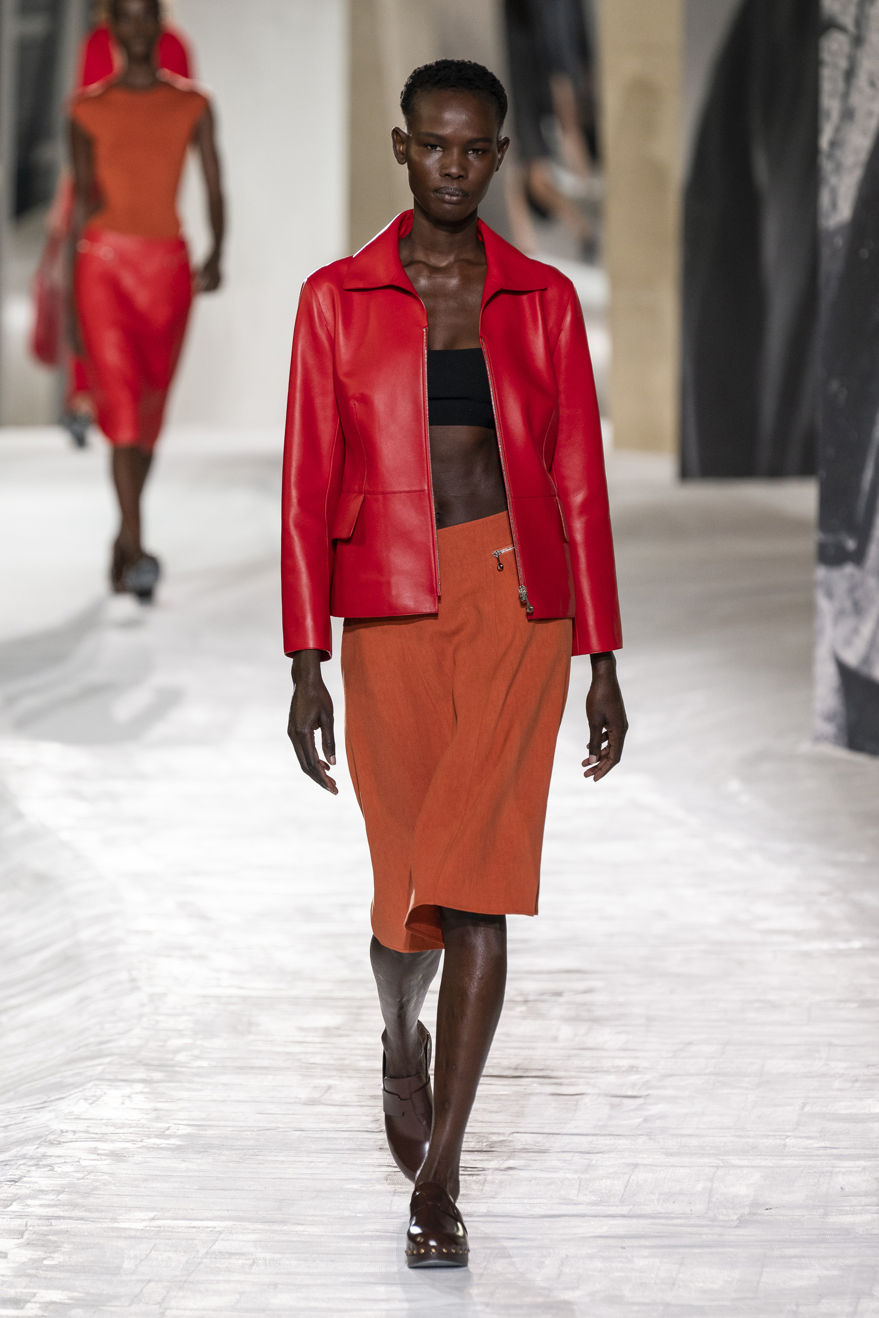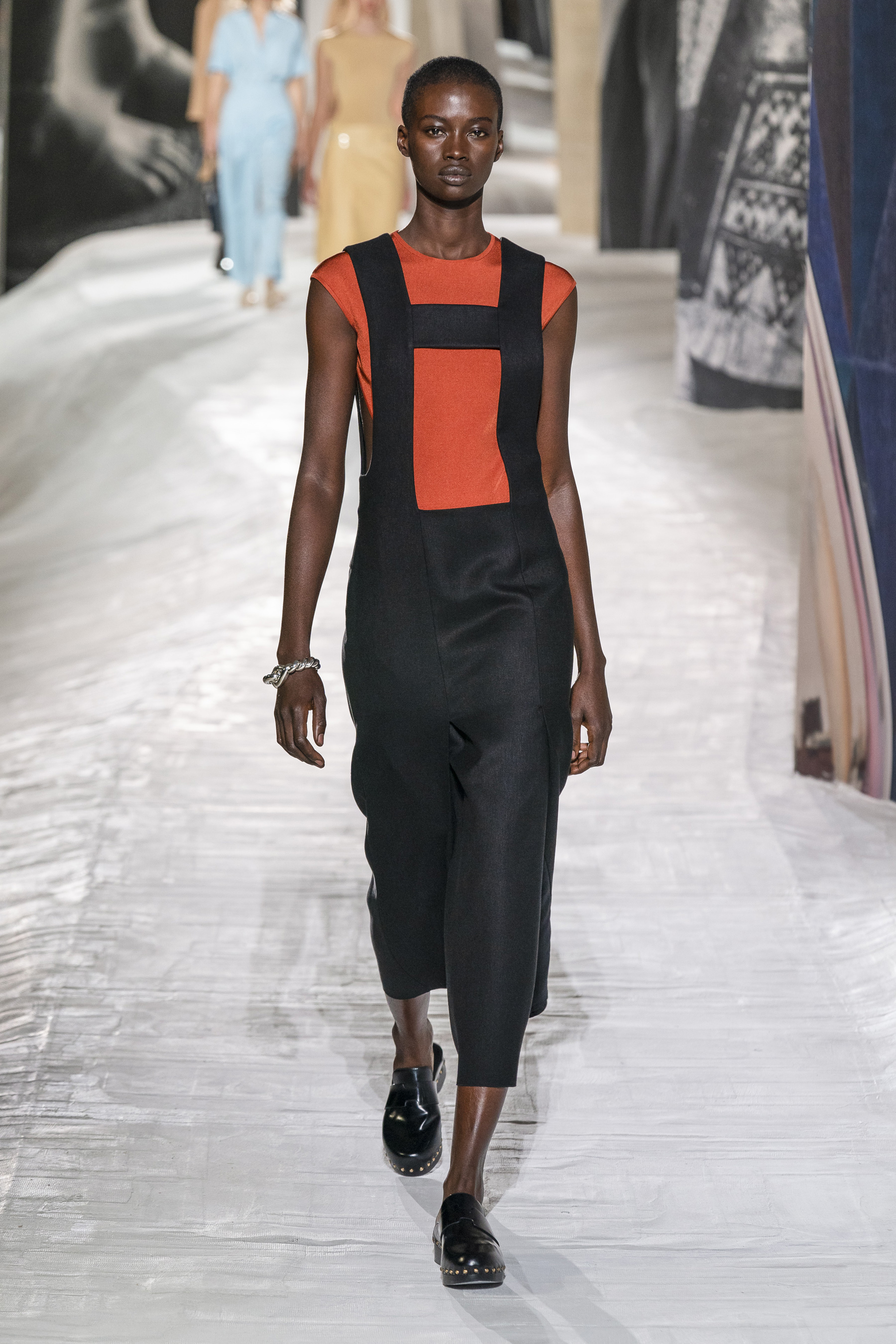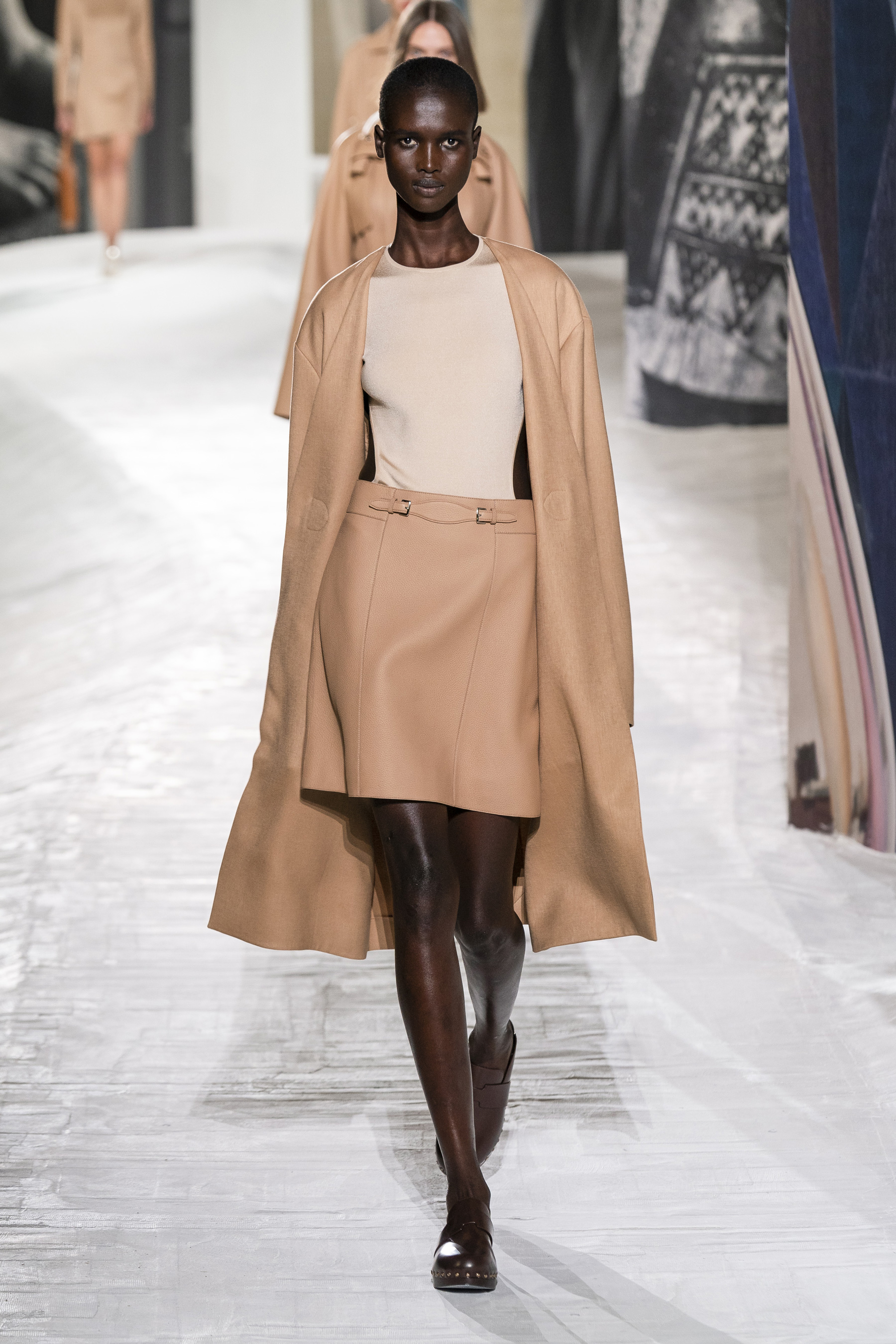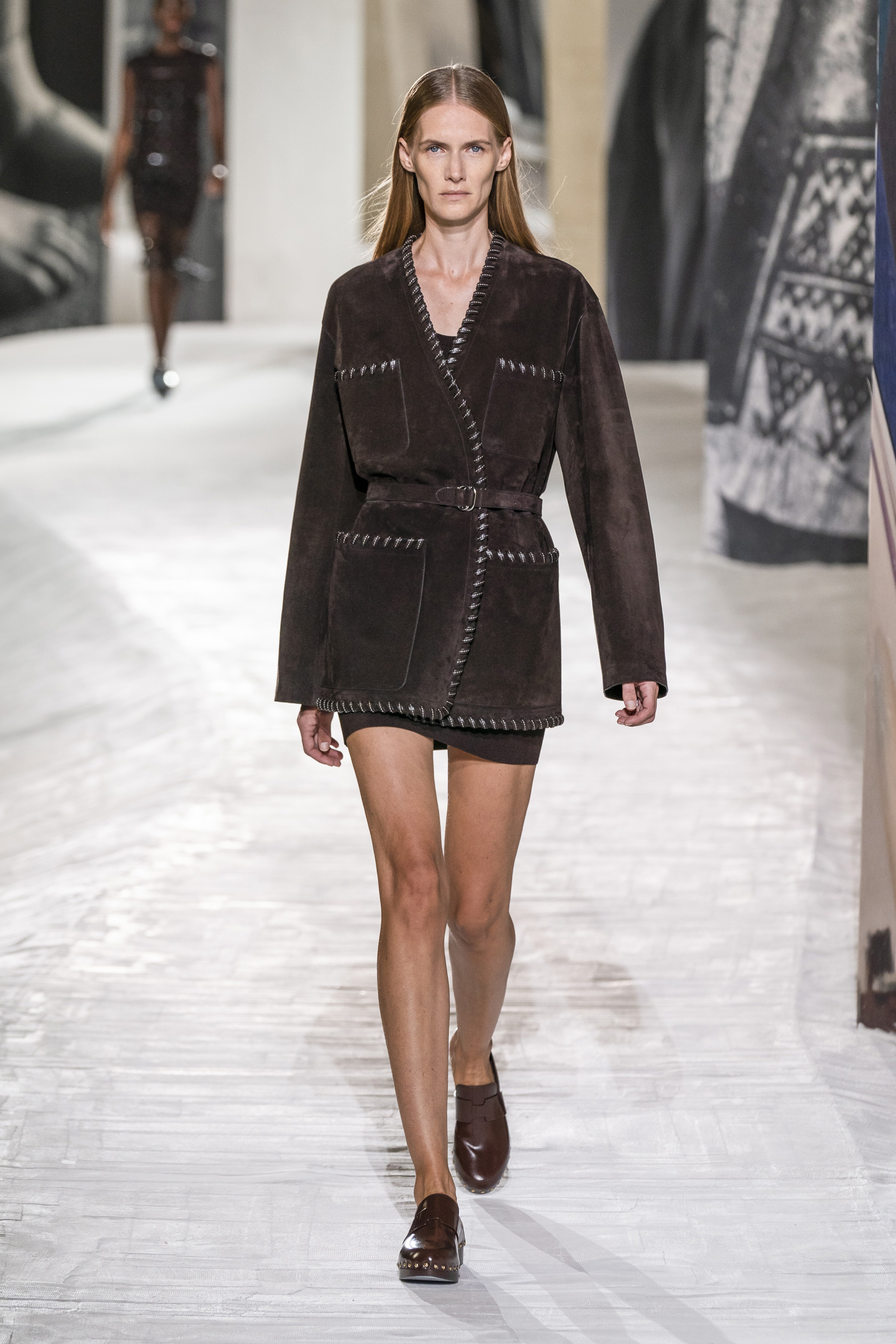 Οι μονοχρωμίες είχαν για άλλη μια φορά τη τιμητική τους, αποδεικνύοντας πως η Vanhee-Cybulski παραμένει πιστή στις αρχές του οίκου. Το ταμπά- σήμα κατατεθέν του Hermès- το μπορντό και το απαλό γαλάζιο συνάντησαν την αντίθεση του λευκού με το μαύρο, το κρεμ και το μπεζ, ενώ ένα από τα highlights της συλλογής είναι τα διάτρητα φορέματα αλλά και τα παλτό που στο γιακά είχαν ραμμένα μαντήλια τα οποία έδεναν είτε στο μπροστινό είτε στο πίσω μέρος του λαιμού.