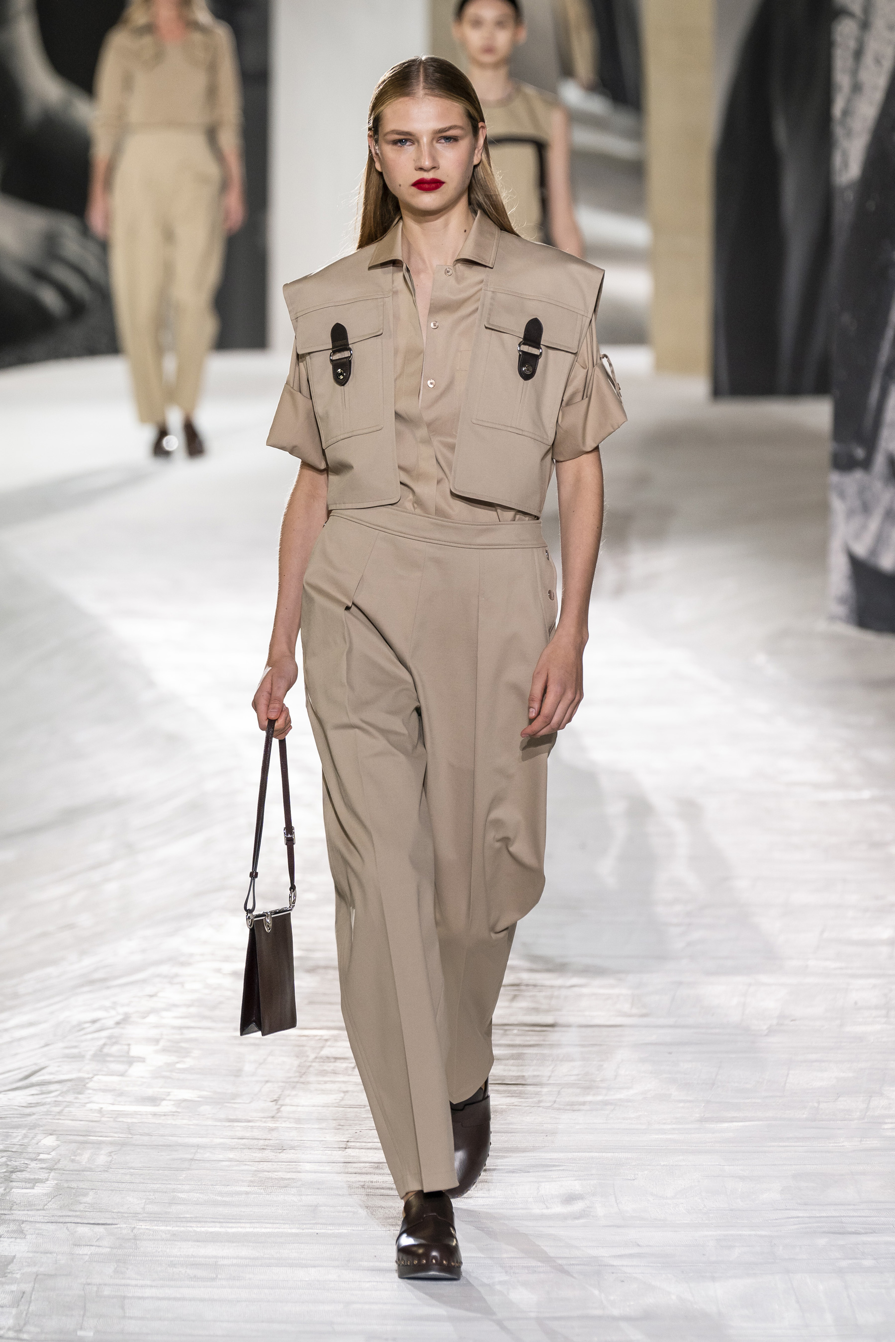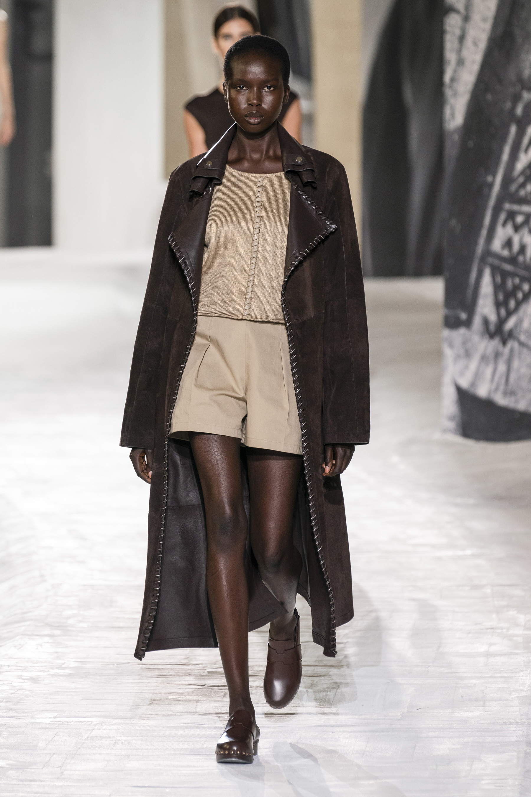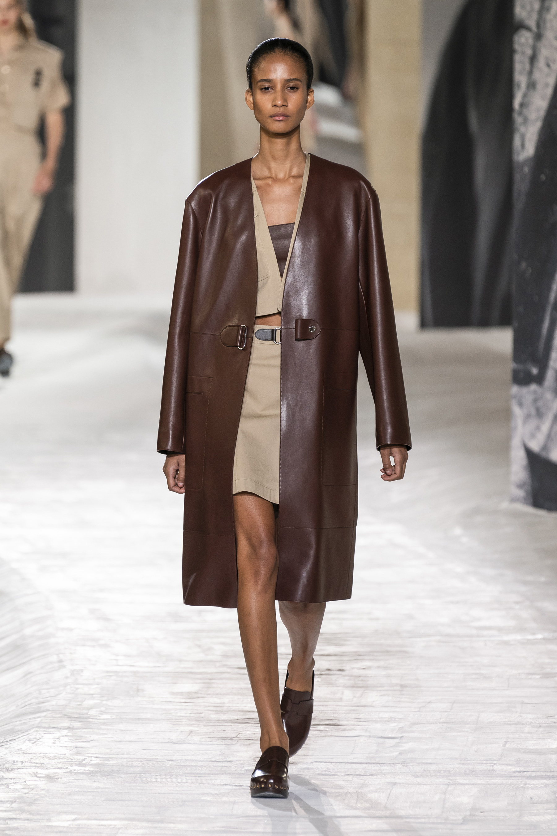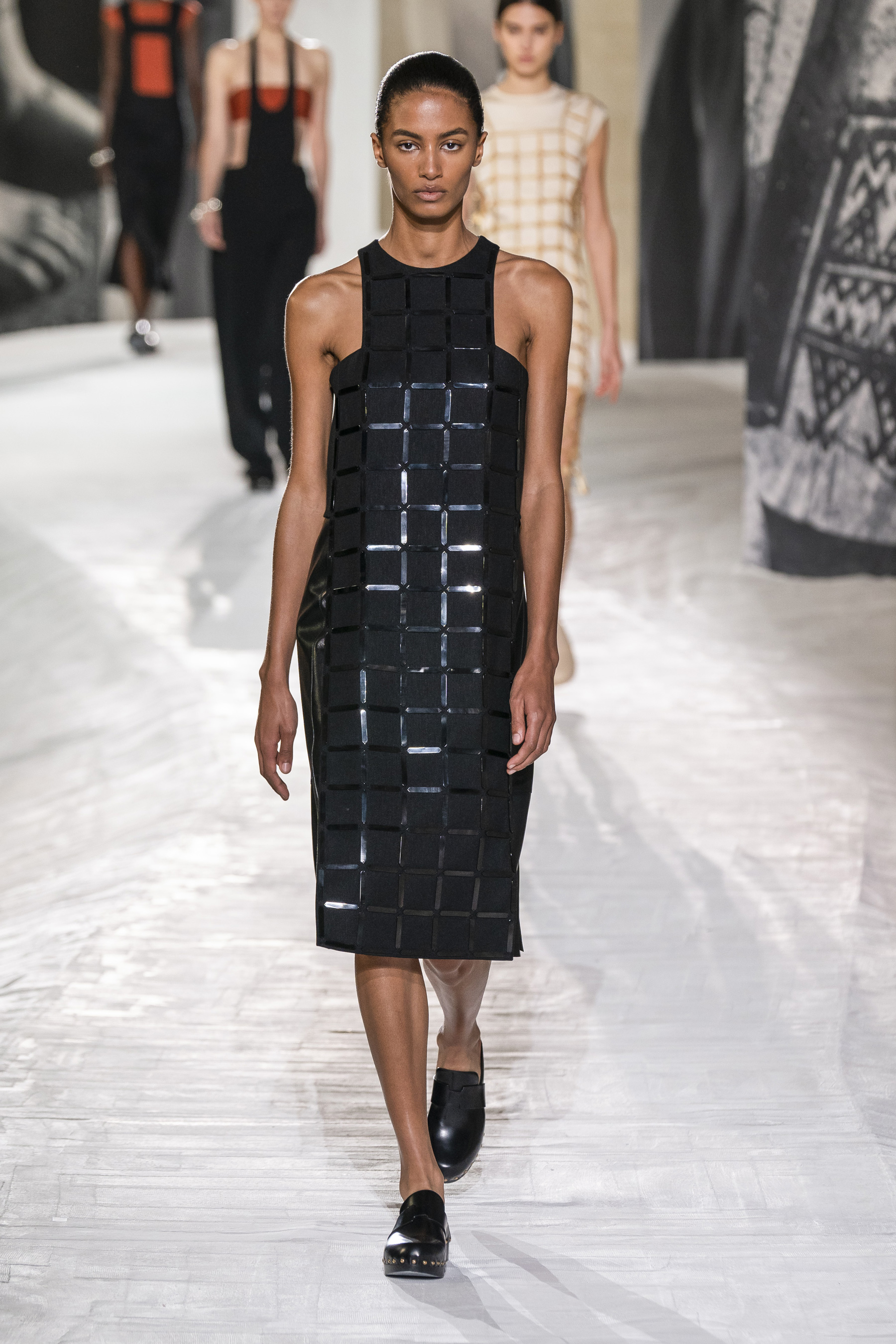Οι μονοχρωμίες είχαν για άλλη μια φορά τη τιμητική τους, αποδεικνύοντας πως η Vanhee-Cybulski παραμένει πιστή στις αρχές του οίκου. Το ταμπά- σήμα κατατεθέν του Hermès- το μπορντό και το απαλό γαλάζιο συνάντησαν την αντίθεση του λευκού με το μαύρο, το κρεμ και το μπεζ, ενώ ένα από τα highlights της συλλογής είναι τα διάτρητα φορέματα αλλά και τα παλτό που στο γιακά είχαν ραμμένα μαντήλια τα οποία έδεναν είτε στο μπροστινό είτε στο πίσω μέρος του λαιμού.