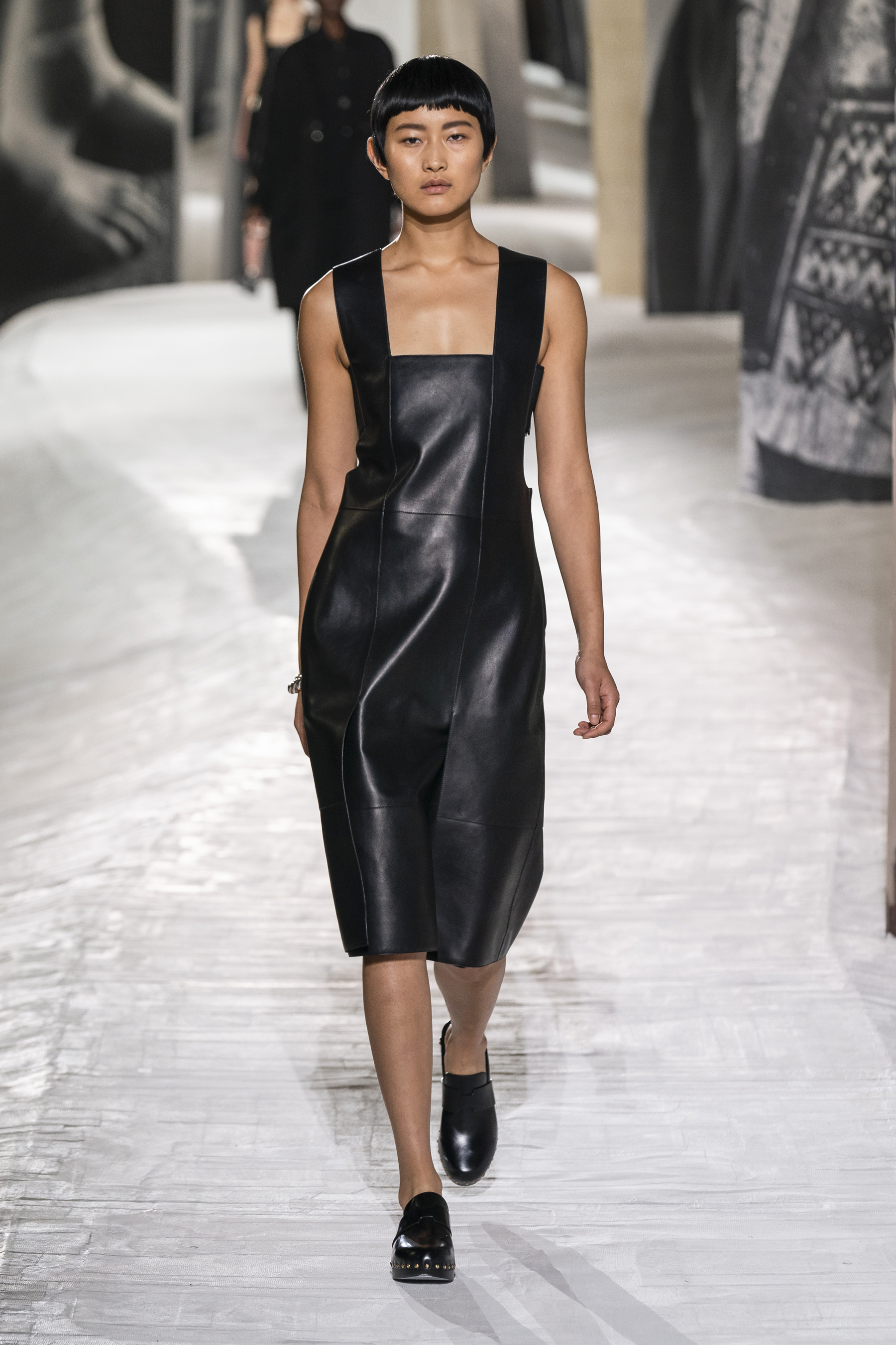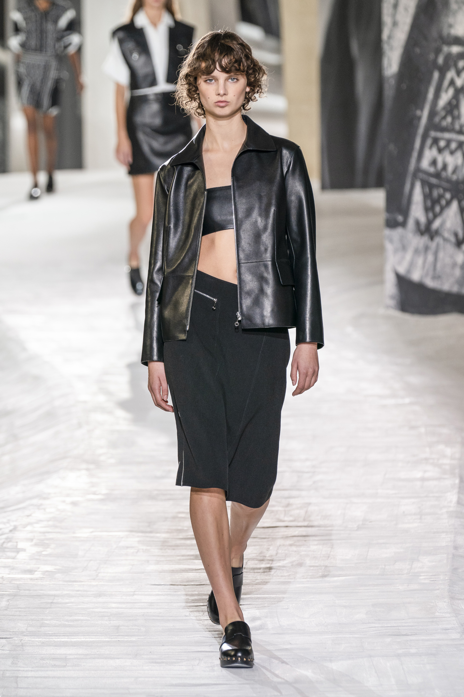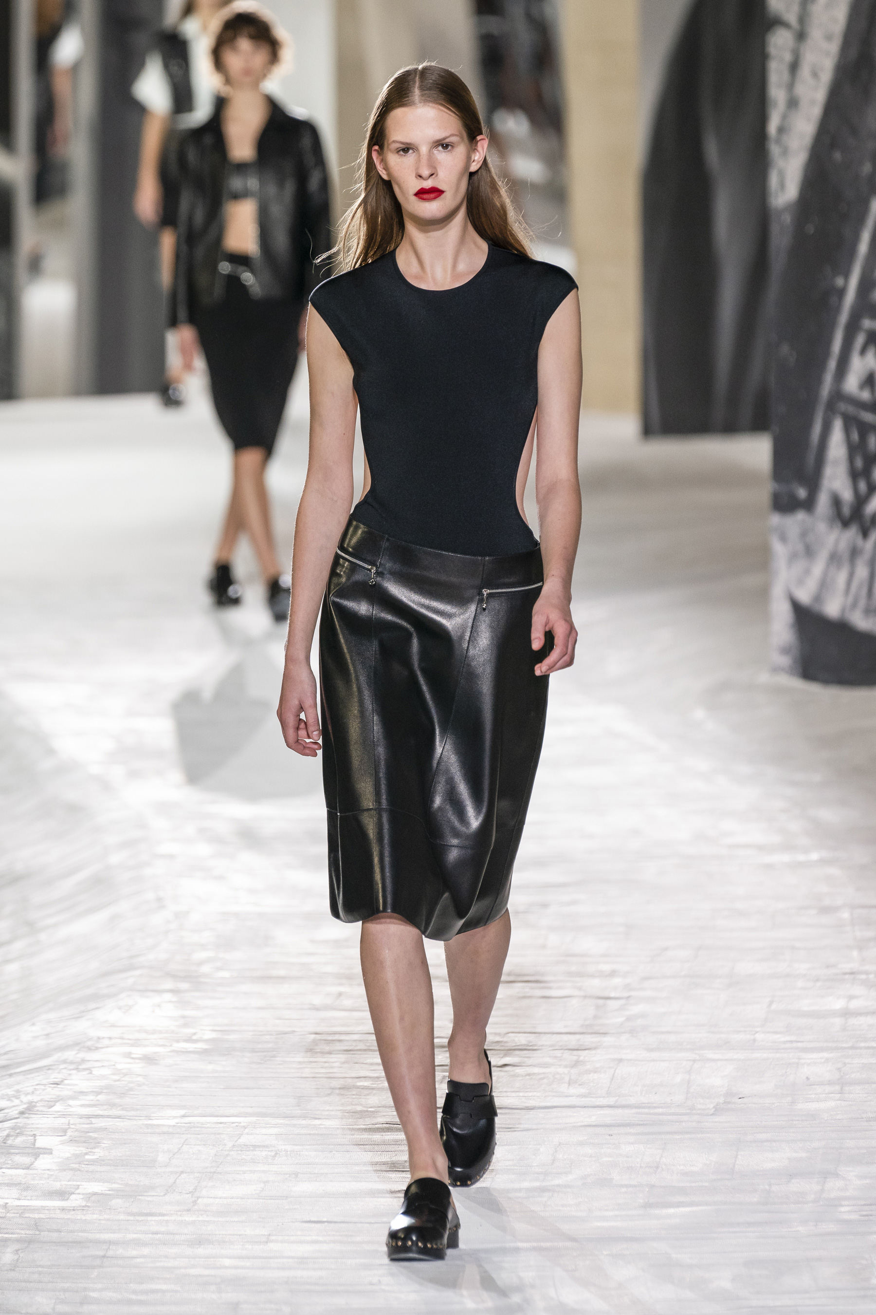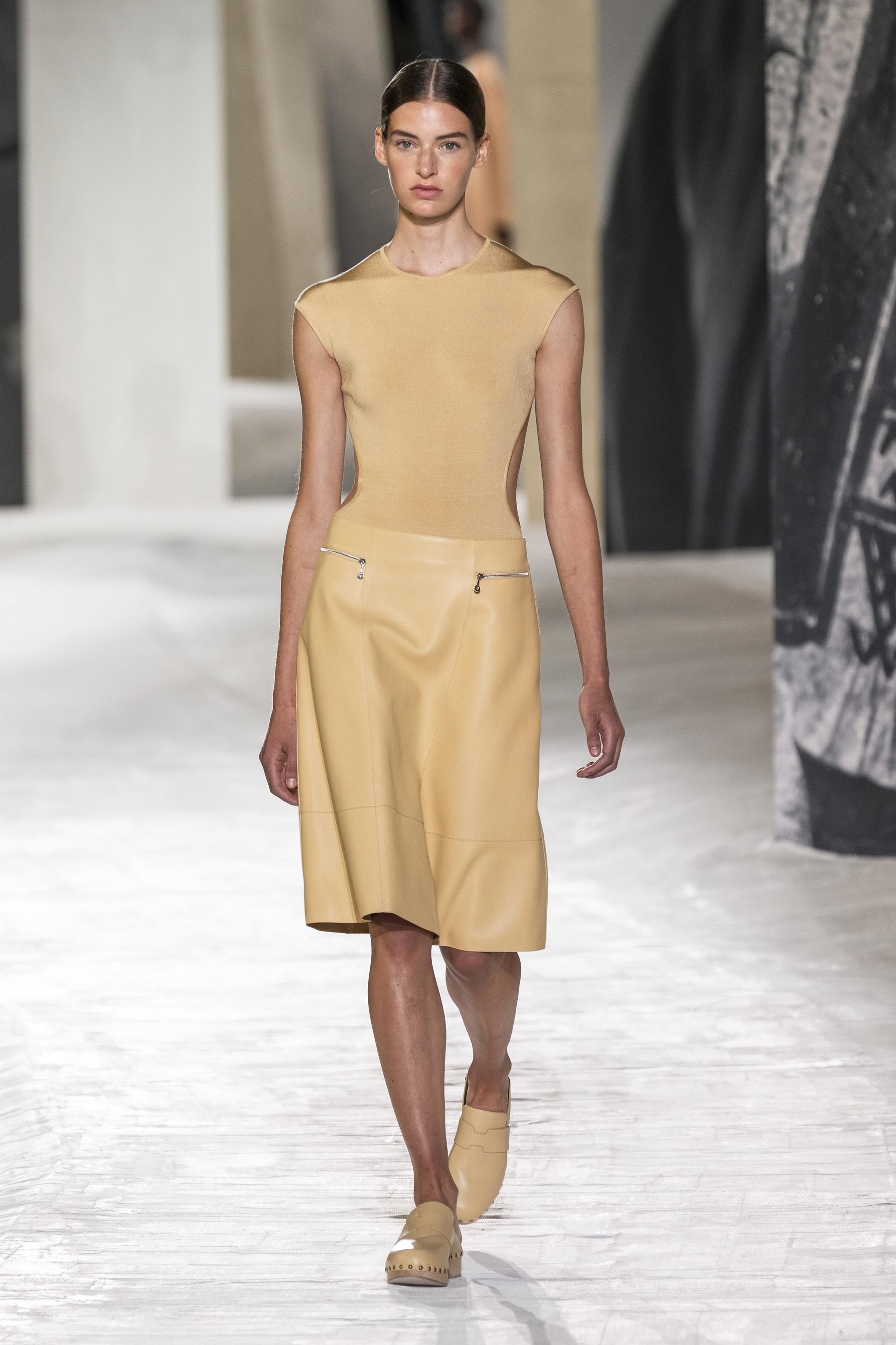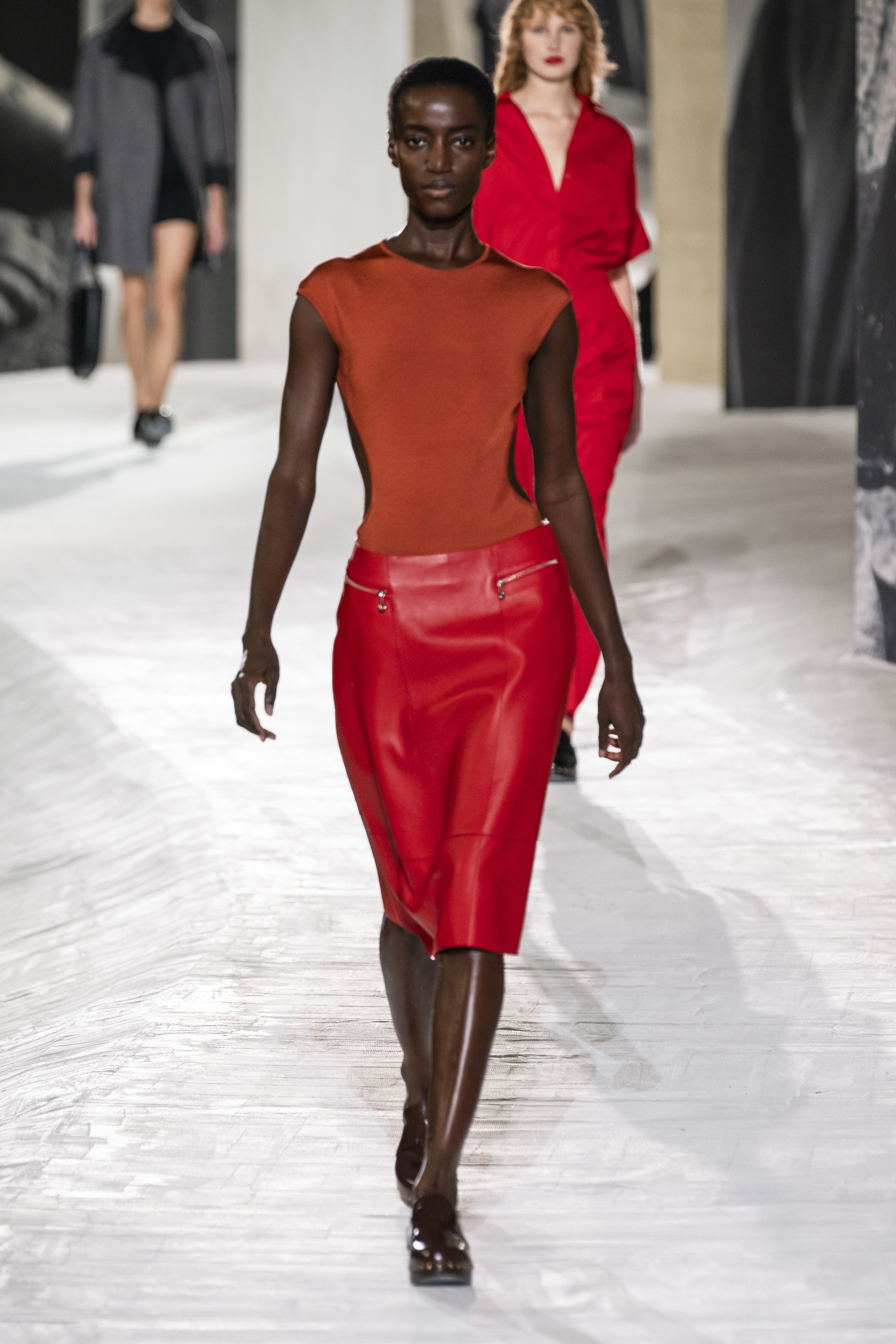 Φυσικά, πρωταγωνιστικό ρόλο είχε το μαλακό δέρμα που είδαμε σε φούστες σε γραμμή άλφα, γιλέκα, πανωφόρια, ολόσωμες φόρμες, αλλά και σε παπούτσια και τσάντες. Πλεκτά φορέματα αλλά και bodies που έμοιαζαν με μαγιό είχαν αναφορές στην αρχαία ελληνική τέχνη της κεραμοποιίας, ενώ ακόμα και το σκηνικό, όπου τα μοντέλα στέκονταν ακίνητα στην αρχή του show, έμοιαζε με φόρο τιμής σε αρχαιοελληνικούς μισογκρεμισμένους ναούς.